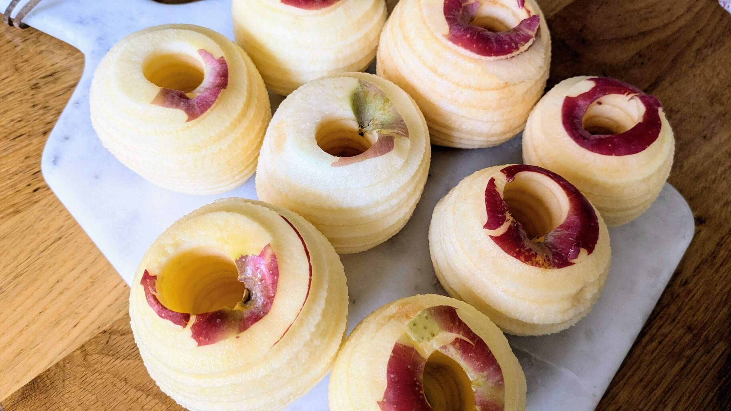 First, peel, quarter and slice the apples. The thinner you slice them, the less solid apples you’ll have in the final dish. I use this peeler/corer/slicer for my apples and love the results. Once they’ve been cored, peeled, and sliced, I halve each apple.