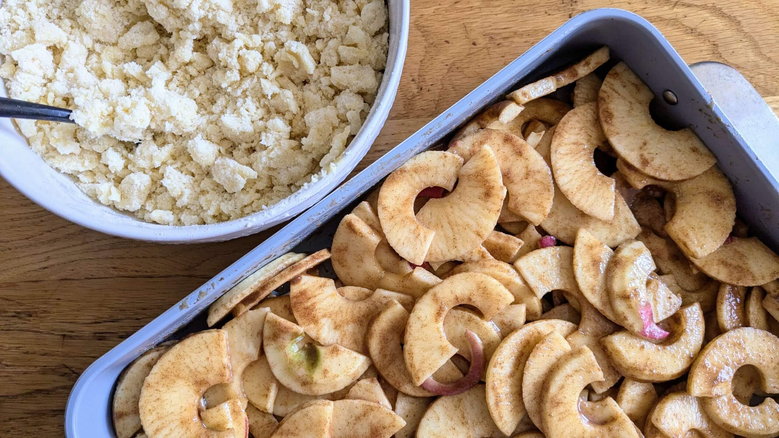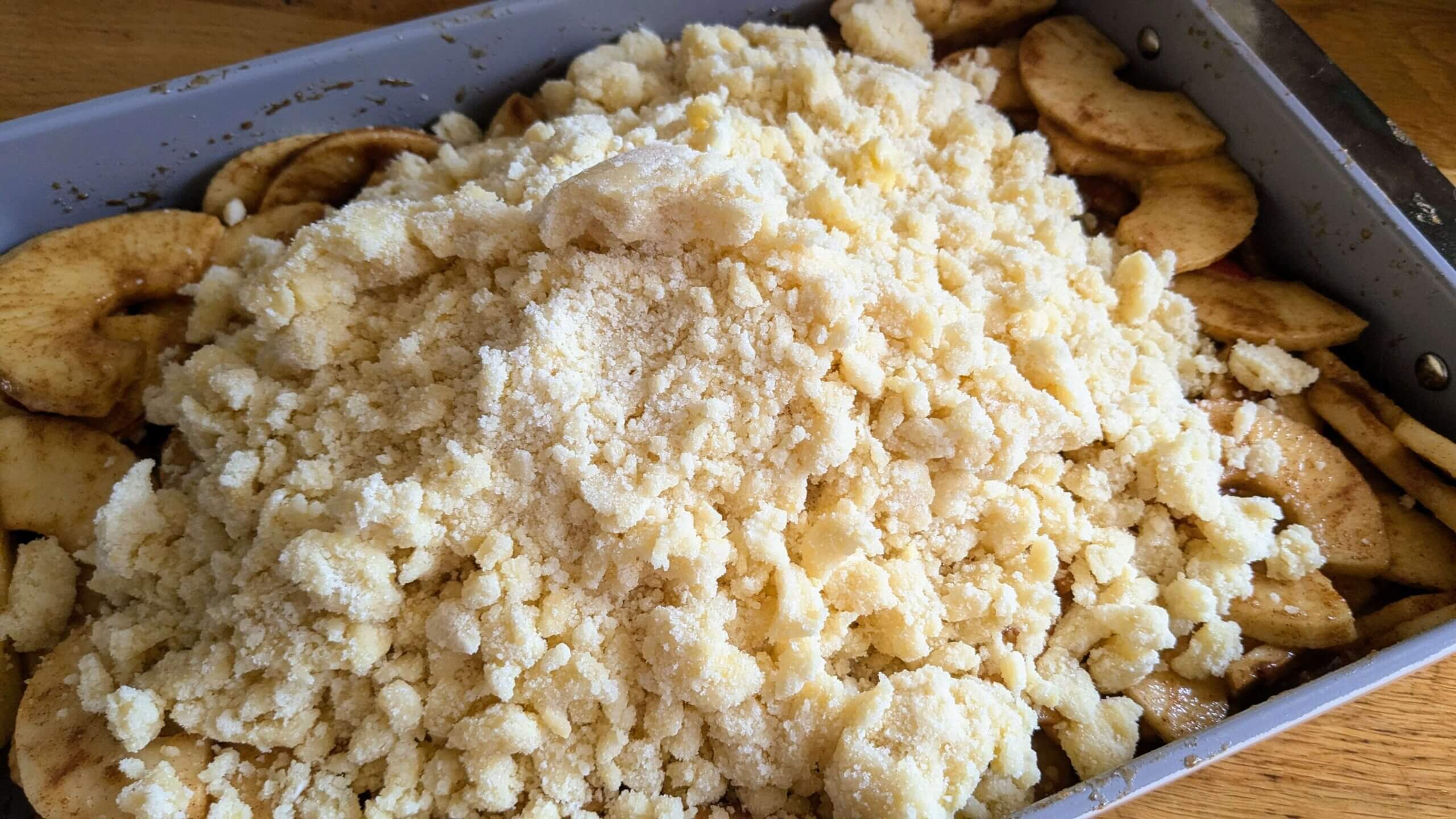 - In a bowl, combine all of the topping ingredients until thoroughly incorporated. Spread evenly over the apple topping.