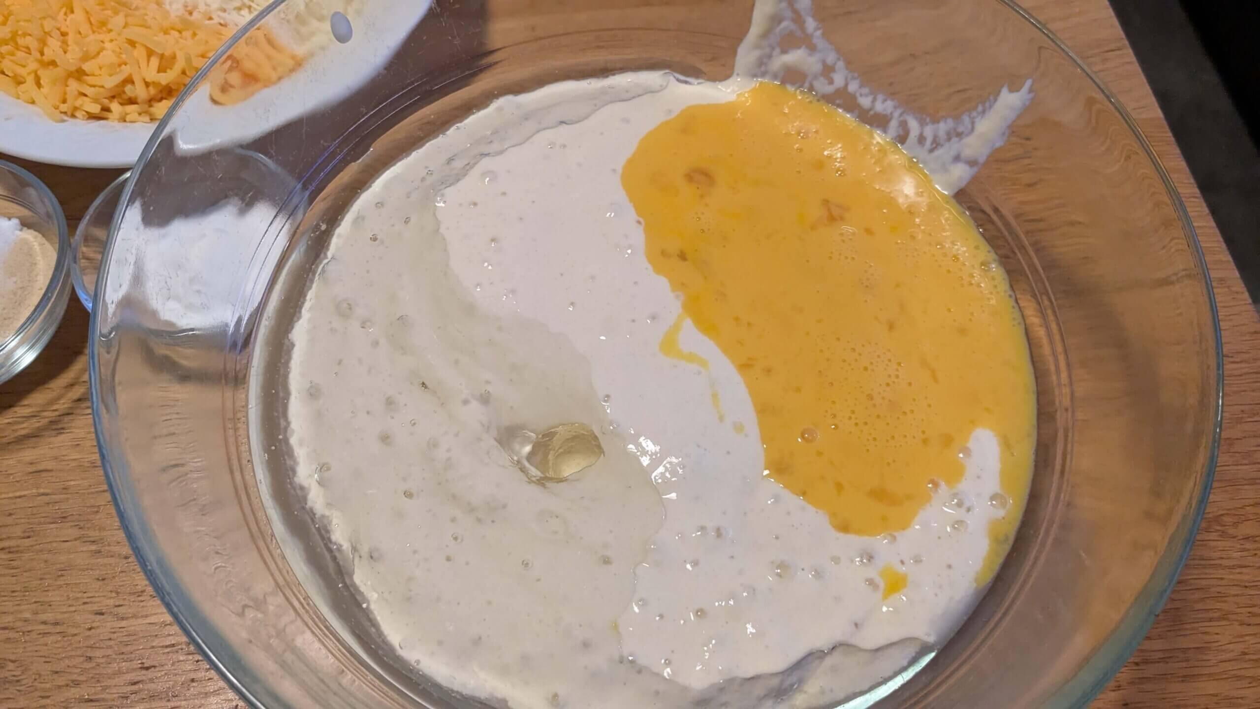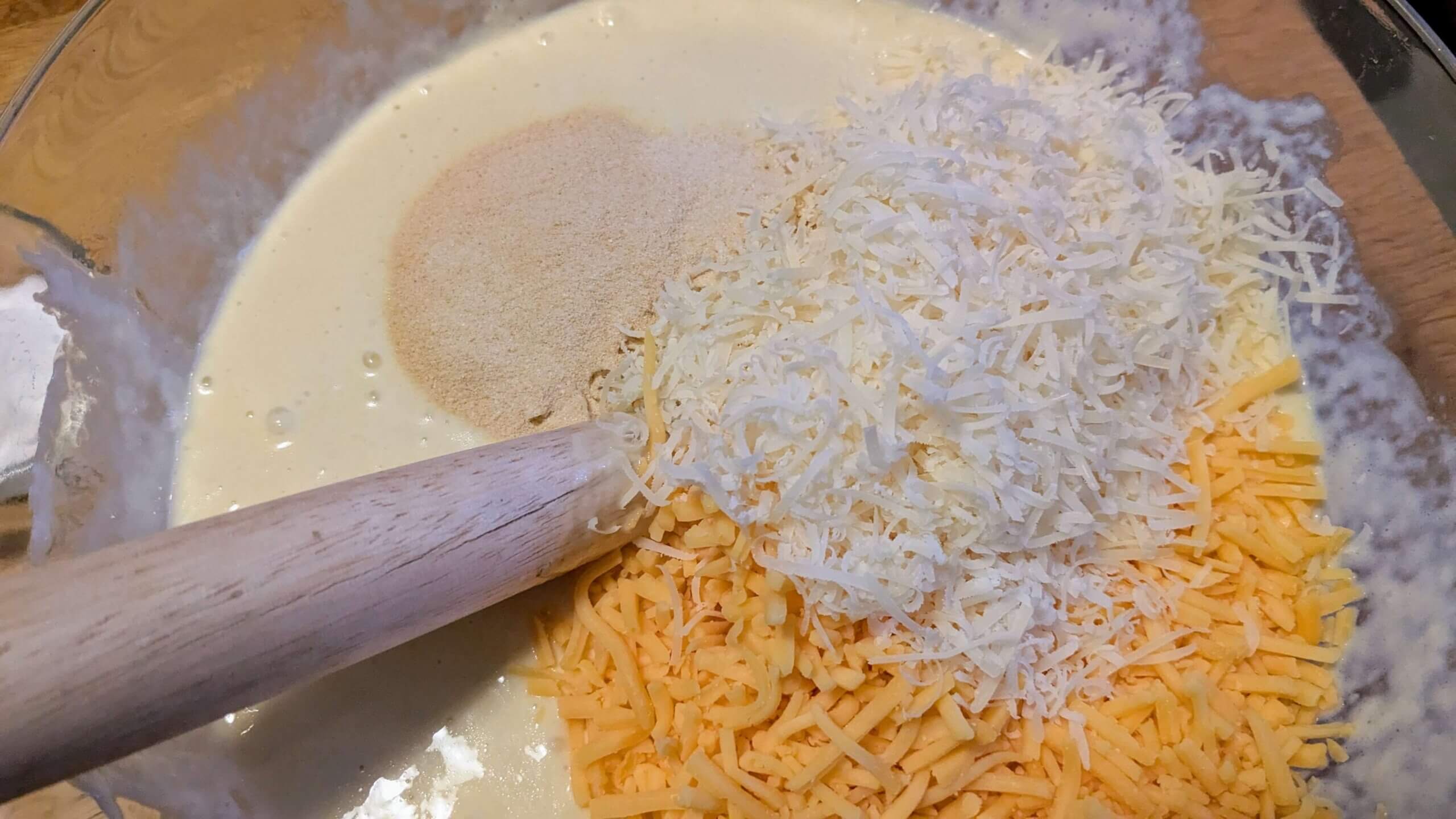In a large bowl, combine 4 cups of active sourdough starter, 4 eggs, and 8 tablespoons of melted butter or melted coconut oil. Whisk thoroughly. Next, add 2 teaspoons of salt, 1 tablespoon of garlic powder, 1 tablespoon of onion powder, 1 cup of shredded cheddar cheese, and 1 cup of shredded parmesan cheese.
