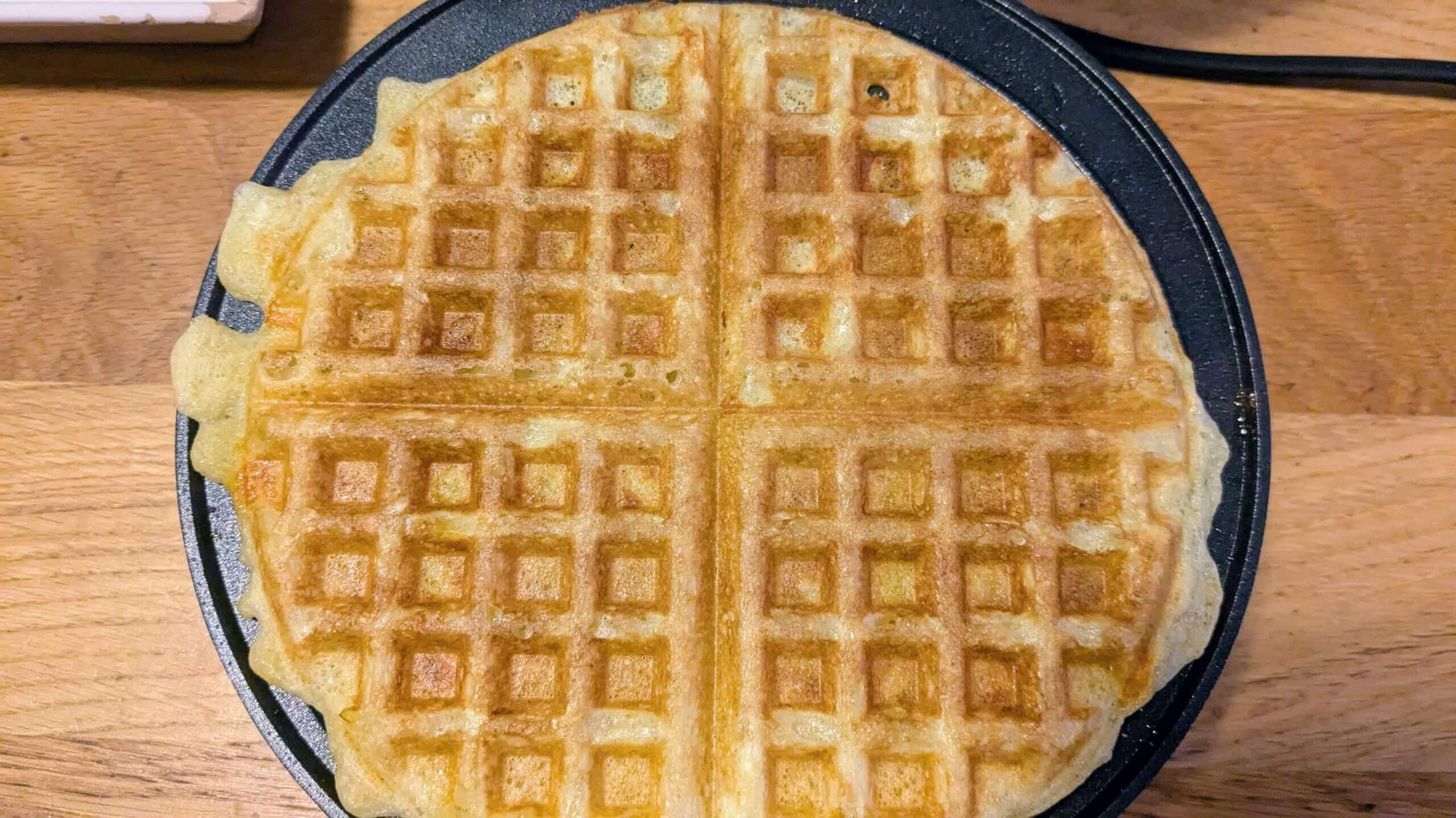 - Once the waffle iron is preheated, pour ½ cup of the batter into the iron. My waffle iron is smaller than others, so you may need to increase that to up to 1 full cup of batter into the iron. My waffle iron, being smaller, makes the waffle in about 3-4 minutes to my desired crispness. If your waffle iron is deeper and doesn’t have an automatic timer, it may need to cook for up to 7-8 minutes.