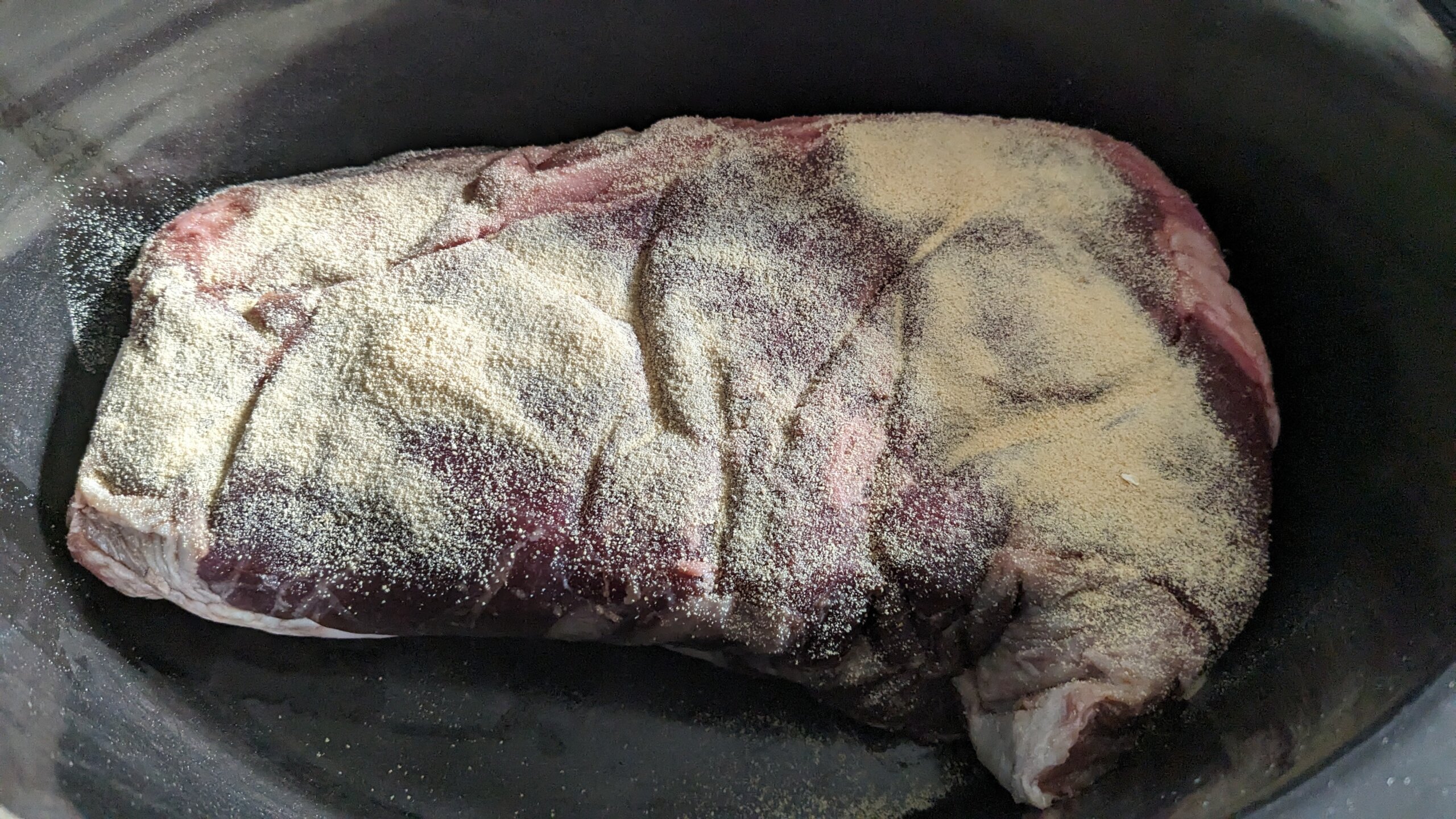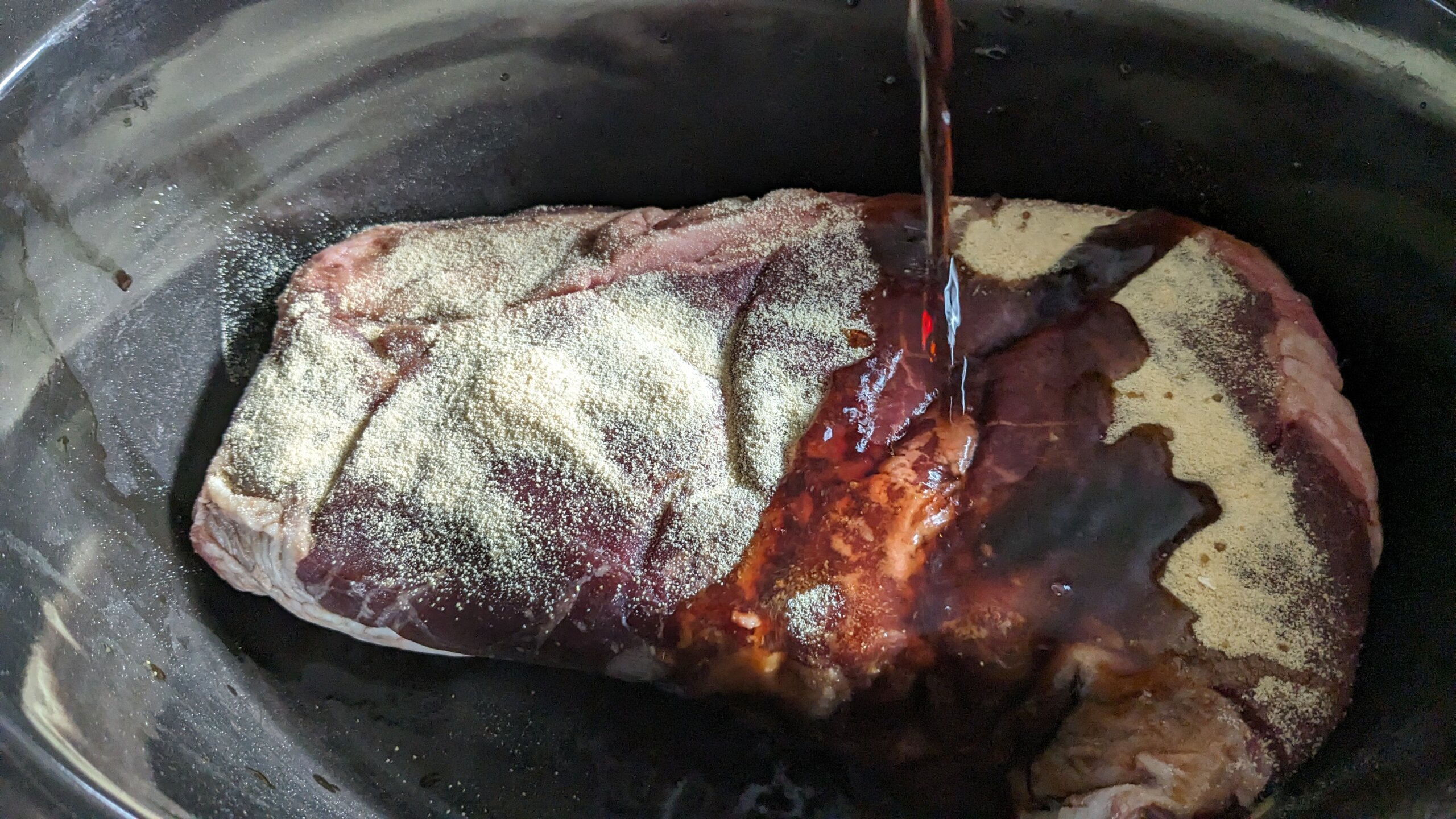 - In a crock pot, add the roast, ½ cup of soy sauce, 1 tbsp of garlic powder, and 3 tbsp of rice vinegar (or white vinegar)