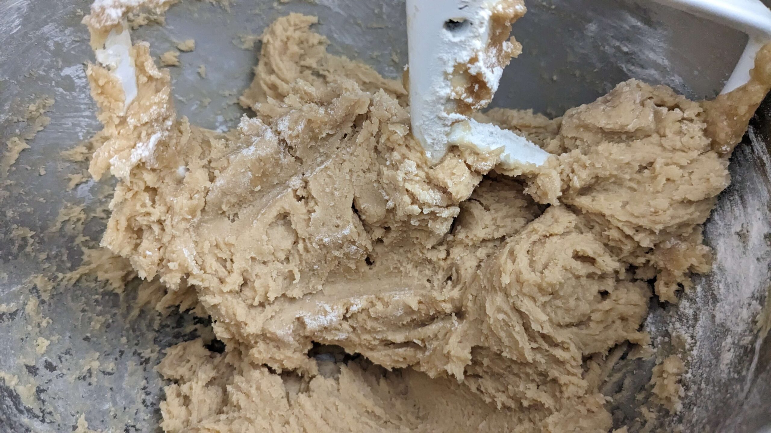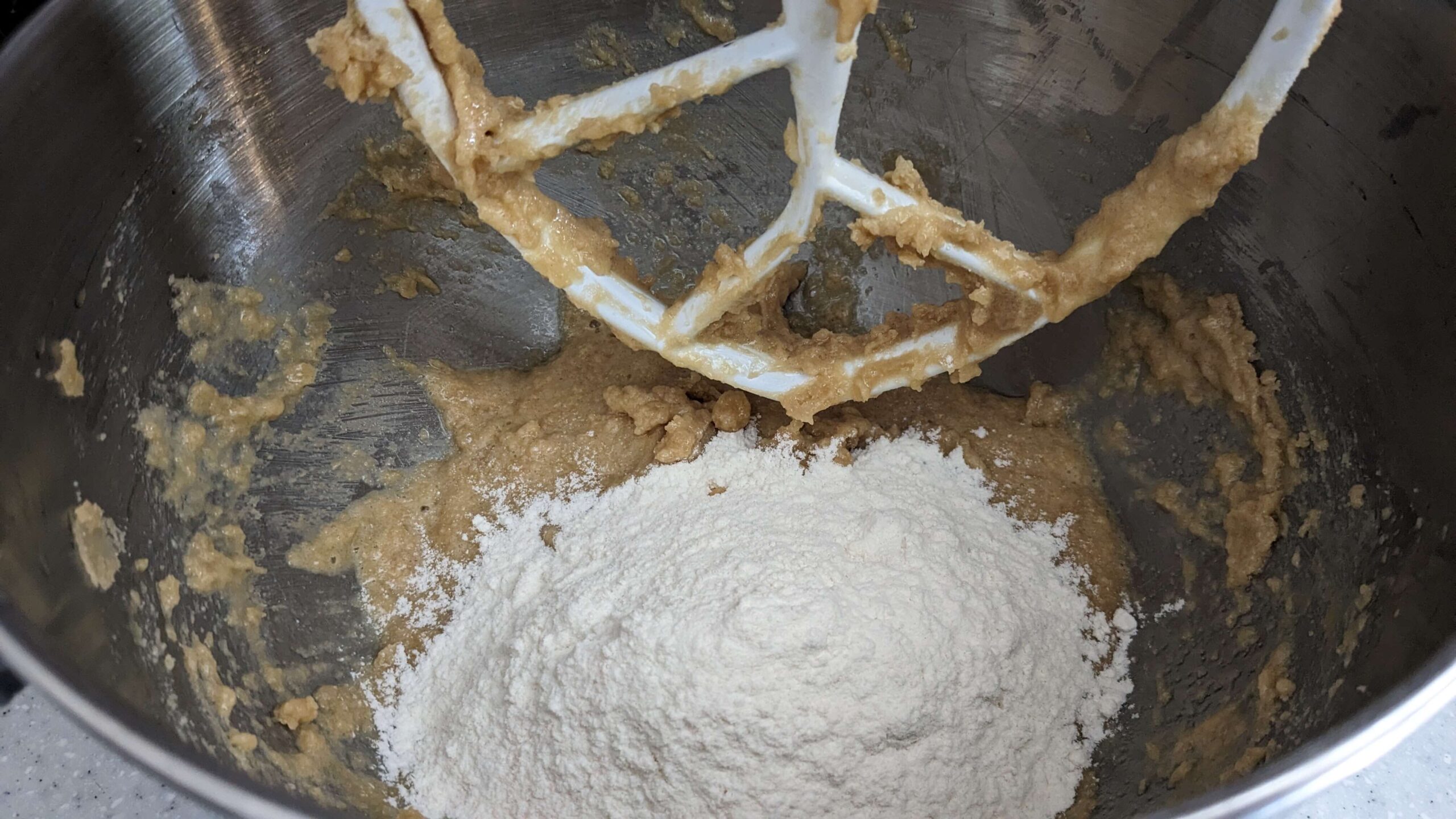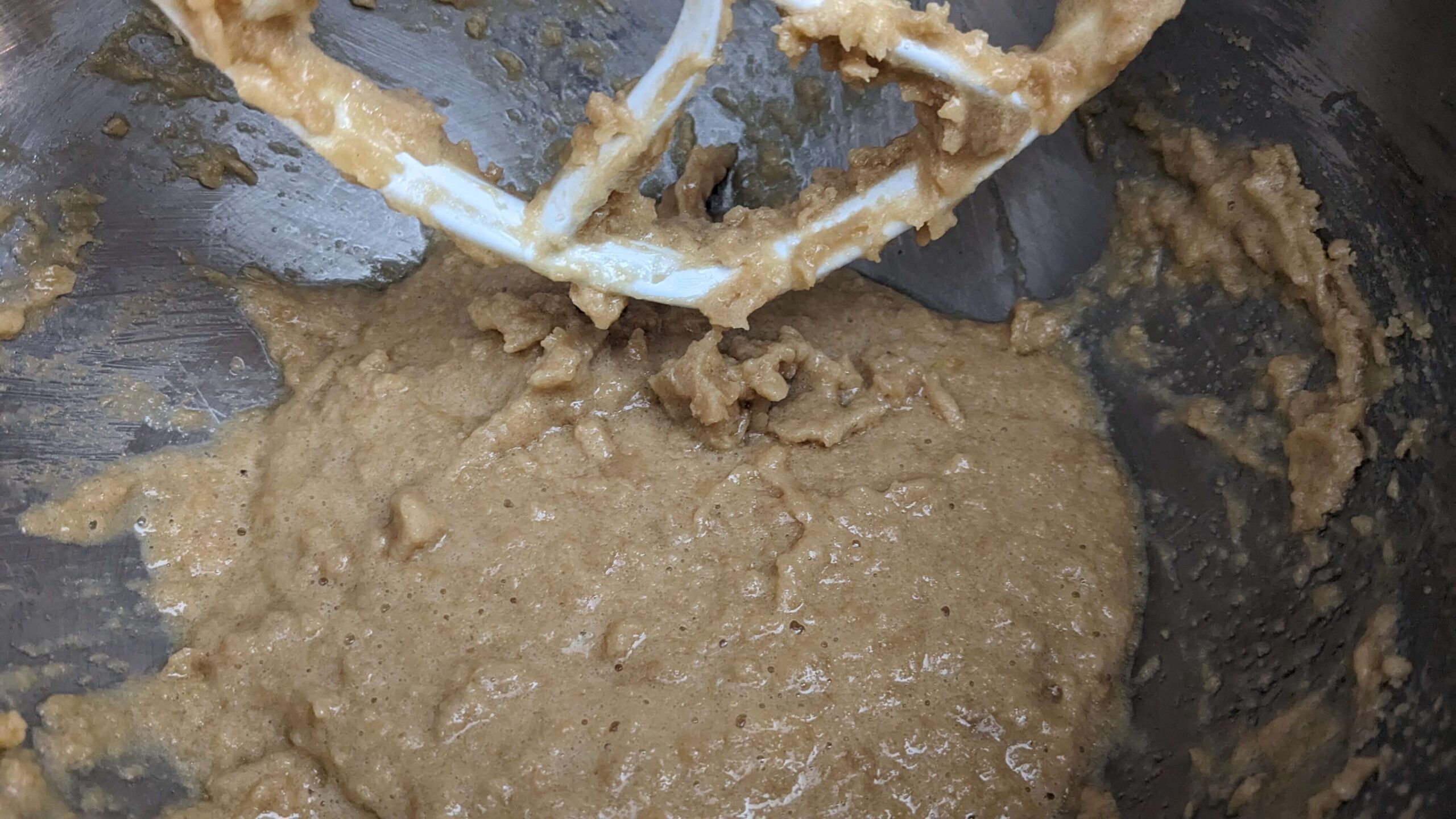 Scrape down the sides of the mixer and add two eggs and 1 tsp vanilla extract. Mix at medium speed until incorporated. This step took close to five minutes before I could visually see the ingredients blending well. I’m not sure why it takes so long, it may be because I don’t use as much sugar as some other recipes I’ve seen.