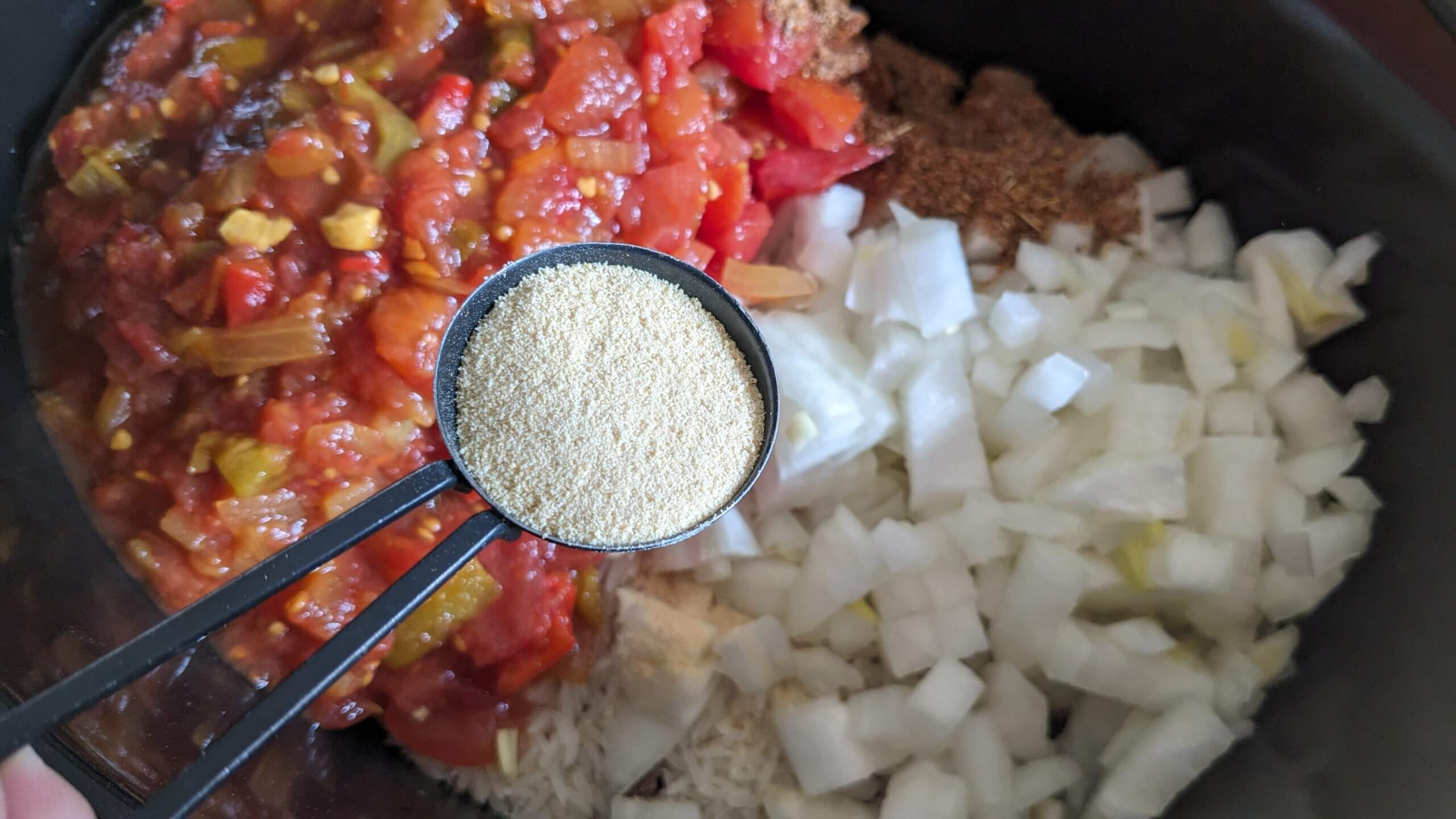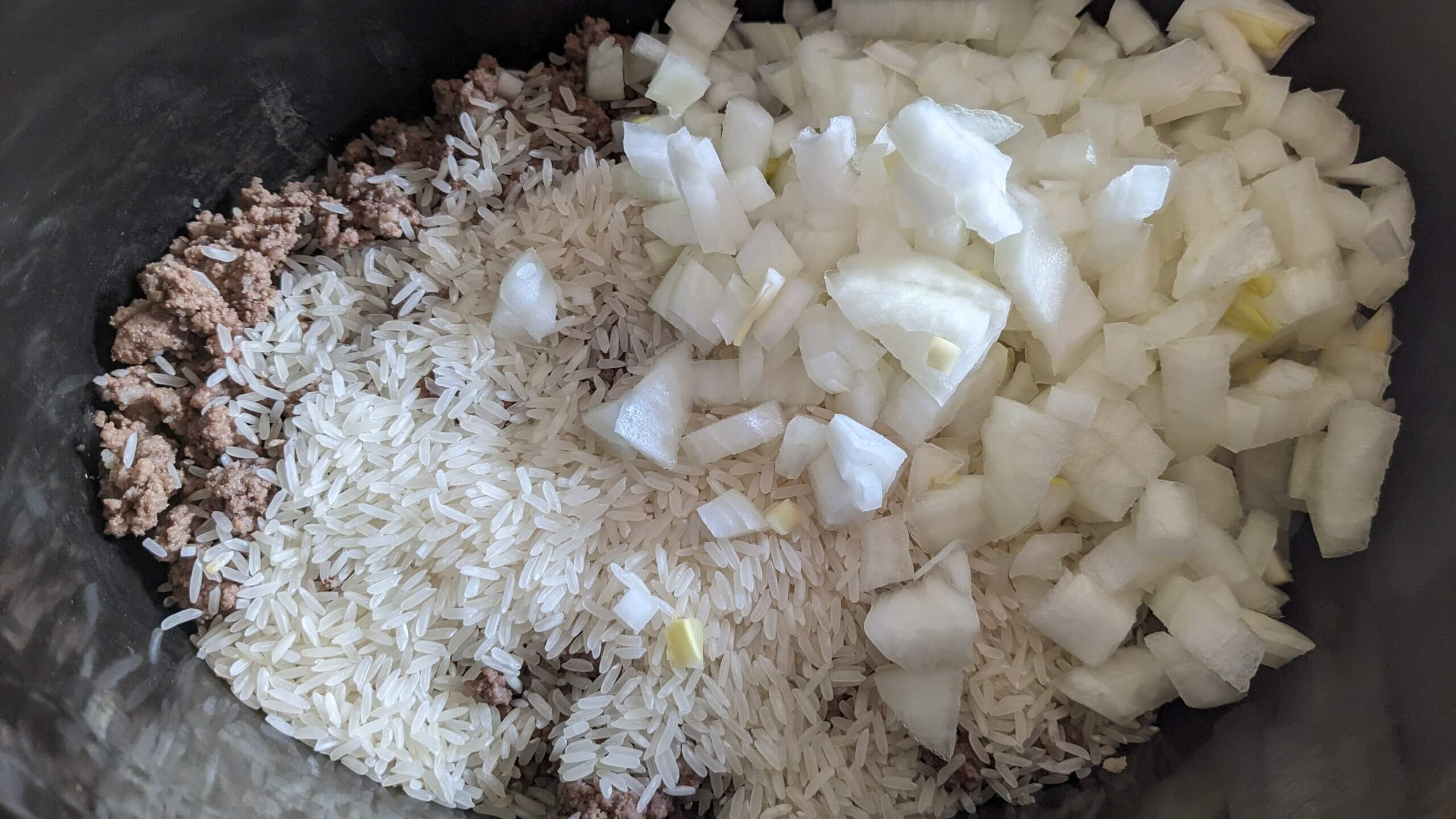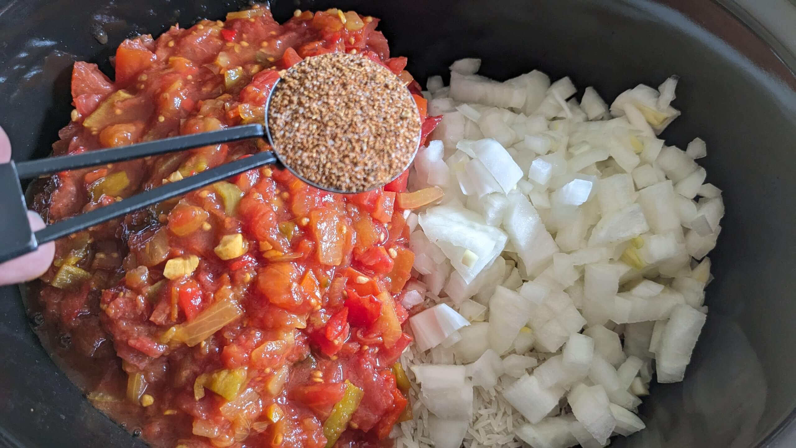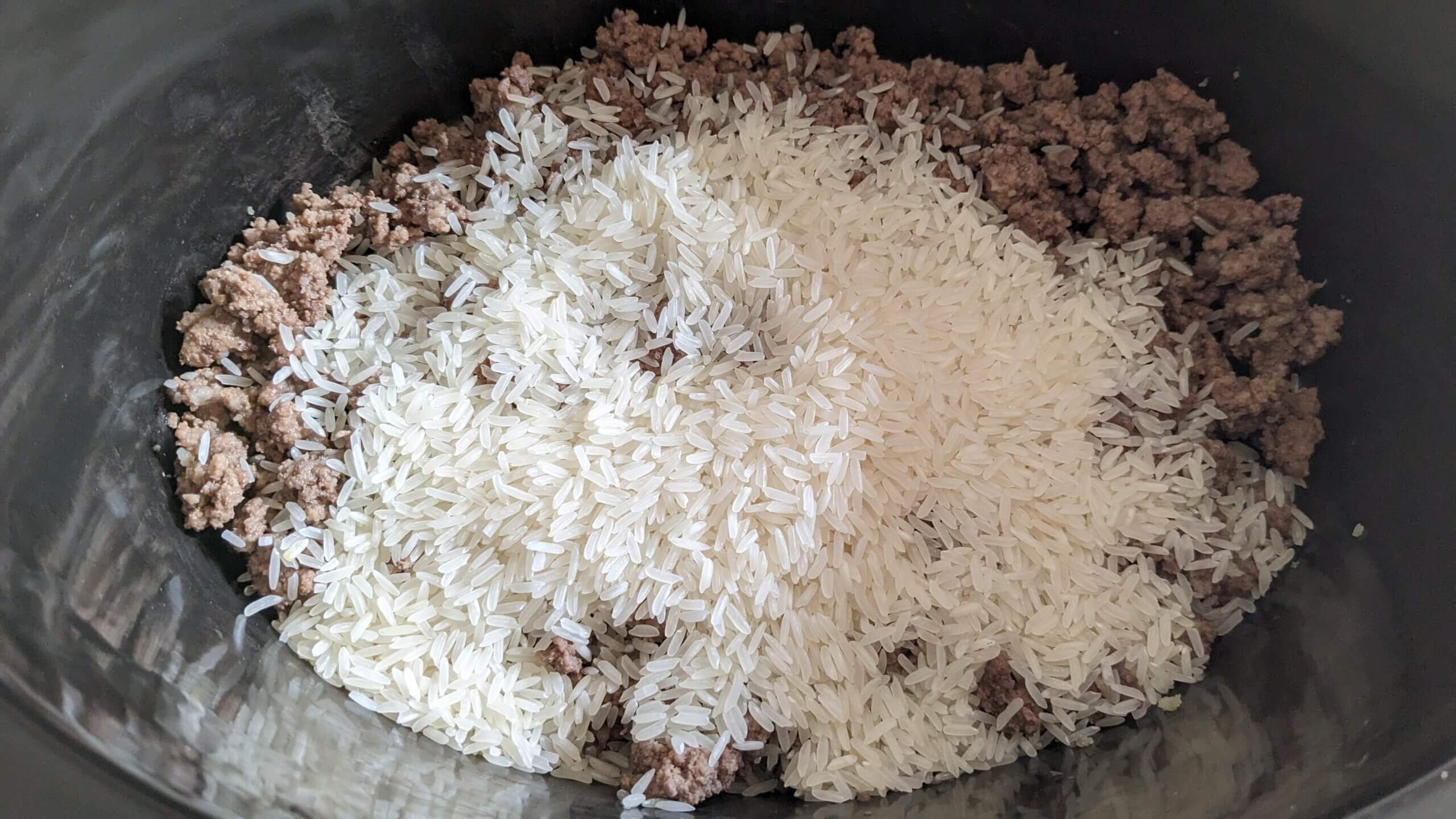 1. In a crock pot, combine 1 lb of ground beef that has been cooked and seasoned, 2 cups of salsa, 1 diced onion, and 1 cup of uncooked rice.