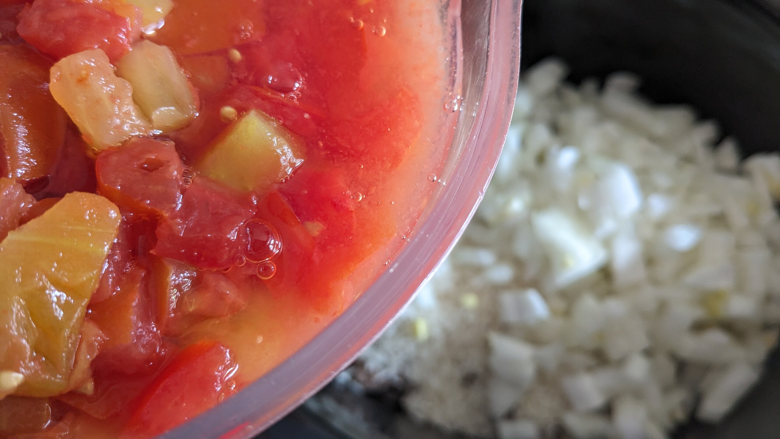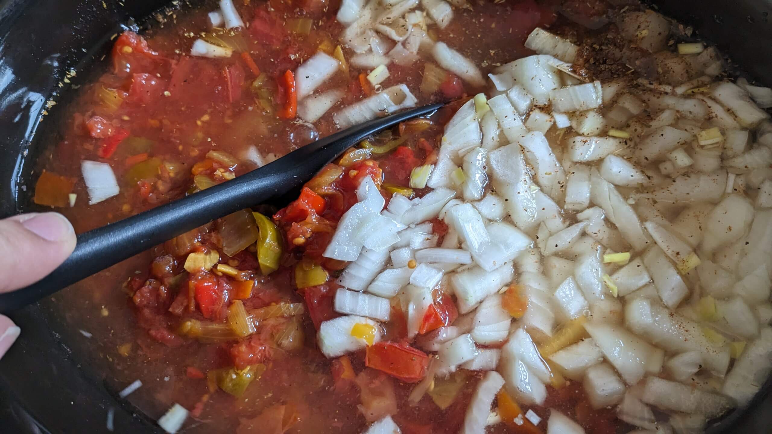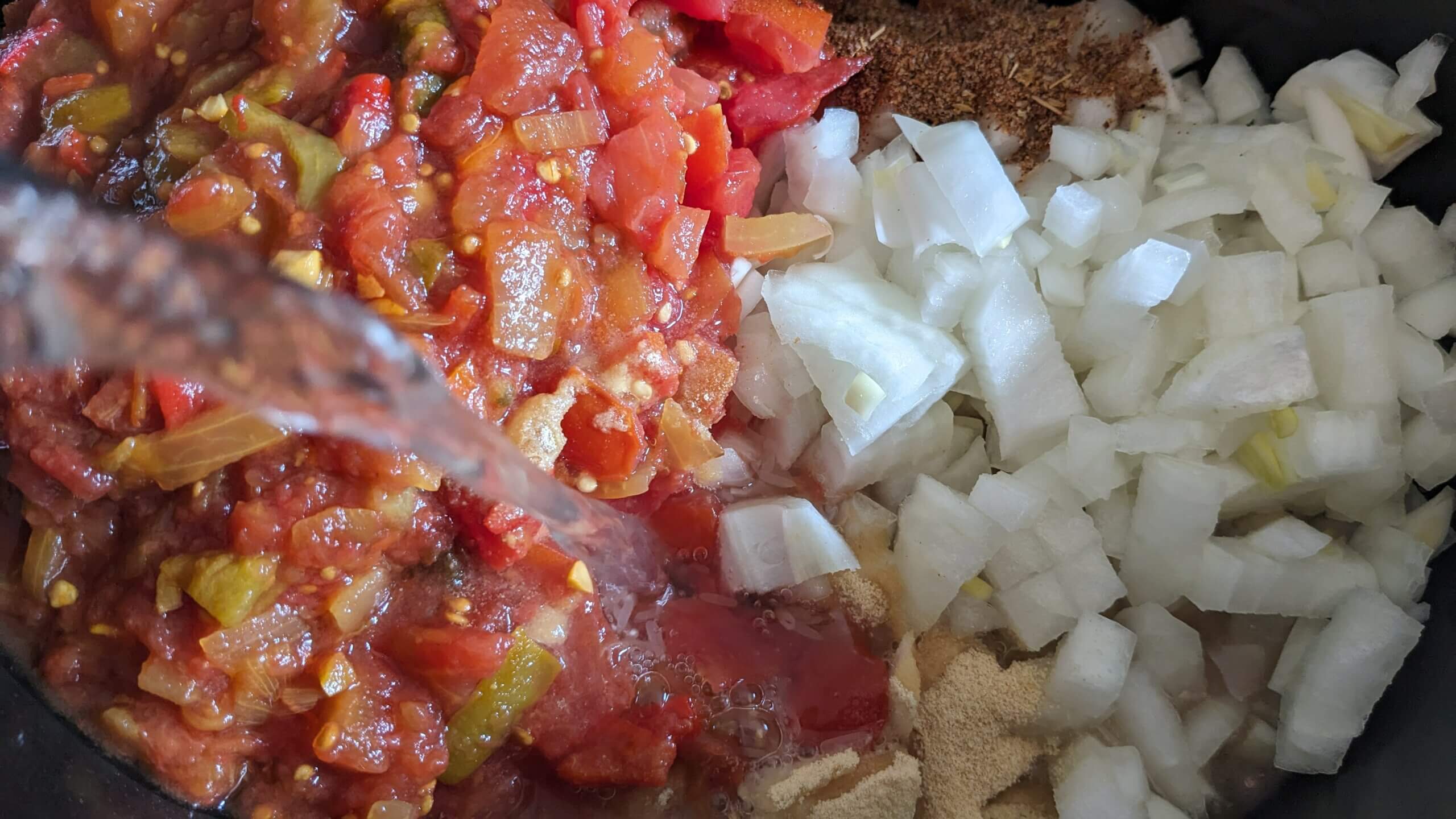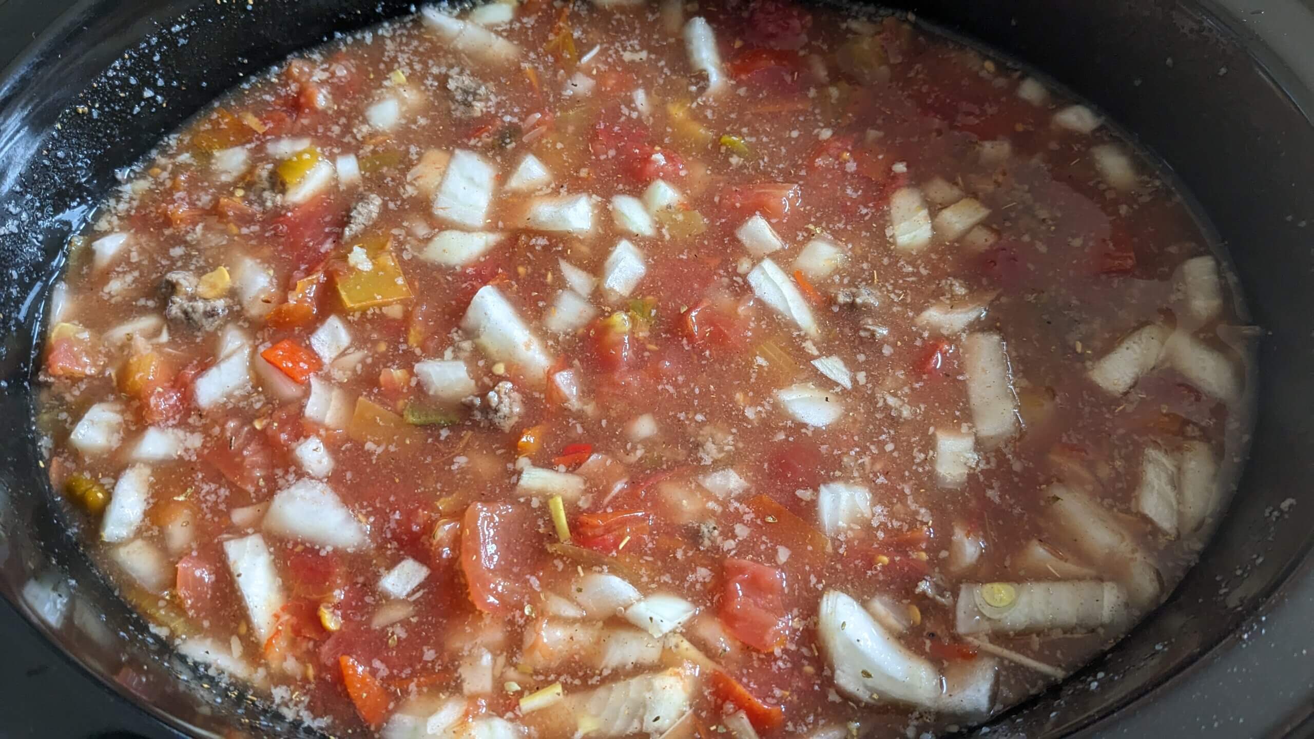 2. Note: Your onion needs to be finely diced or it will not be cooked through by the time the soup is done. If you want to use larger pieces of onions that you want cooked through, cook them in the saute pan with your ground meat. Alternatively, omit the raw, diced onion and add ½ cup dried, minced onion instead.