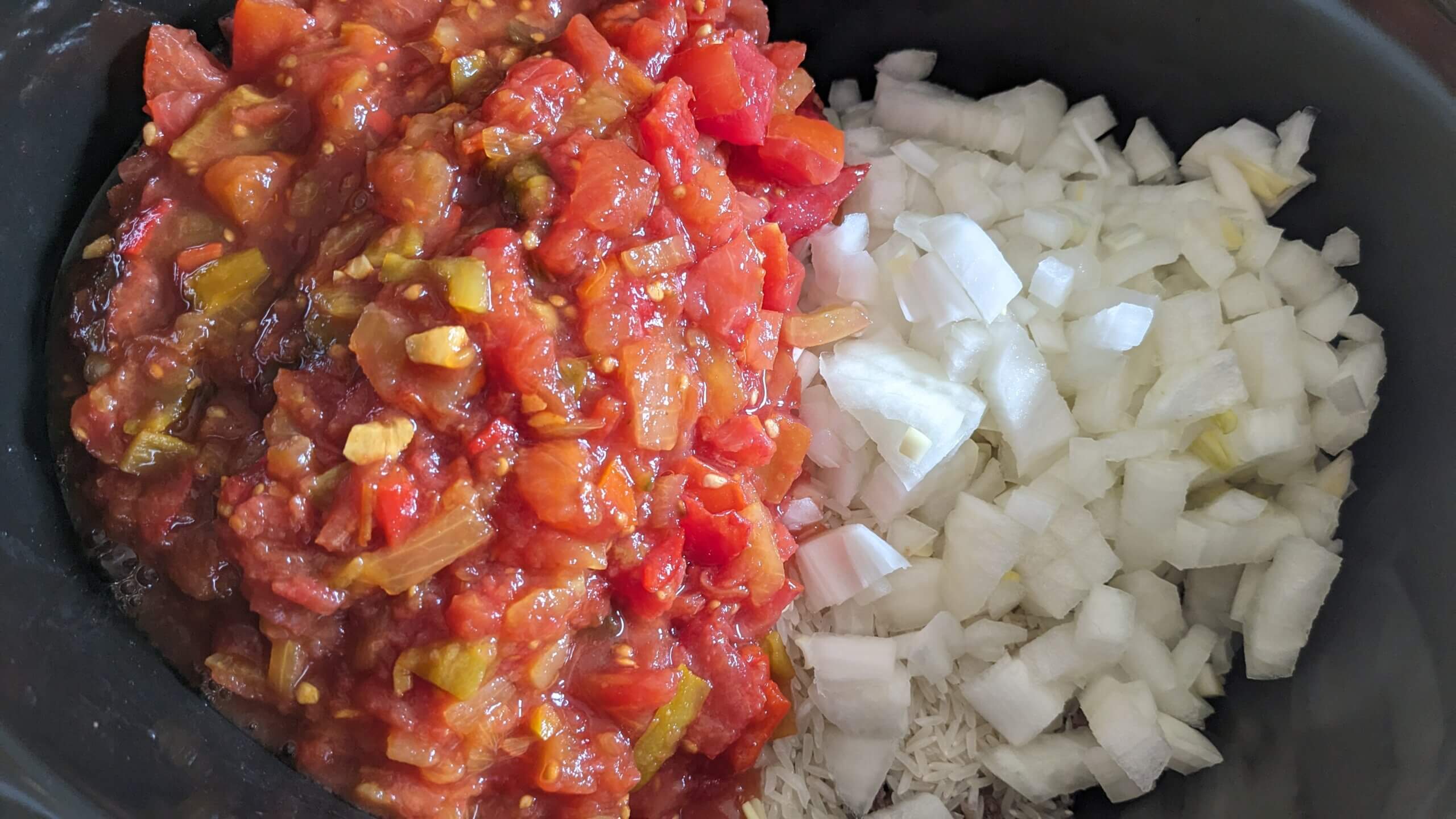 Now that your meat is cooked, everything else is so quick to assemble! In your crock pot, add 1 pound of ground beef, 1 diced onion, 2 cups of salsa, 2 cups of diced tomatoes, and 1 cup of uncooked rice.
