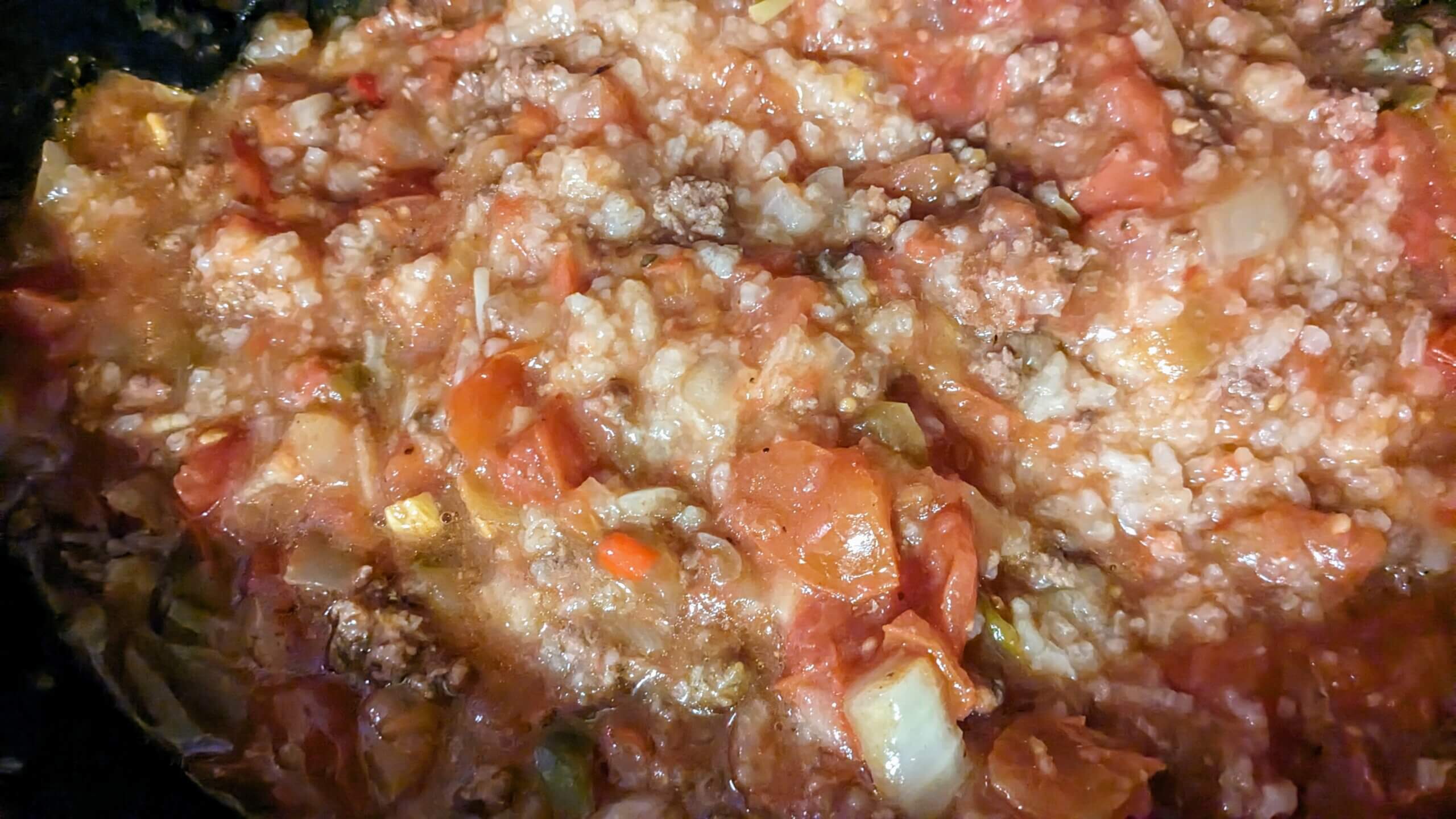1 lb of cooked and seasoned ground beef, 2 cups of salsa, 2 cups of diced tomatoes, 1 diced onion, 1 cup of uncooked rice, and 1 tablespoon each of garlic powder and taco seasoning. Oh, and 5 cups of water!