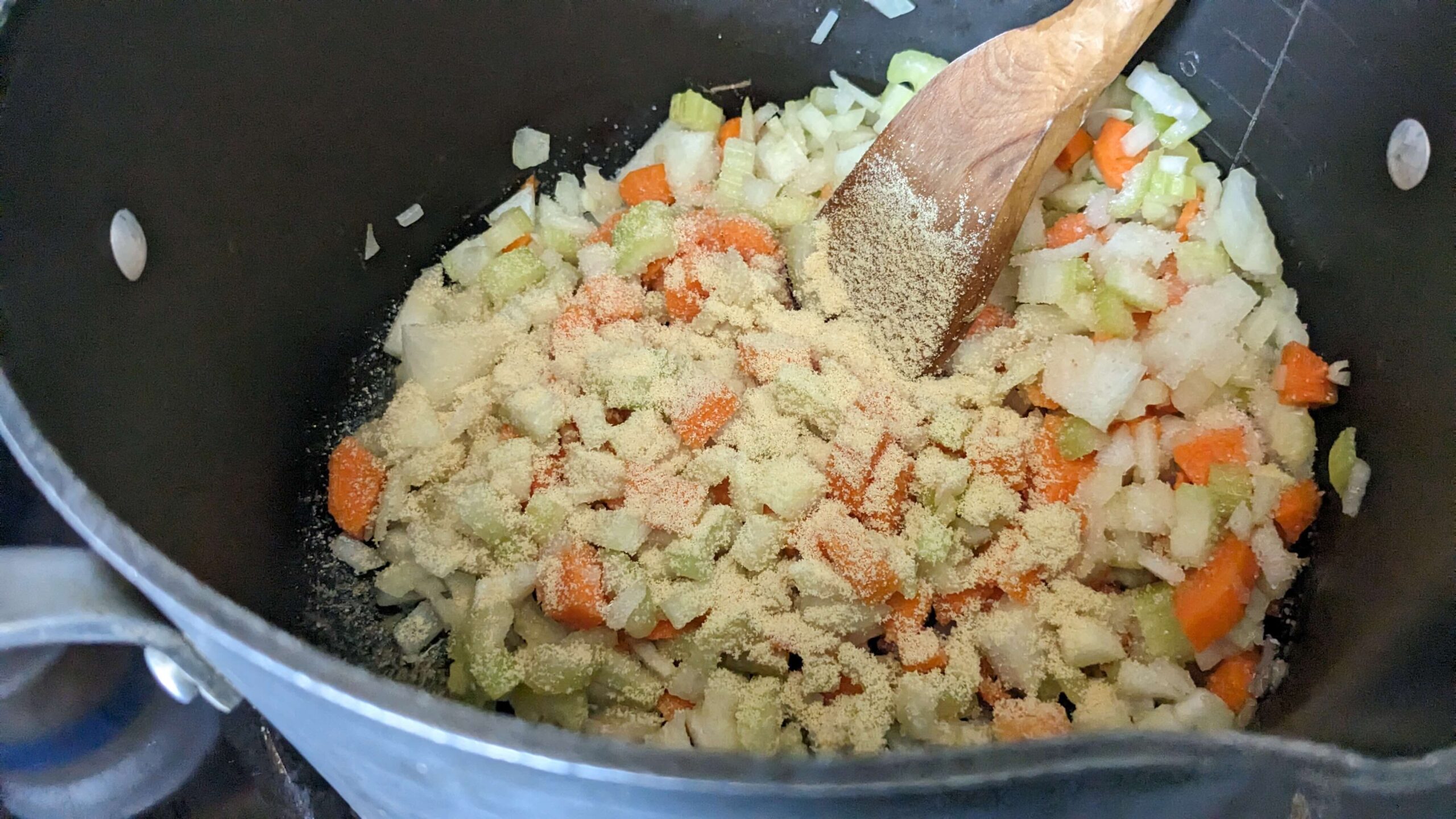 - Add chopped celery, onion, and carrots to the pot and cook until the onions and celery are translucent. Sprinkle with salt and 1 tsp garlic powder as it cooks.