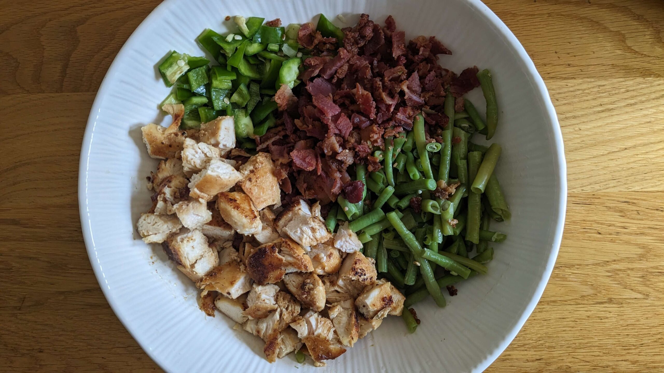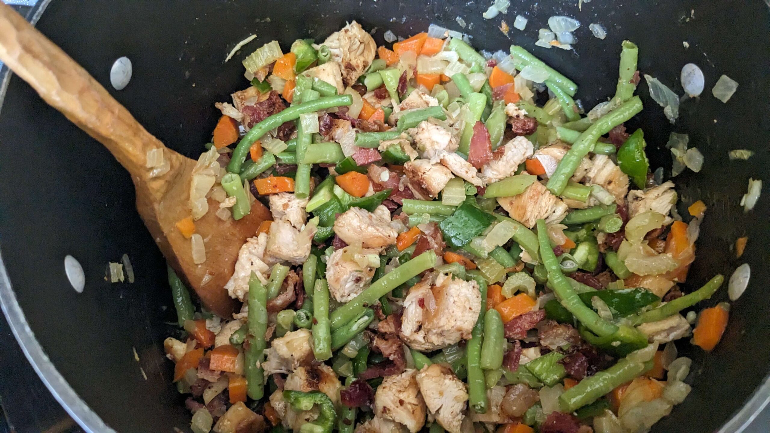 - Add the cooked chicken, bacon, peppers, and green beans. Stir in until everything is heated through, letting the flavors meld. Add 1 tsp garlic powder and sprinkle salt on to taste.