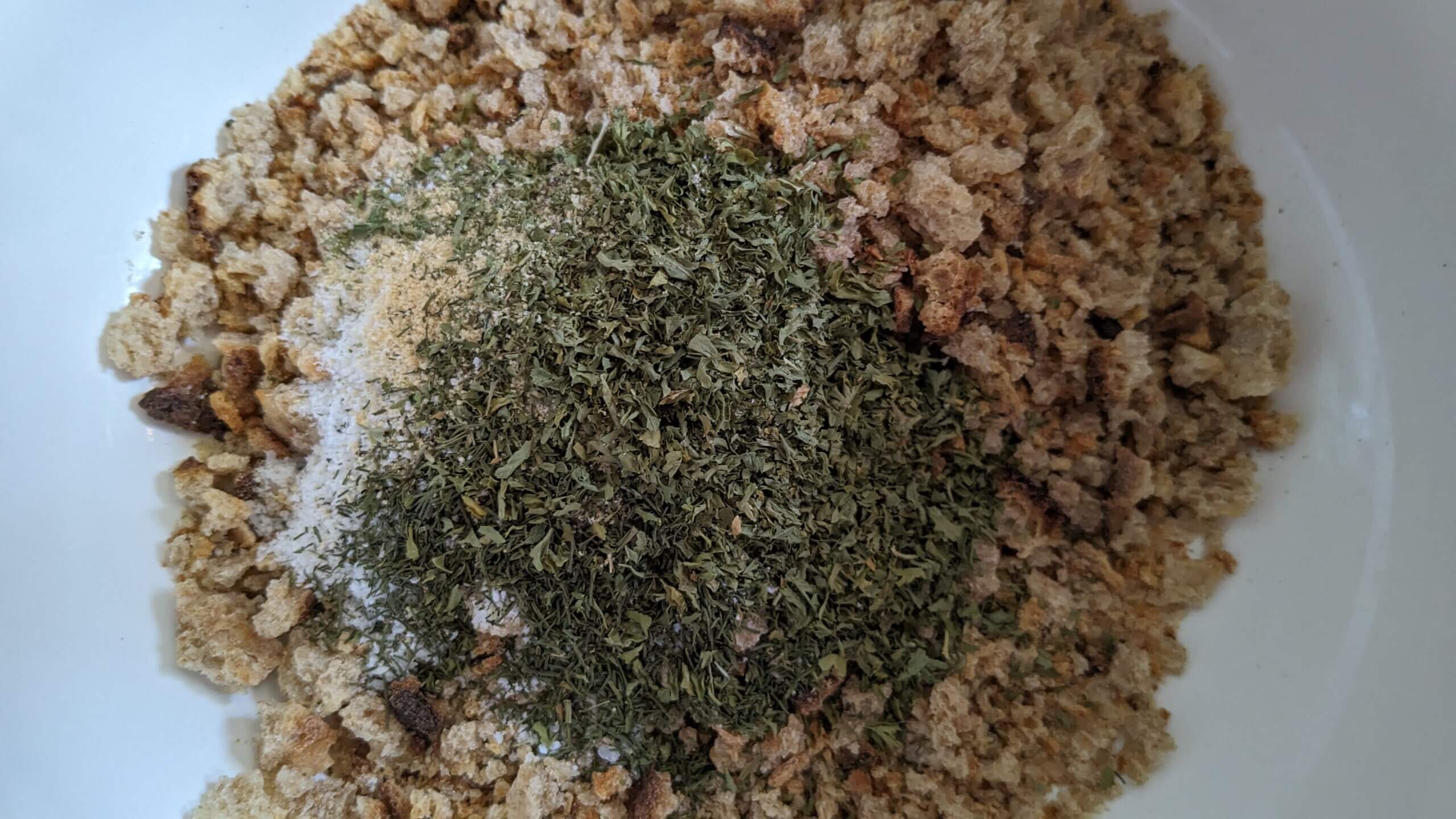 - In a bowl, combine 1 cup of breadcrumbs, 1 tbsp parsley, ½ tsp each of dill and onion powder, 1 tsp each of salt and garlic powder, ¼ tsp of pepper, and 1 cup of shredded cheese.