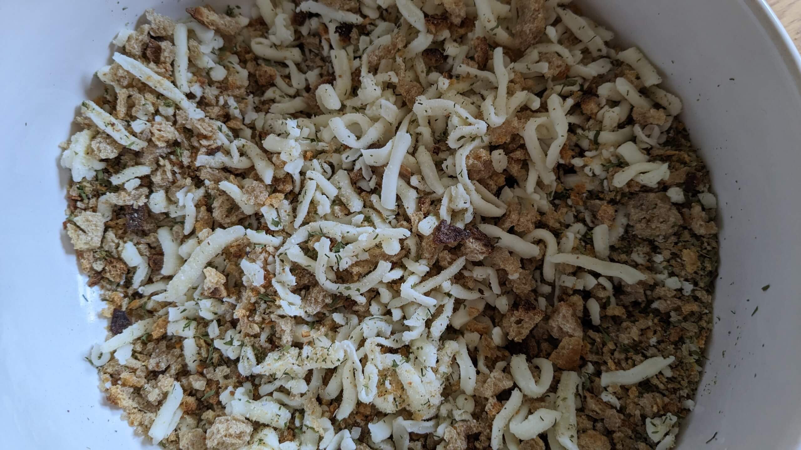In a bowl, combine 1 cup of breadcrumbs, 1 tbsp parsley, ½ tsp each of dill and onion powder, 1 tsp each of salt and garlic powder, ¼ tsp of pepper, and 1 cup of shredded cheese. I used mozzarella for dinner this time, but I’ve enjoyed the results with multiple kinds of cheeses!