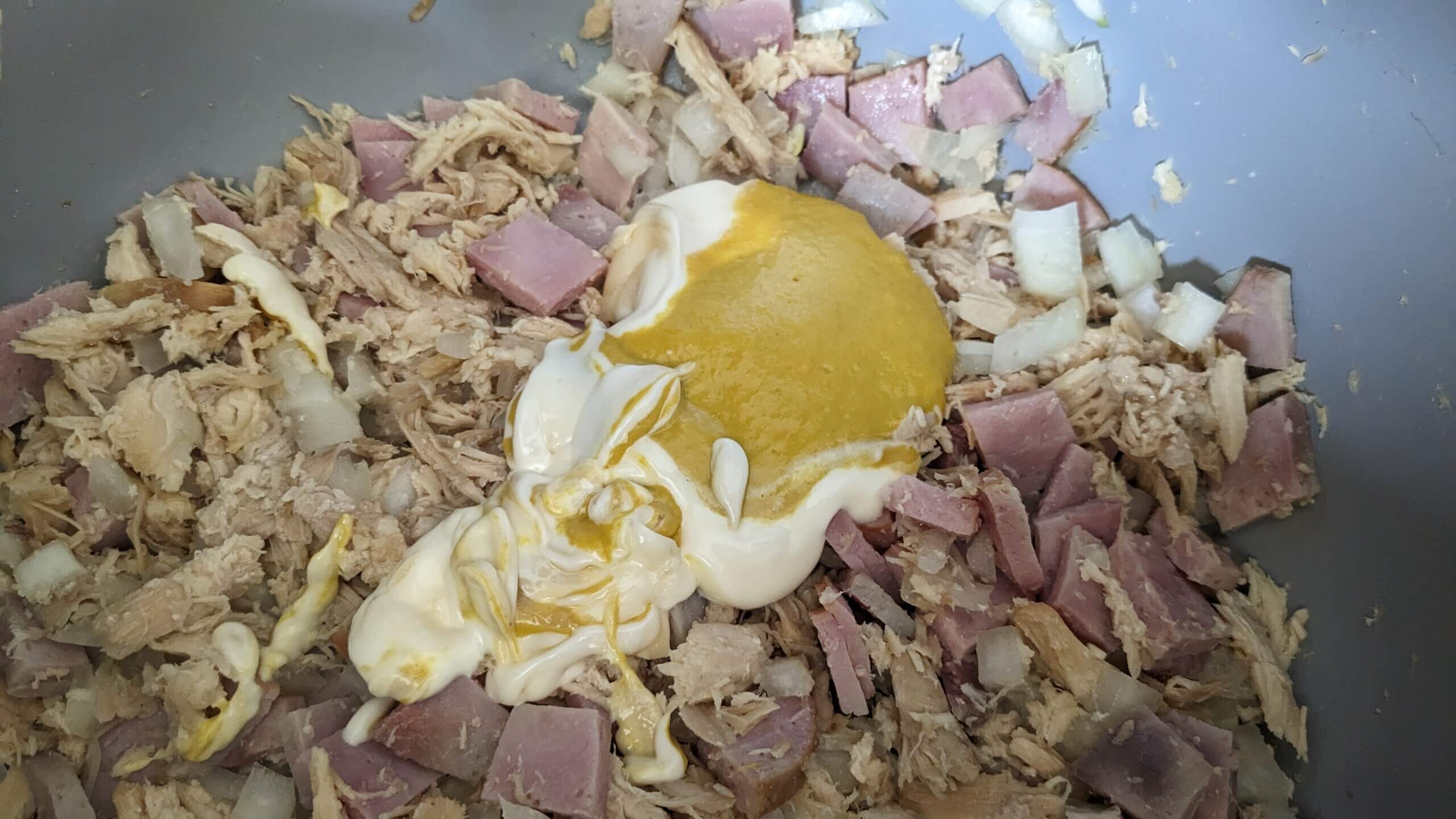 shredded chicken, onions, and ham