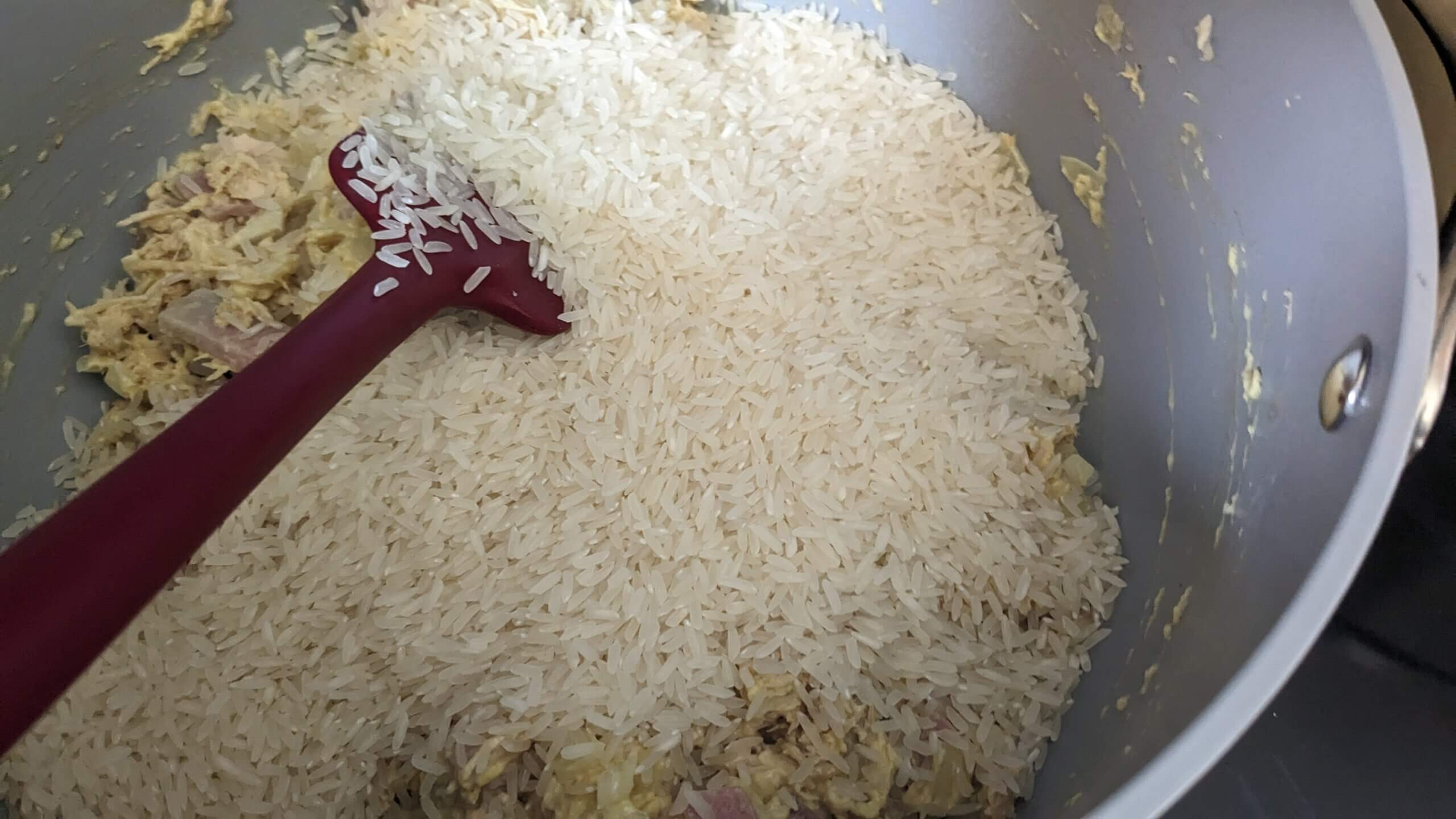 water simmering in a pot of rice, ham, and chicken
