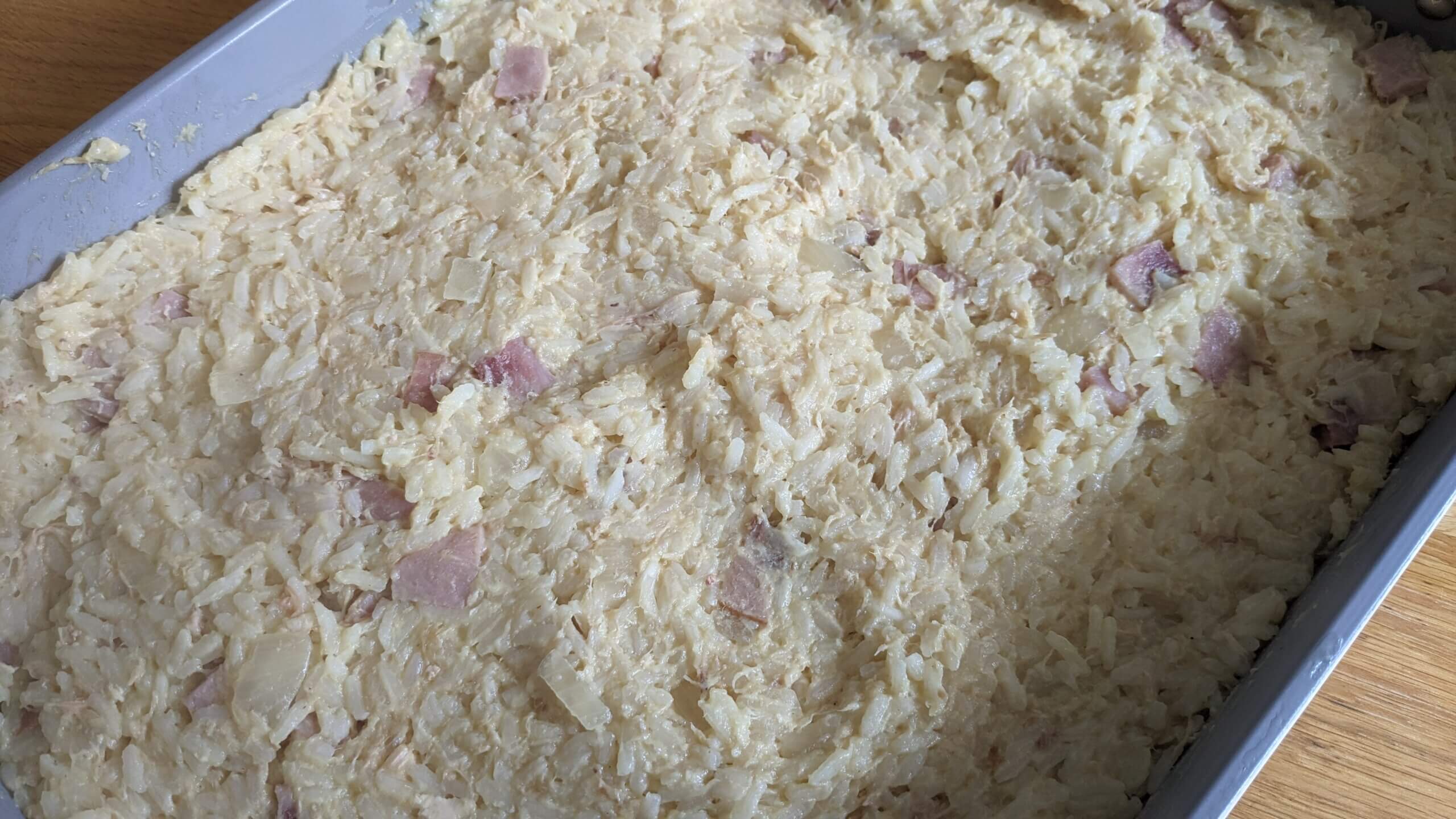 Add ¼ cup of Dijon mustard once the rice is cooked and stir thoroughly. At this point taste and add salt to your taste. Because of the differences in the types of chicken and ham, plus the mustards going in, waiting until now to check for seasoning will help with not over-salting. At this point, you could put the pot in the fridge, or transfer the casserole ingredients to a pan and put that in the fridge to bake for later. It will take longer to cook if you’re starting from refrigerator temperature though, so account for that with your bake time!