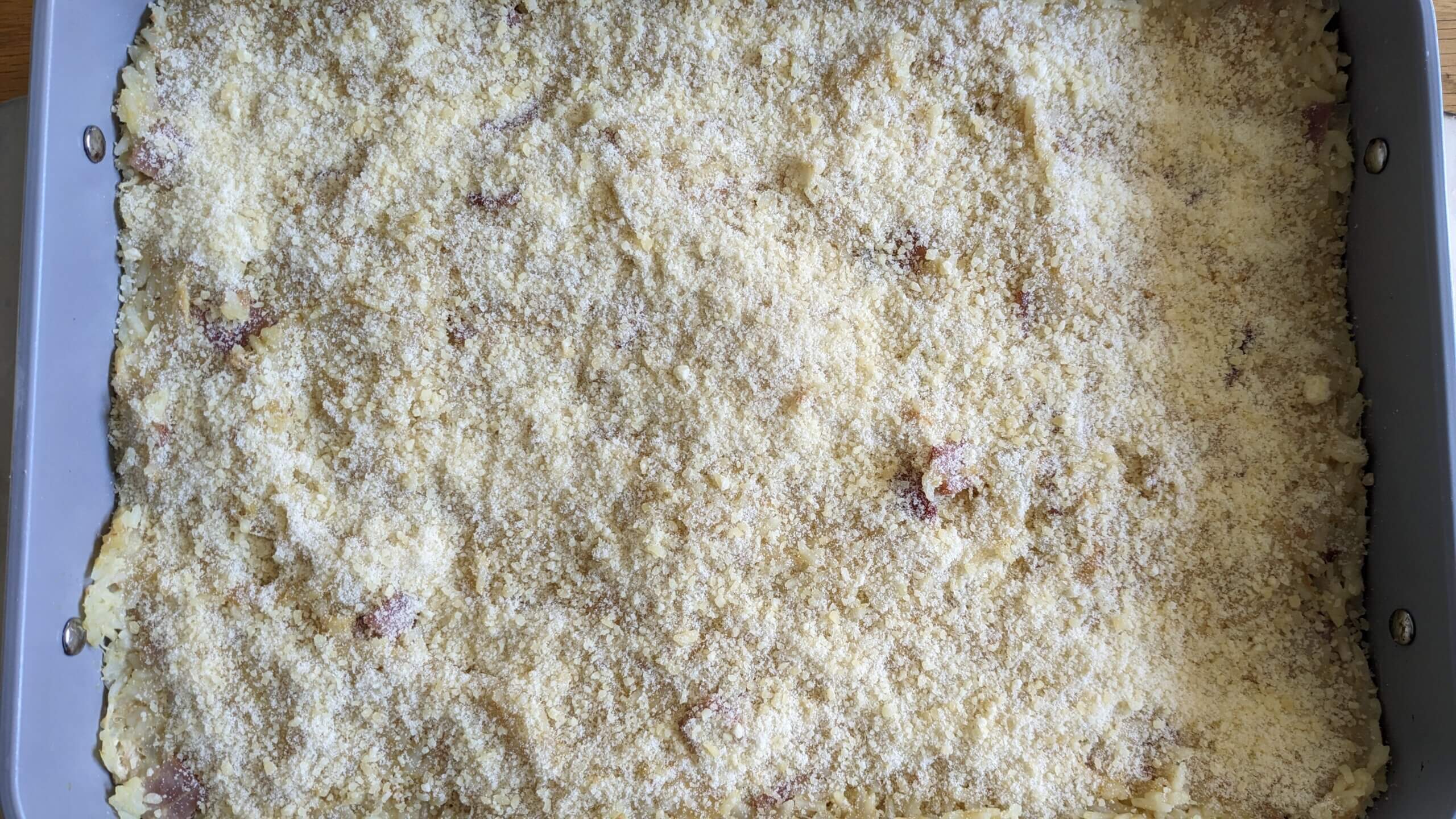 Preheat the oven to 350 degrees. Transfer the mix to a 9 x 13 pan. Top the mix ½ cup of parmesan cheese and 1 cup of bread crumbs.
