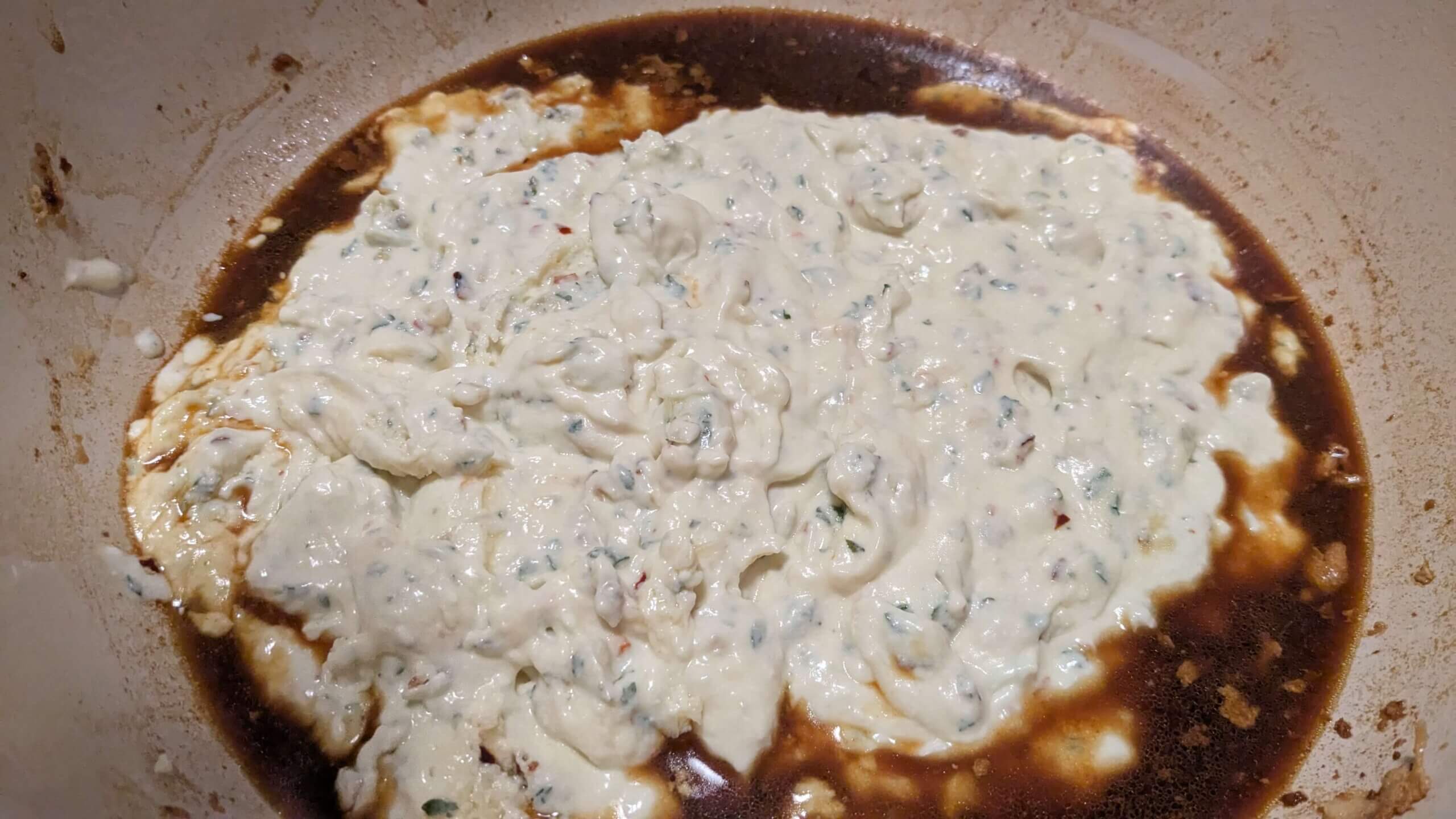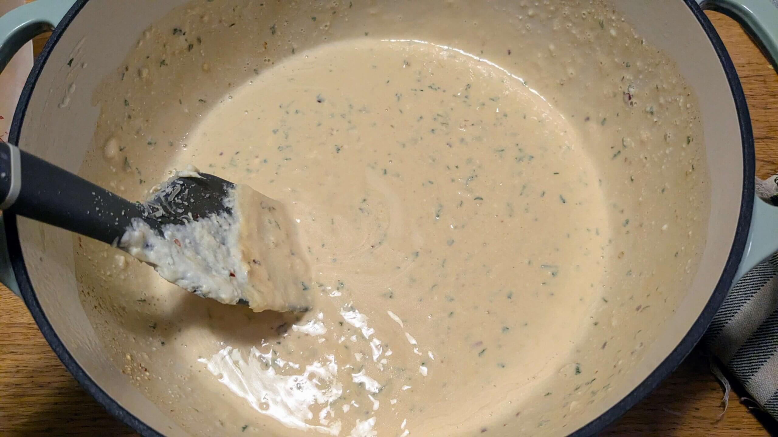 - Add the remaining butter, ⅔ cups of parmesan cheese, 8 ounces of cubed cream cheese, and 1 cup of half and half. Gently stir the mixture until the cheeses are melted and everything is incorporated. Add 1 tsp of red pepper flakes and 1 tablespoon of dried parsley. Set aside.