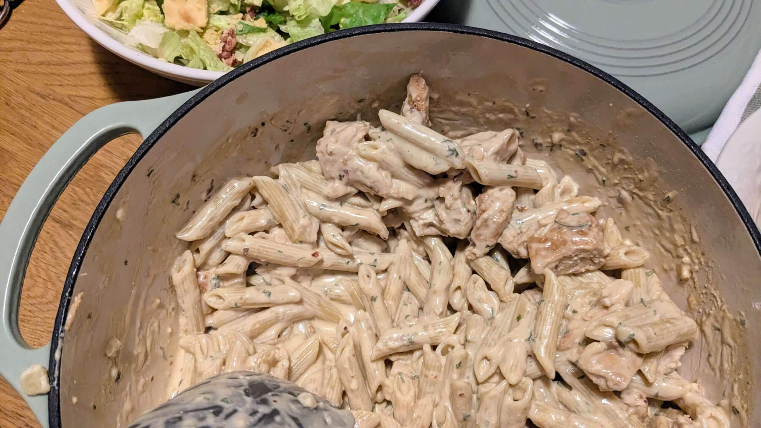 In the same skillet (while still on medium heat), add a quarter cup of the reserved pasta water and use a wooden spoon or spatula to get the browned remnants from the cooked chicken up. Add the garlic cream sauce and the cooked pasta, stirring until incorporated. If the sauce is too thick, or not sticking to the pasta, add the pasta water, a quarter cup at a time until you’ve reached the desired consistency.