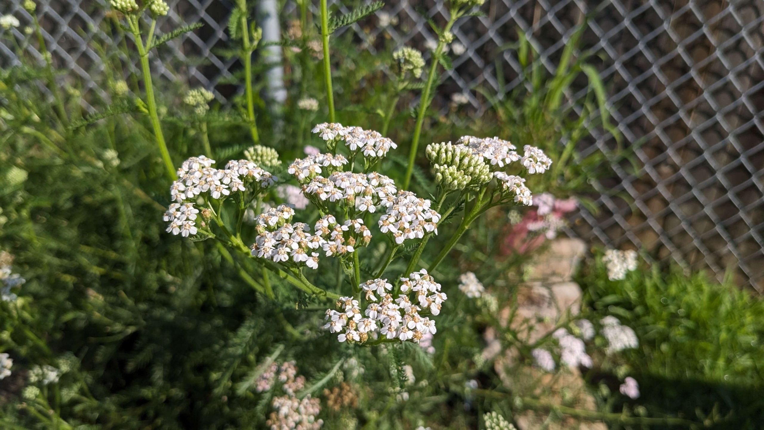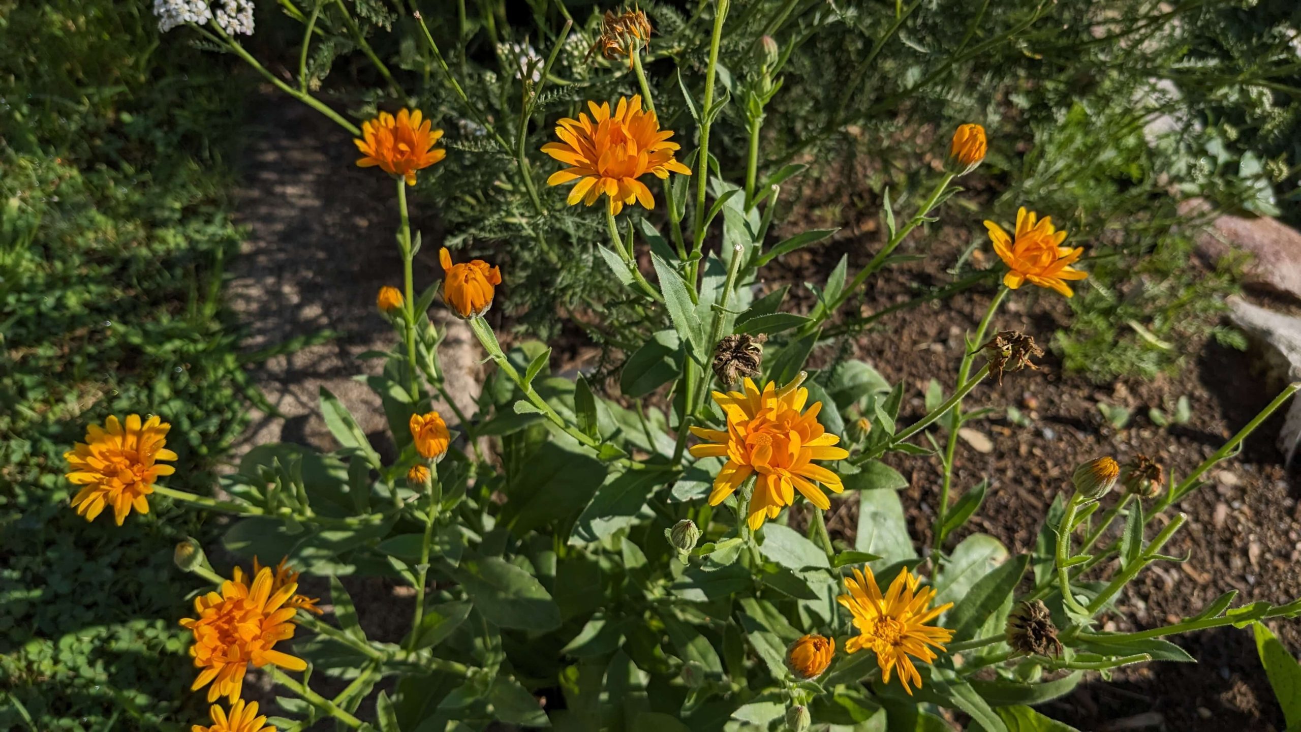 I have had sage, thyme, and oregano in my garden for several years, but I did grow thyme and sage from seed this year. Last year I grew cilantro and it reseeded itself and I have a bunch growing this year and my chamomile too! I did not know that chamomile spreads like crazy, but it does and I am so excited to have it grow for tea this year. Bennett extended our garden so I now have a tea garden where we condensed all the chamomile that came up earlier this spring, and I’m going to add echinacea and lavender. I ended up also growing calendula and yarrow this year but I don’t have notes on it from this growing season. Here’s what those two plants look like.