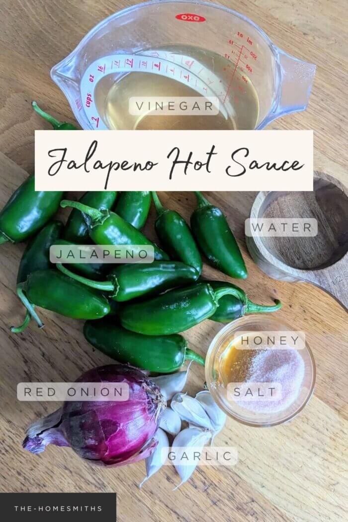 jalapeno Hot sauce in a mason jar surrounded by jalapenos, garlic, and a red onion