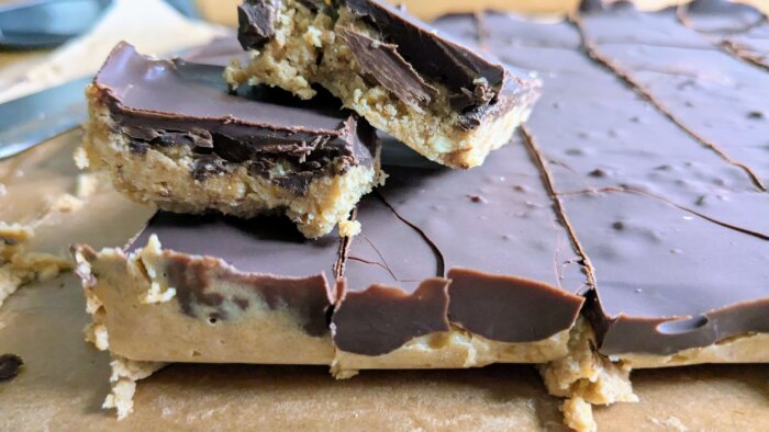 Let the pan cool in the refrigerator for two hours. When ready to serve, cut into portions using a warm knife. If you lined the dish with parchment paper, you can lift the whole slab out onto a cutting board to make cutting easier. If the chocolate on top is breaking in places other than where you are cutting it, let the dish sit at room temperature for 5-10 minutes before cutting. Store leftovers in a sealed container in the fridge.  Let us know what you think of this No-Bake recipe!