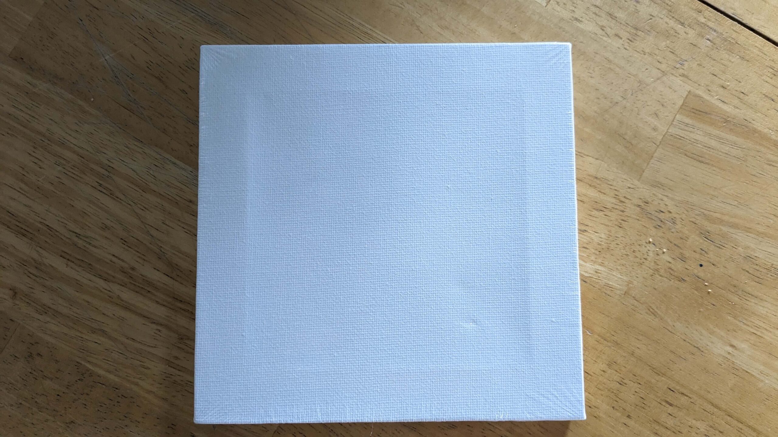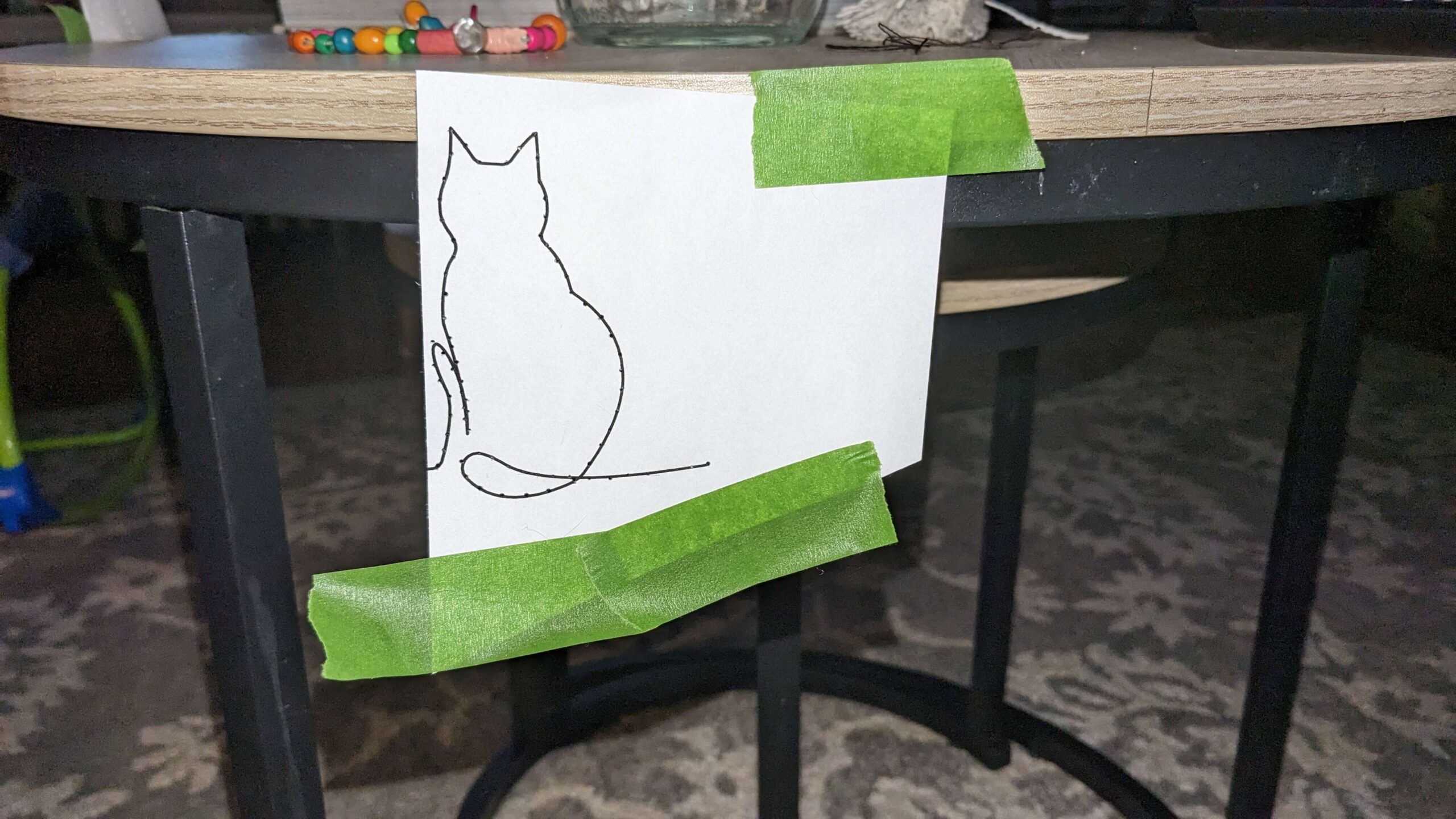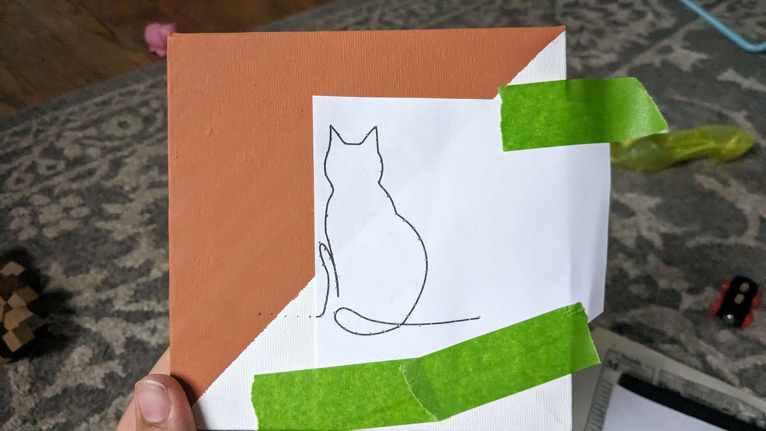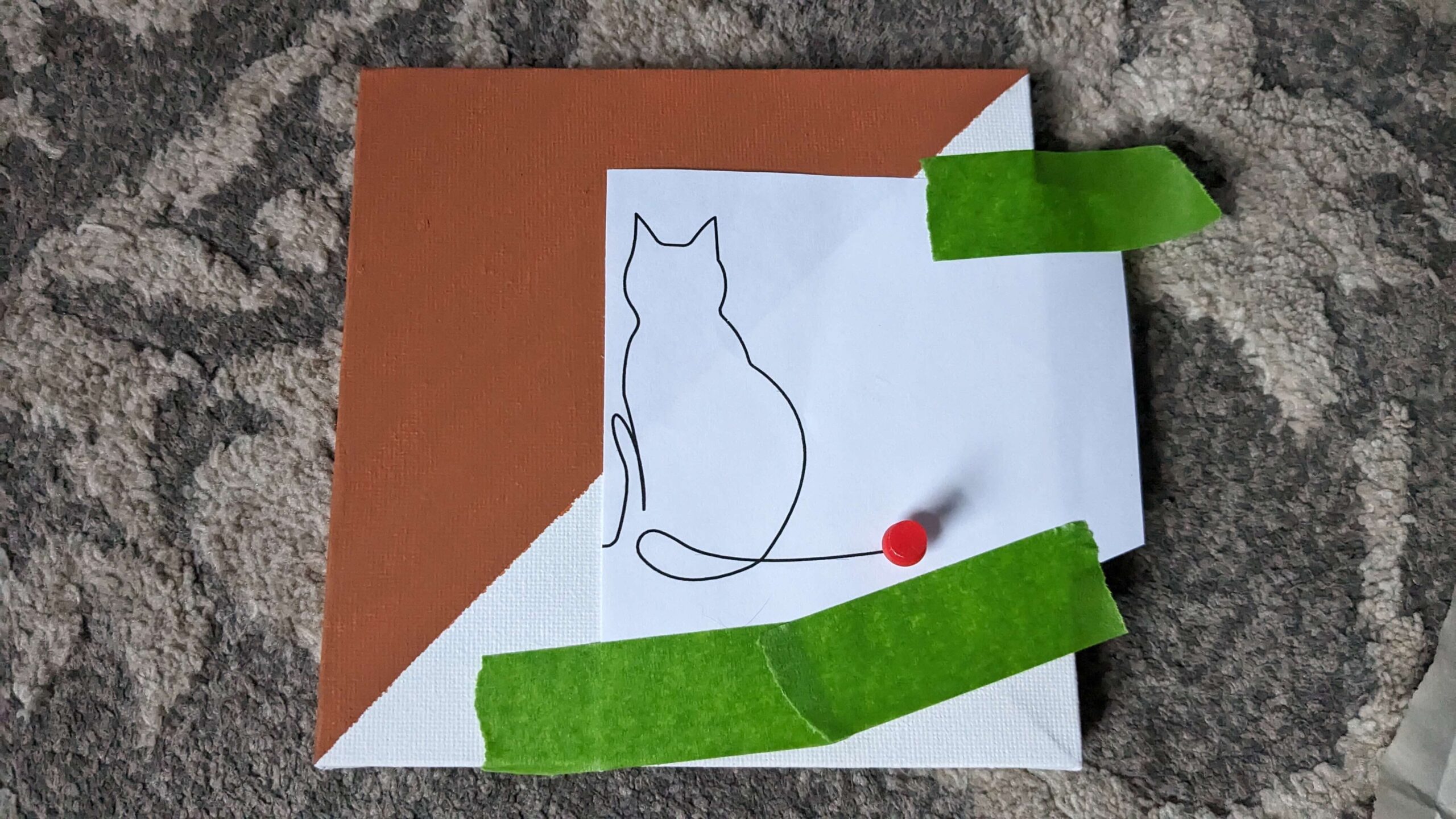 After the paint had dried and I removed the painter’s tape, I used a little bit more painter’s tape to tape the cat art onto the canvas. I made sure that it was centered and wouldn’t cause me any problems with the wood frame underneath the canvas, and only adhered the tape to the non-painted side.