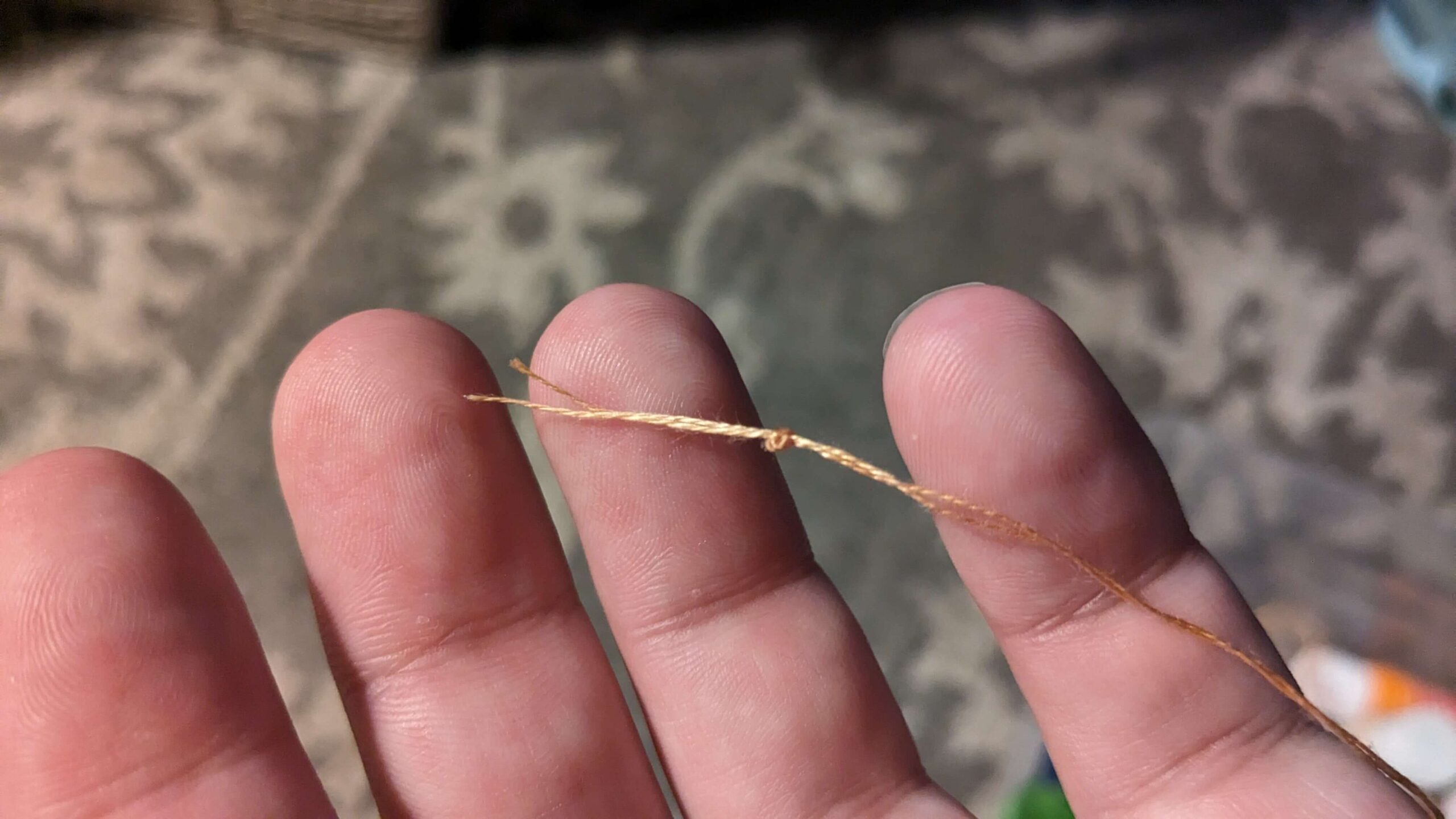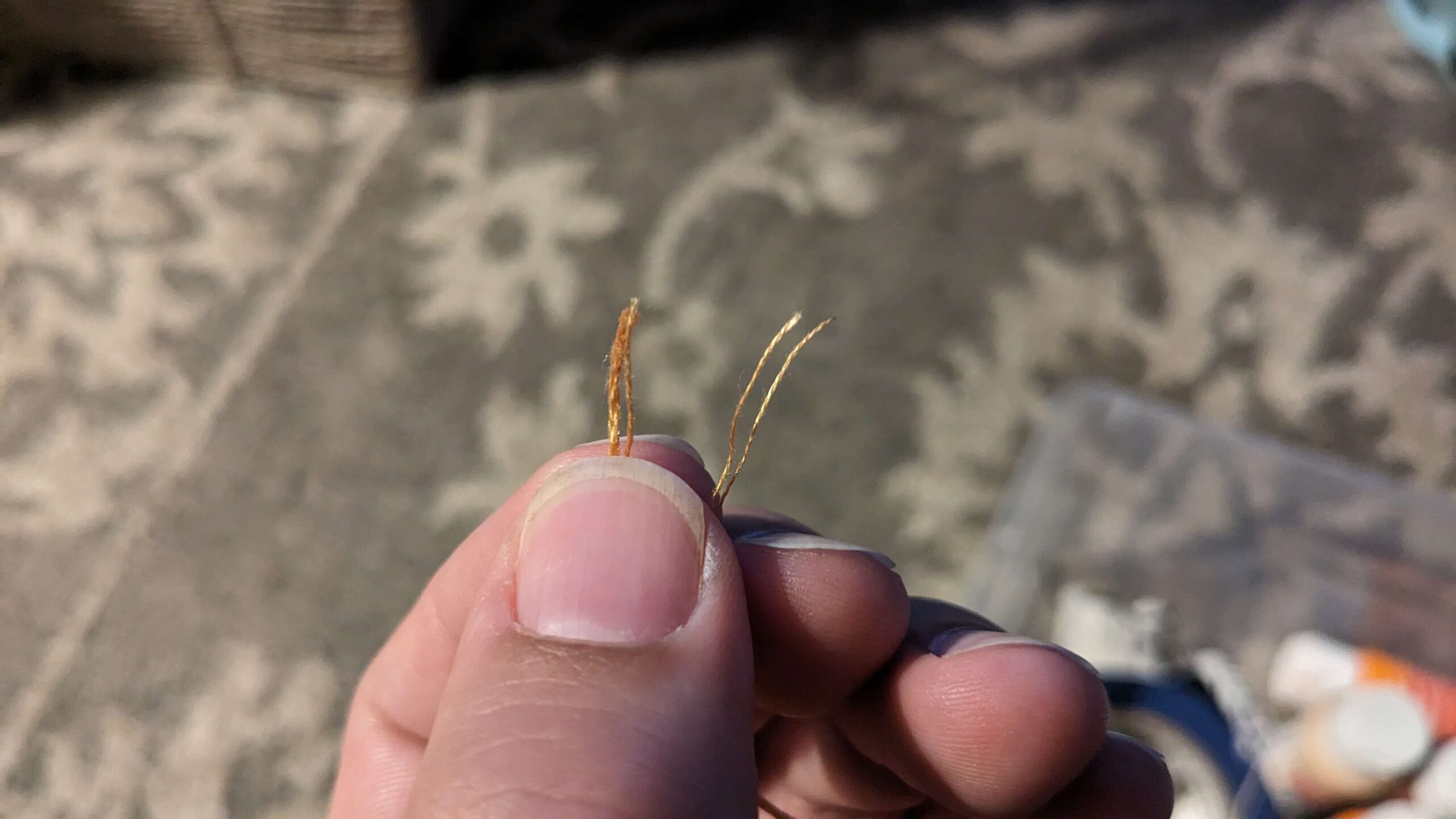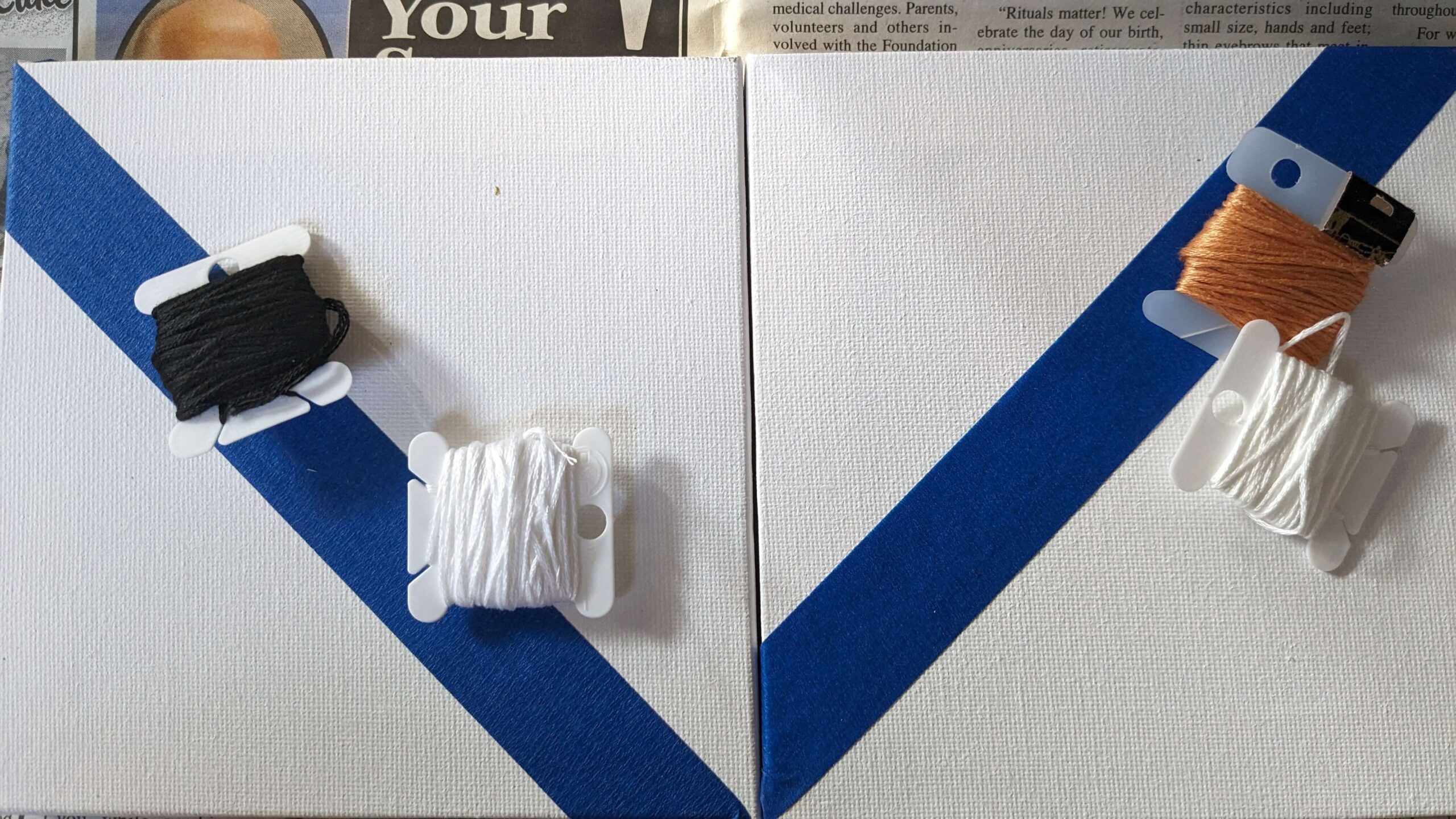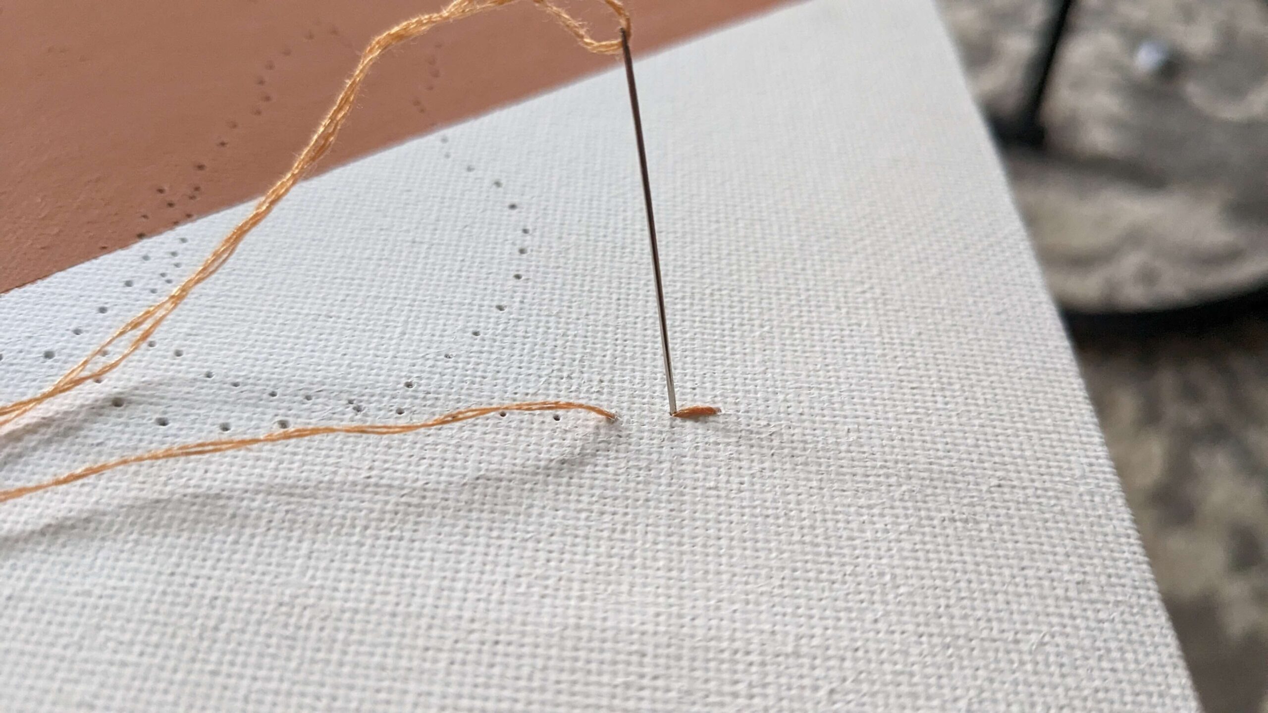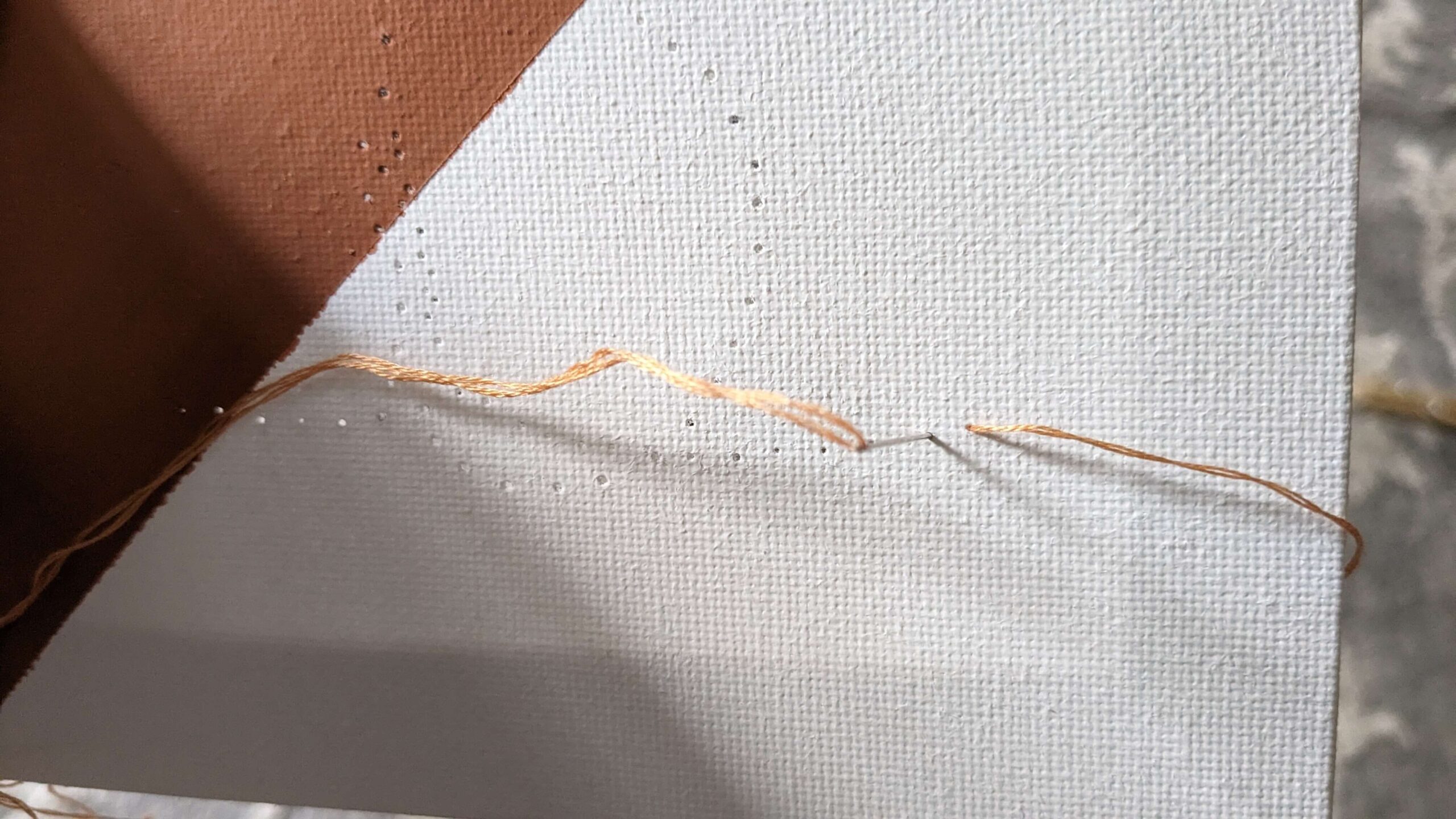 Before threading the needle, I took the embroidery floss and measured the length a little bit longer than my arm. I probably didn’t need so much, but I didn’t want to have to rethread for the one side. I chose to do the orange thread on the white side of the canvas first. There were six pieces of string wrapped up in the embroidery floss, I separated them and threaded a sewing needle with two of them, I did not pull it the whole way through, I just folded it over long enough that it wouldn’t fall out of the needle. I then double-knotted the end of the two strings.