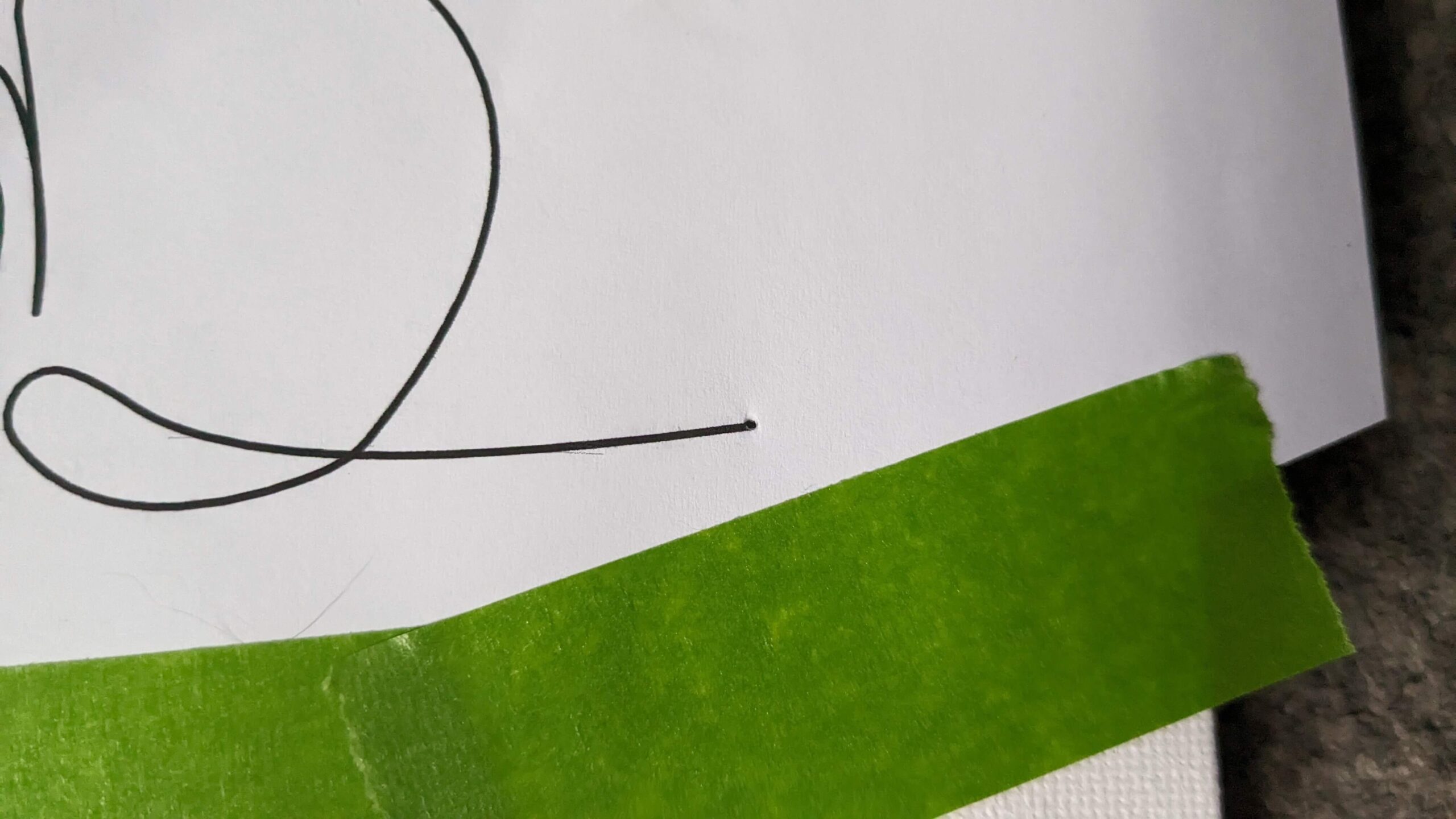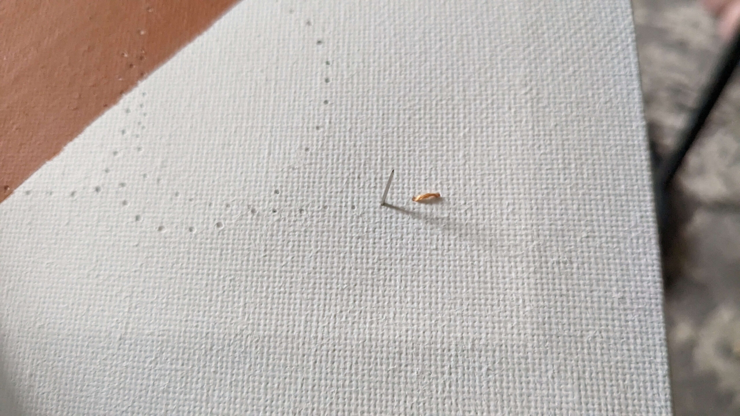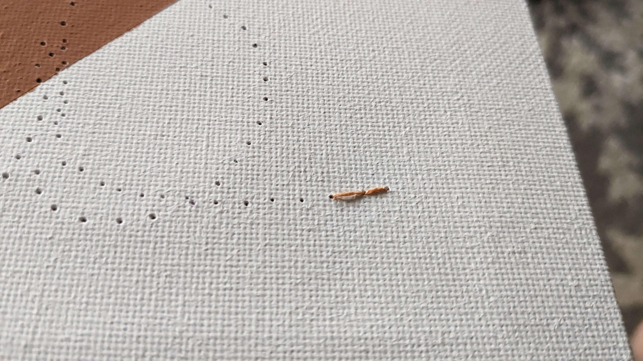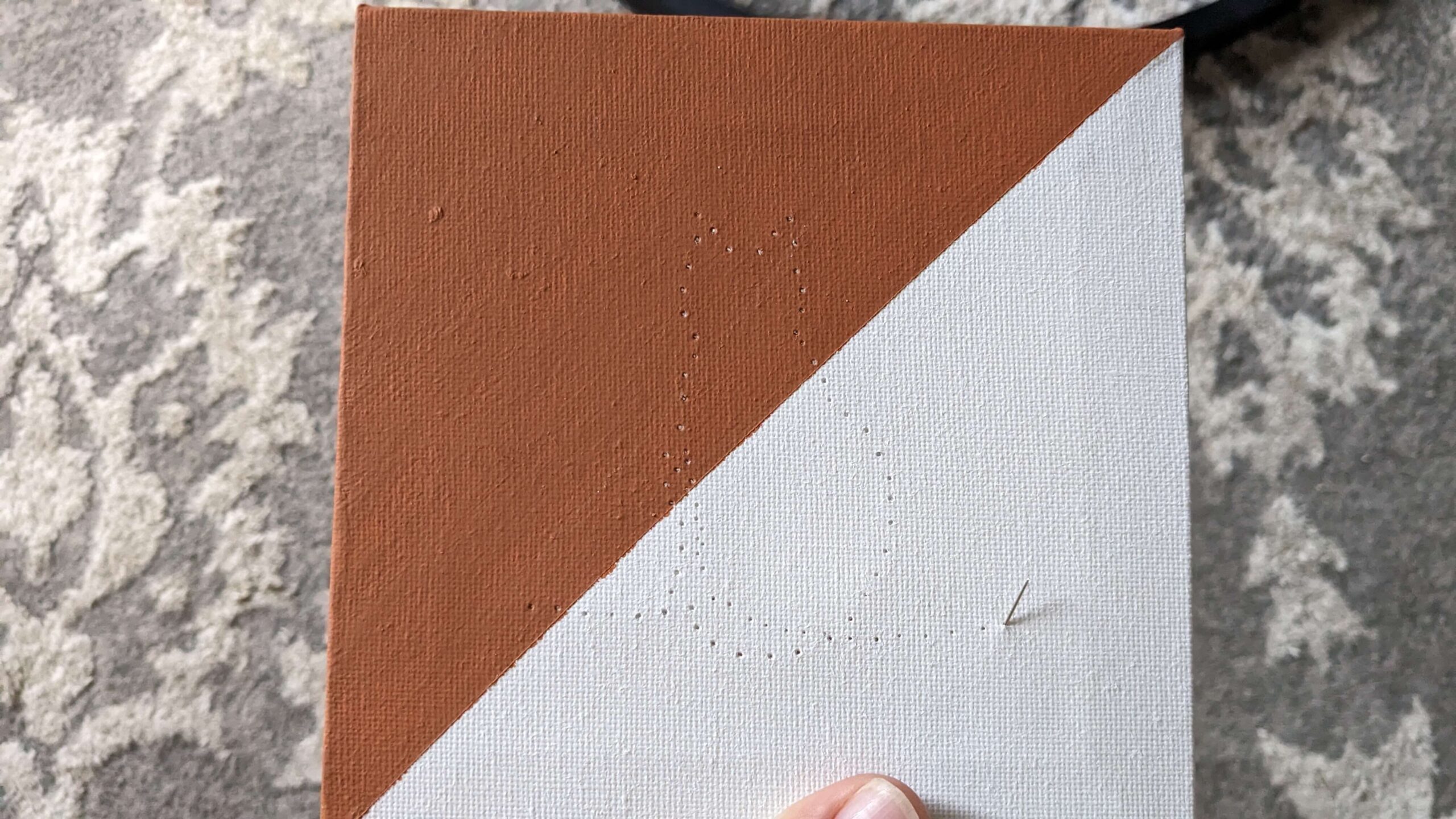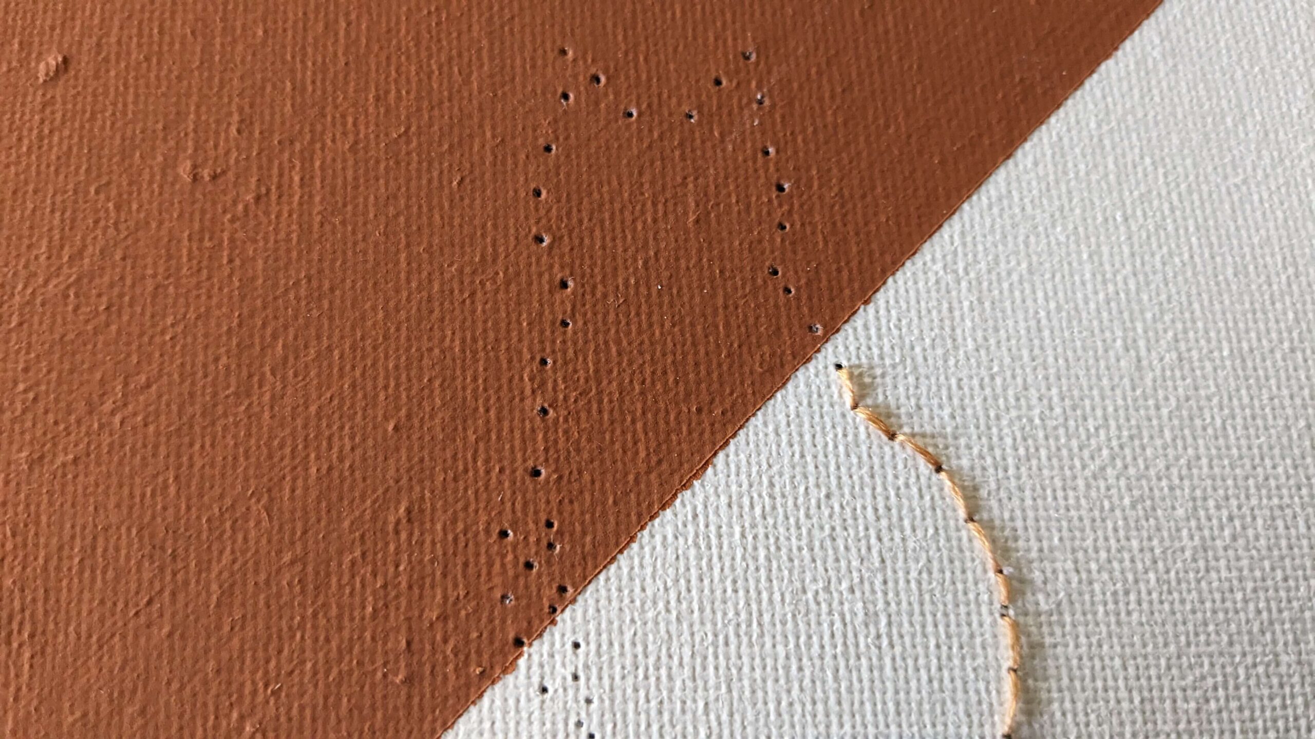 When I used the push pin to create my outline, I could not completely clearly see where the line of the color change was. I had to be aware of this while threading because the colors have to change on the line. To do this, wherever I saw that there was a line of holes for embroidery to thread through but the line would be interrupted by a gap across the line, I would just thread an extra hole in the middle of the color change. (See pictures below)