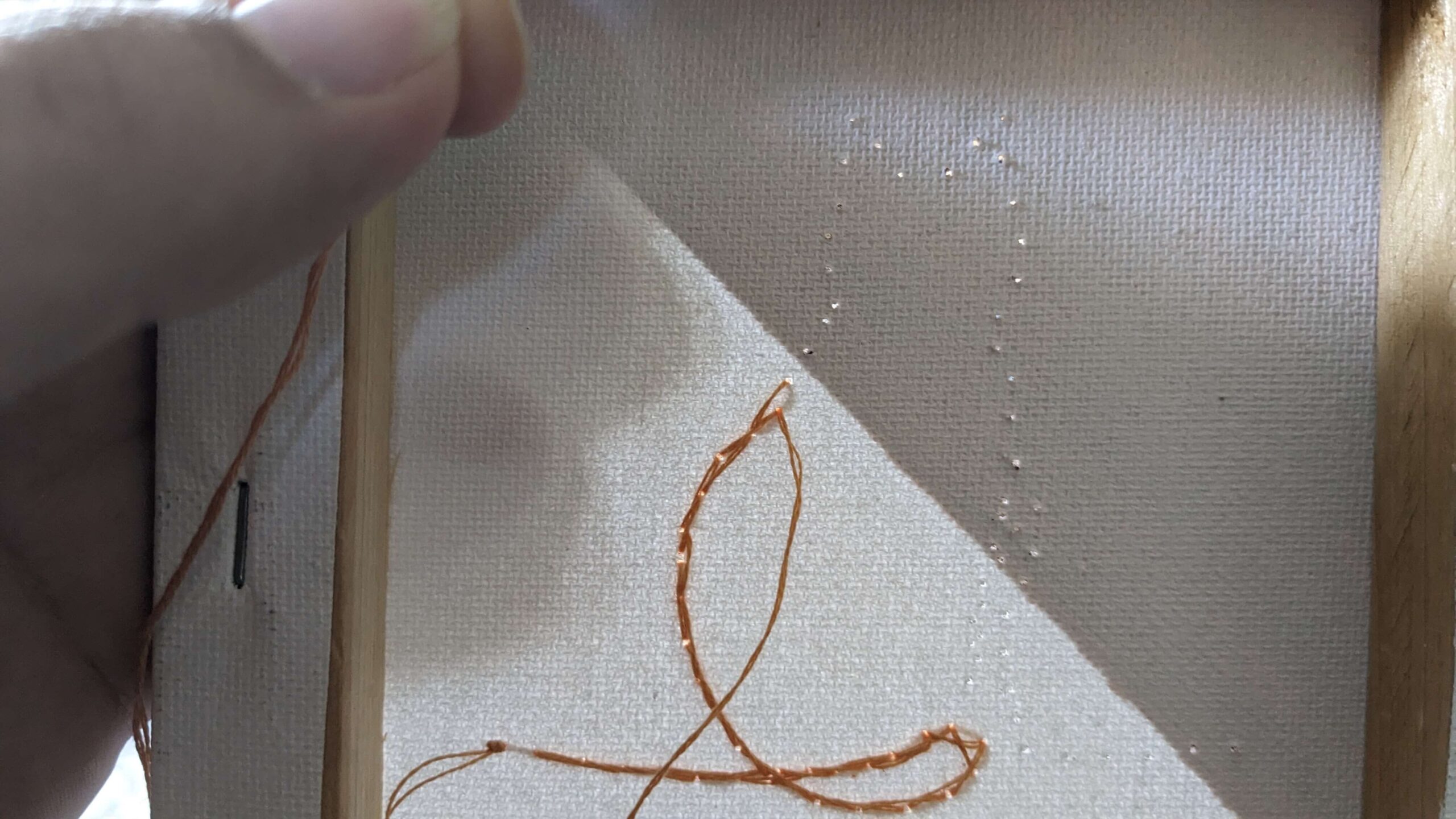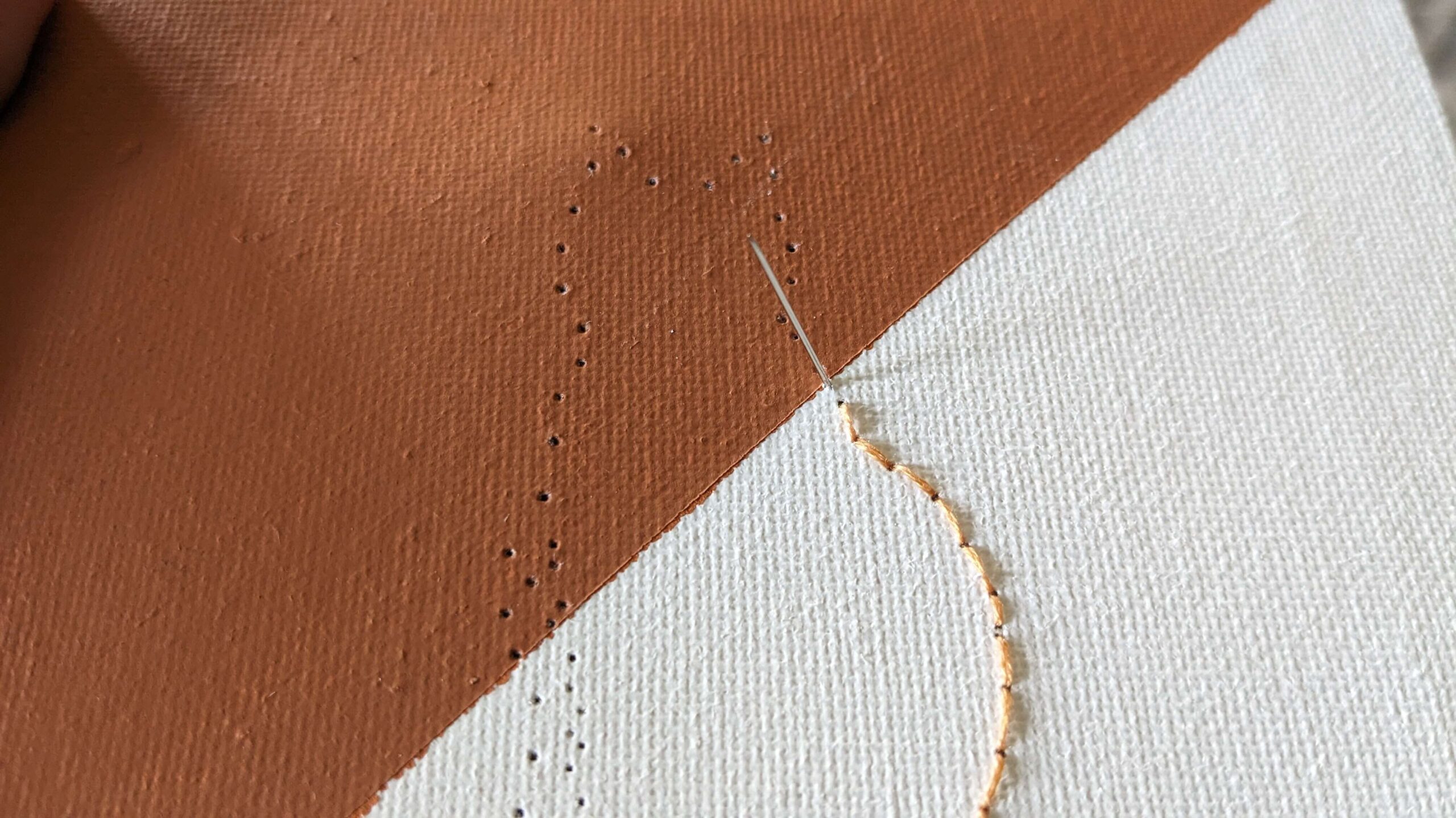 Threading the painted side is more complicated because it’s harder to feel/see the needle from behind so I spent a lot of time looking front and back before pulling the needle through. I embroidered this side the exact same way as the other side. The only thing of note is that where the two colors meet, I had an orange and white thread coming out of one hole (see picture).