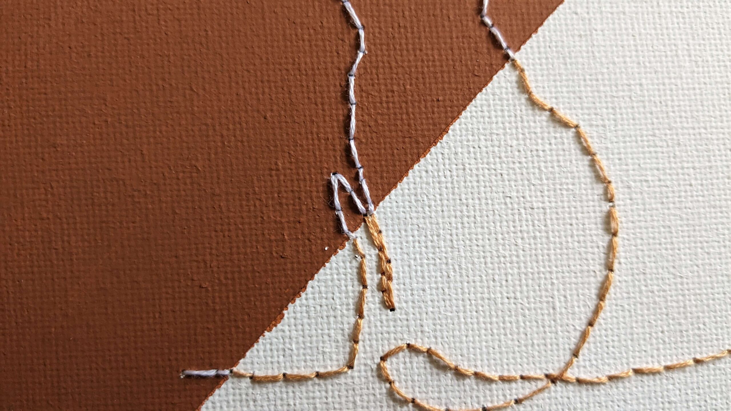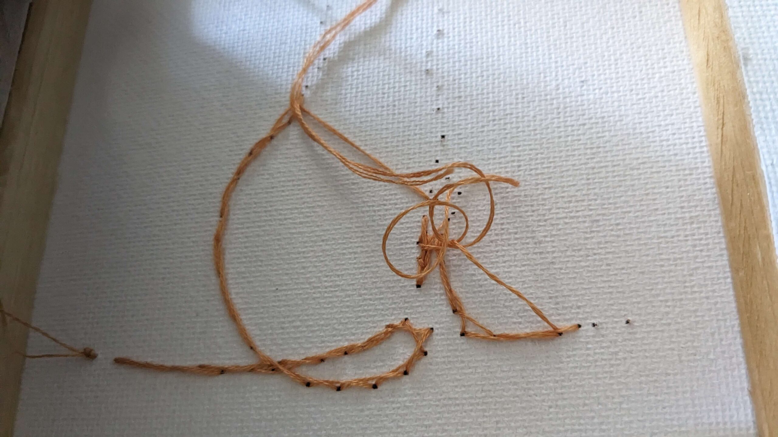 Referencing the punctured cat line art photo while embroidering this was key to my success. It ensured that I did not create any extra lines of embroidery over the top. When I reached where the orange paint started on the right side of the embroidery, I just backtracked into the hole behind the last one and then brought my needle over the left side of the embroidery and continued in the direction. When I was done with the orange thread, I tied it off and then started the process with the white thread on the orange side.