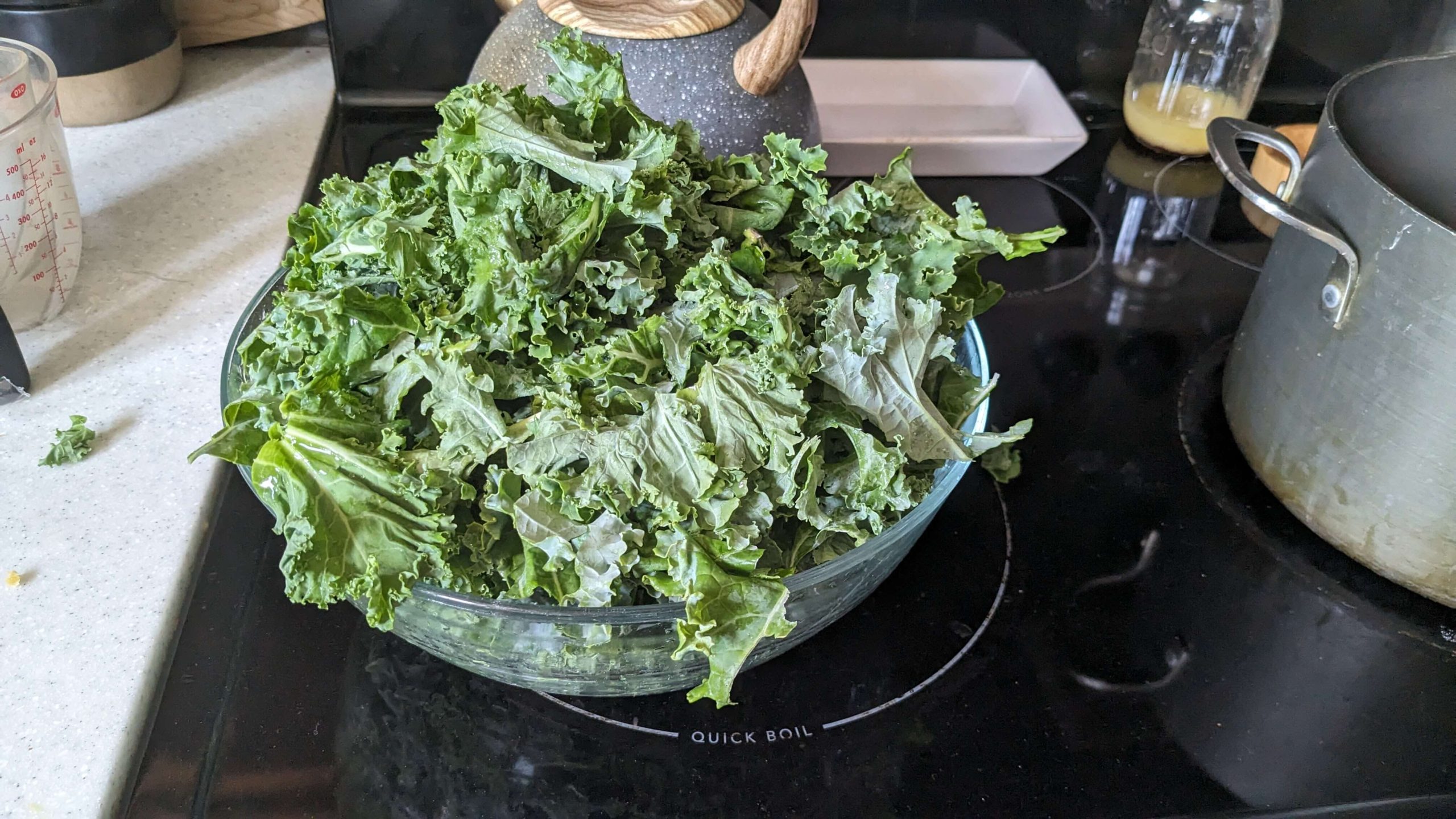 In order to do this, I set up a large pot of water and brought it to a boil. Then next to my pot, I had a bowl of ice that I then filled with water.a bowl of raw kale next to a pot with a lid on it on the stove next to a bowl of ice