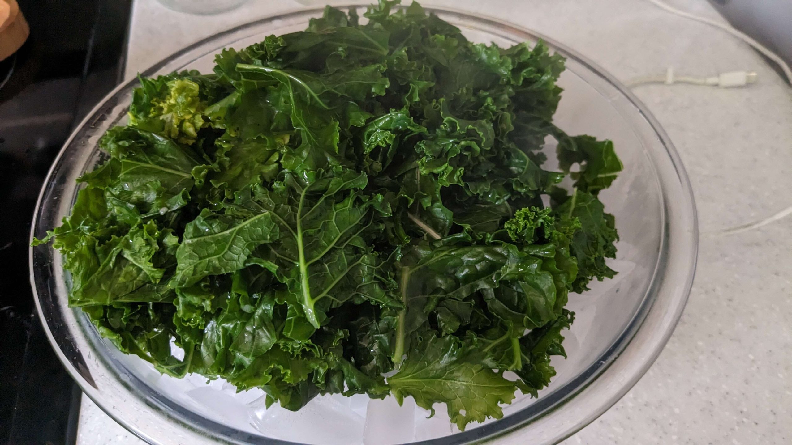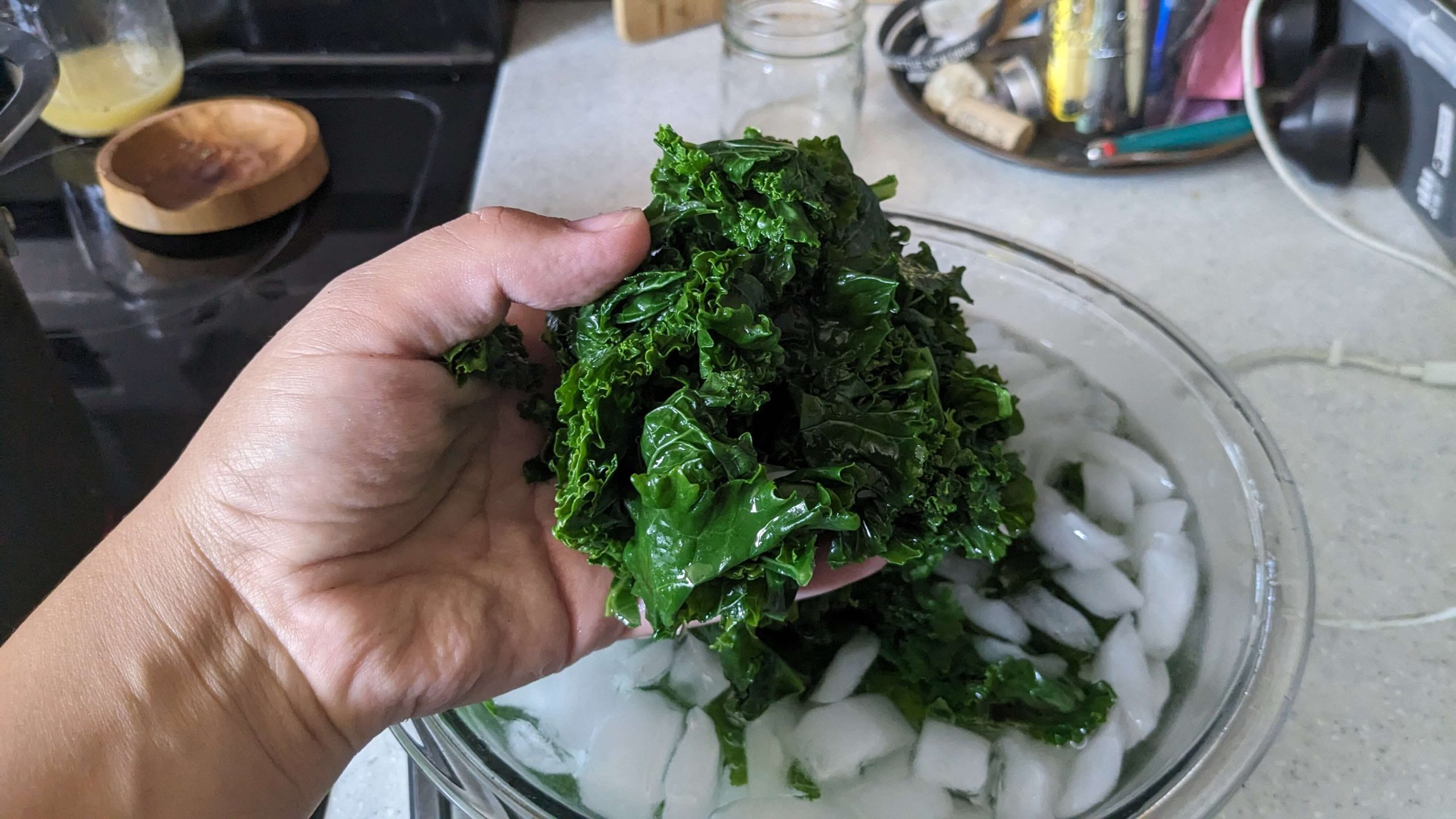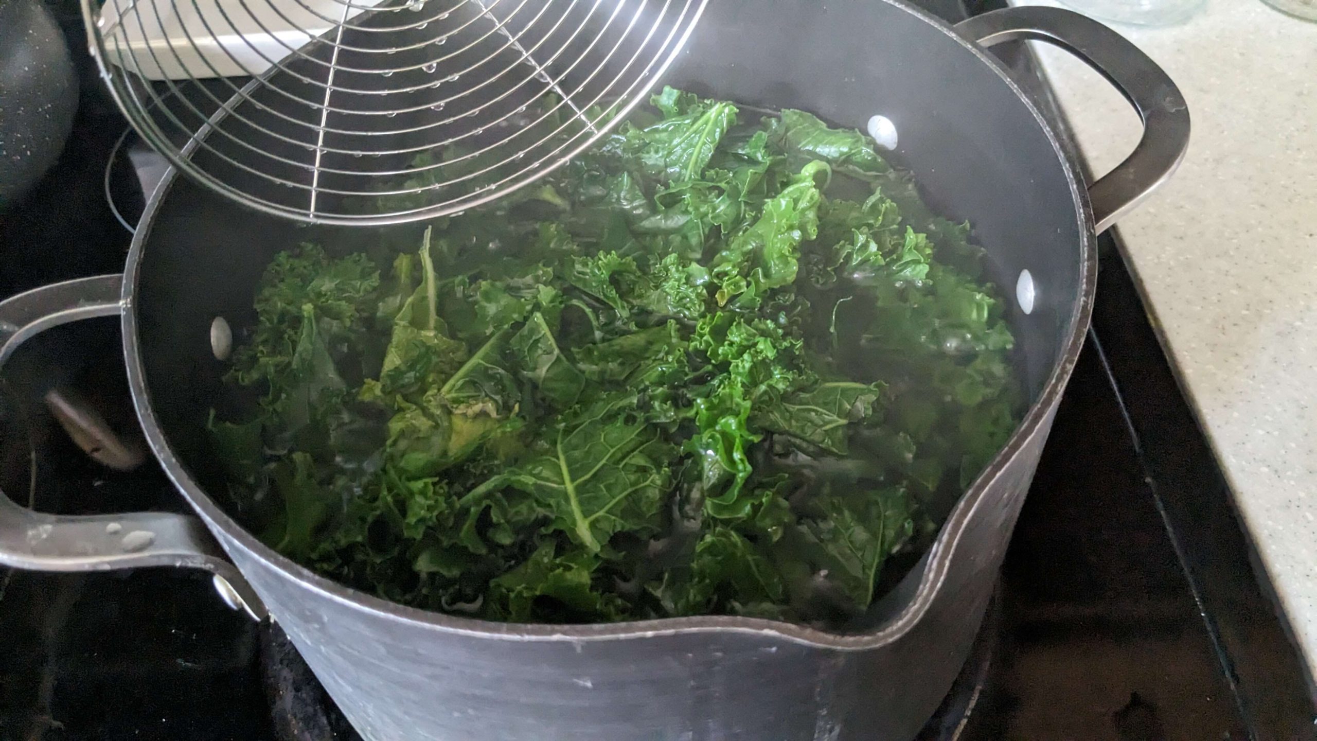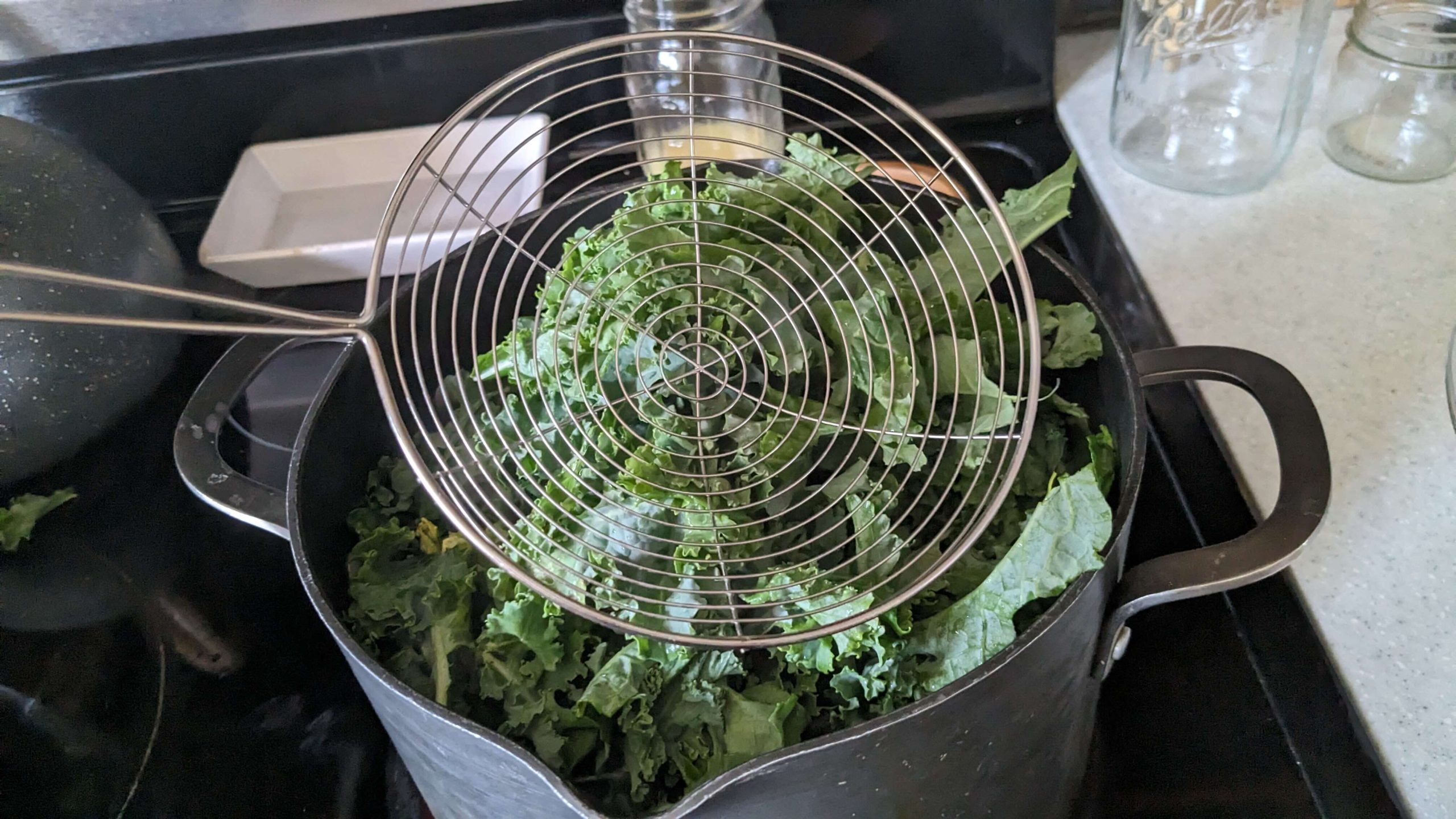 I put the kale in batches in the boiling water for 2 to 3 minutes until it was bright green, and when it was ready, I fished it out using a spider strainer that is typically used for frying food, and placed in the ice bath. Then I pulled the kale out of the ice bath once it was sufficiently cold. I repeated this several times until I was through the entire batch of kale.