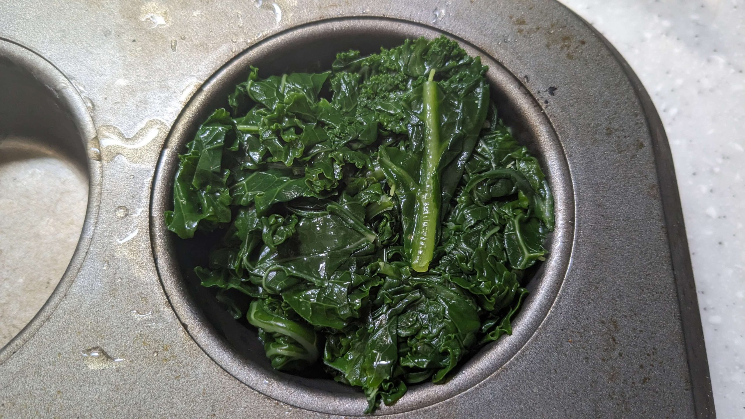When I pulled the kale out of the ice bath, I placed it on a clean dish towel, you could use paper towels if you would like, but you would go through a lot and I find that a dish towel works really well. I worked in smaller batches again and thoroughly squeezed out excess water and then pushed the kale into a muffin tin. This is a regular-size muffin tin and it held probably the equivalent of about a half cup of blanched kale.