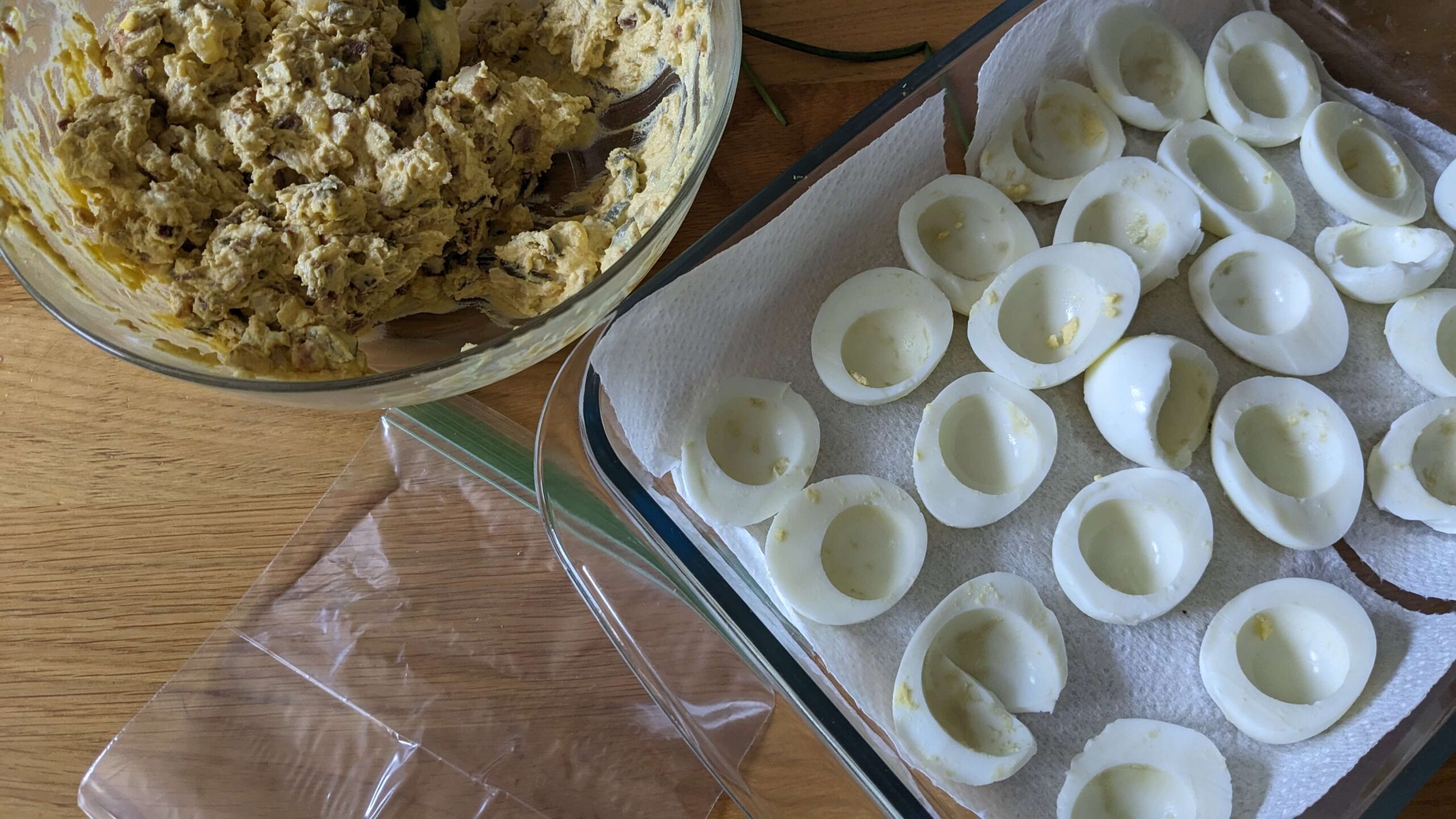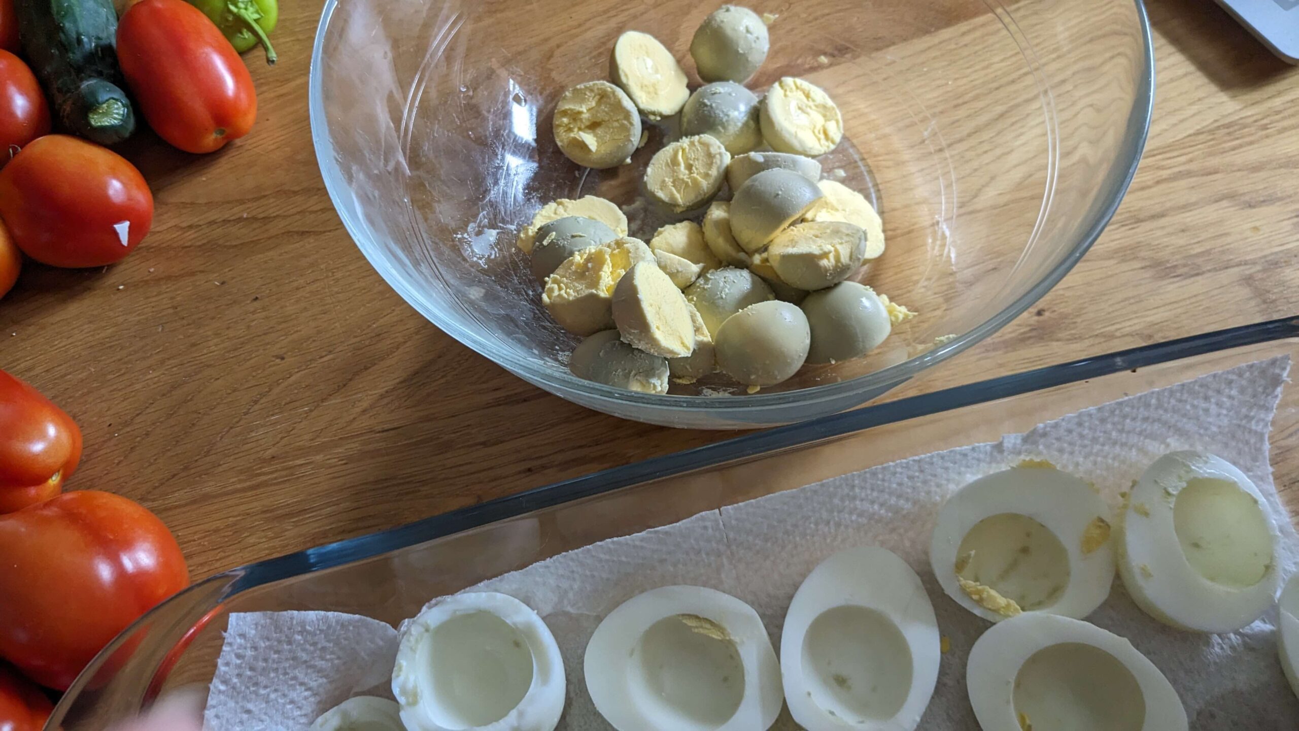 1. Hardboil one dozen eggs. (I place a dozen eggs in a pot of water and bring the water to a boil over high heat. Once at a rolling boil, I turn off the burner and set a ten-minute timer. After the ten minutes is up, I place the eggs in an ice bath to stop the cooking process.)