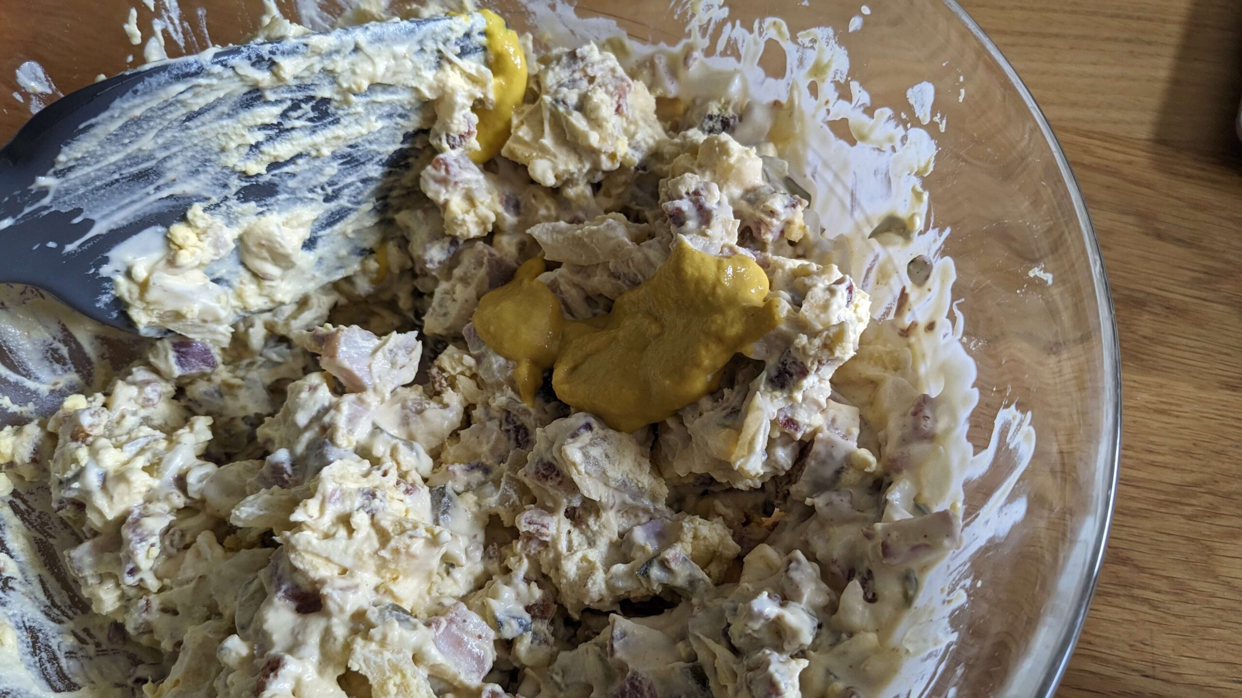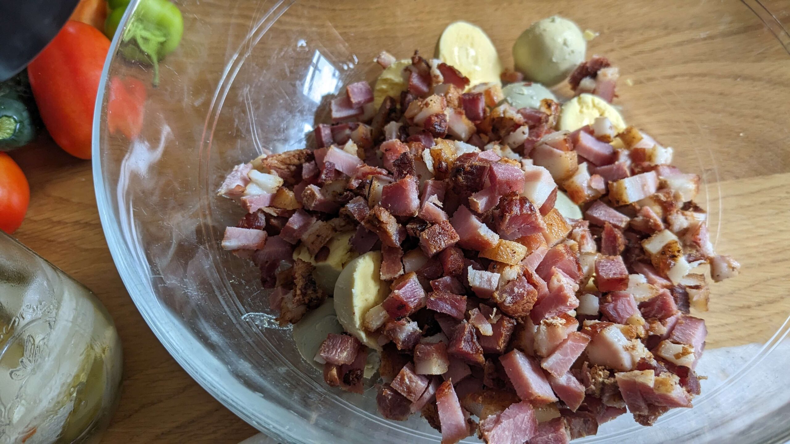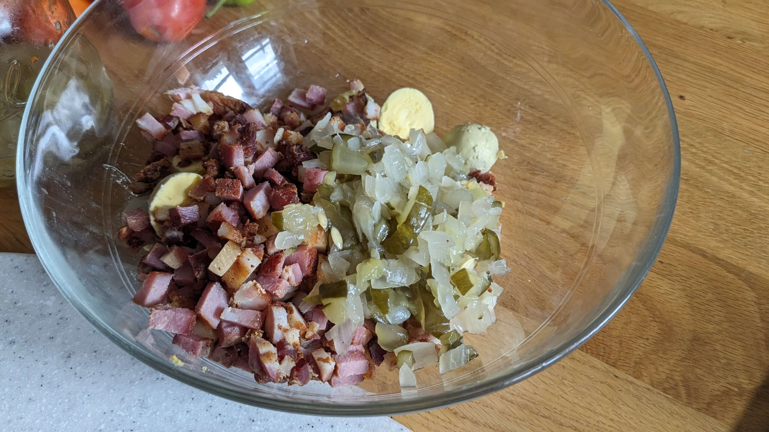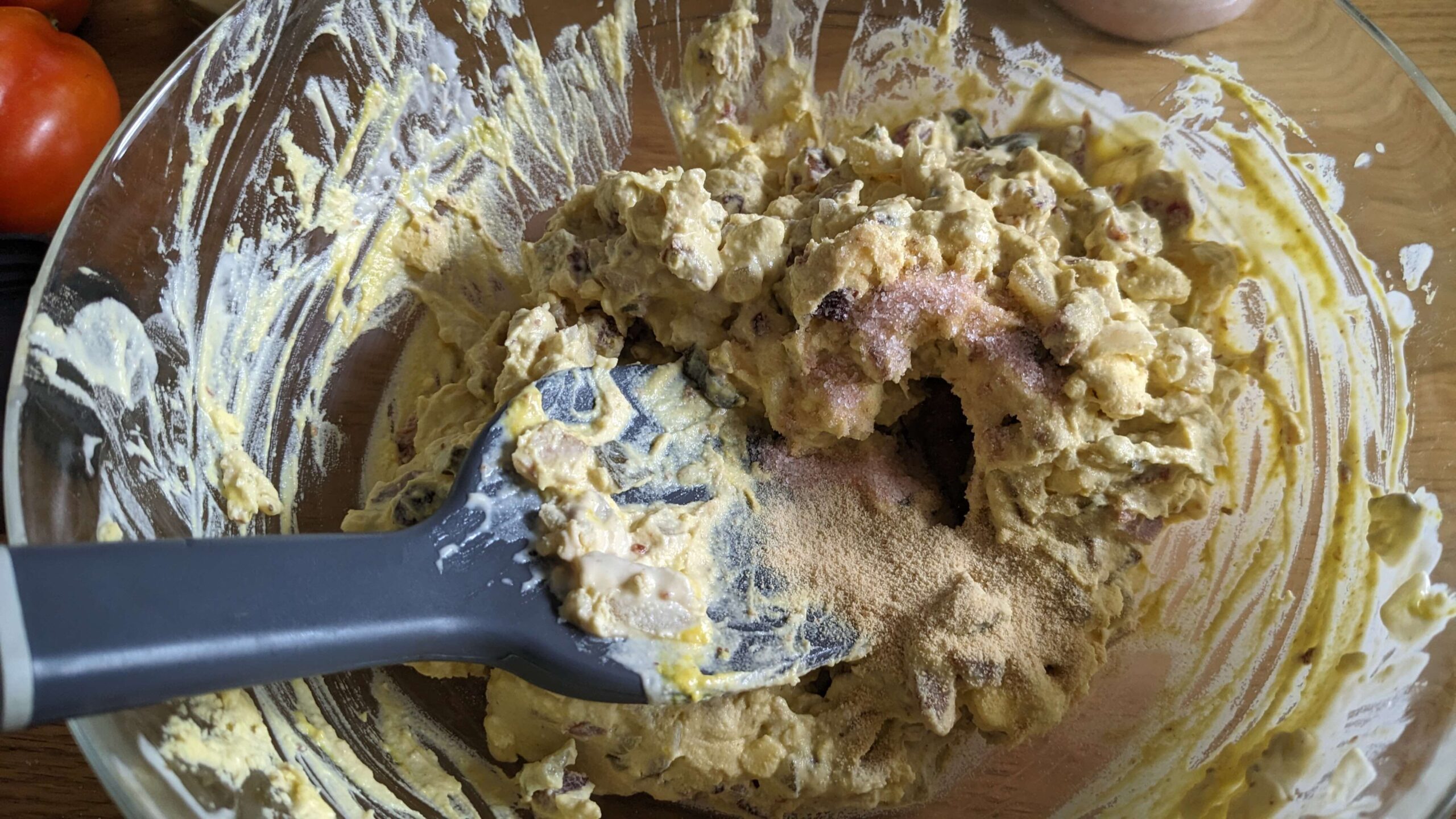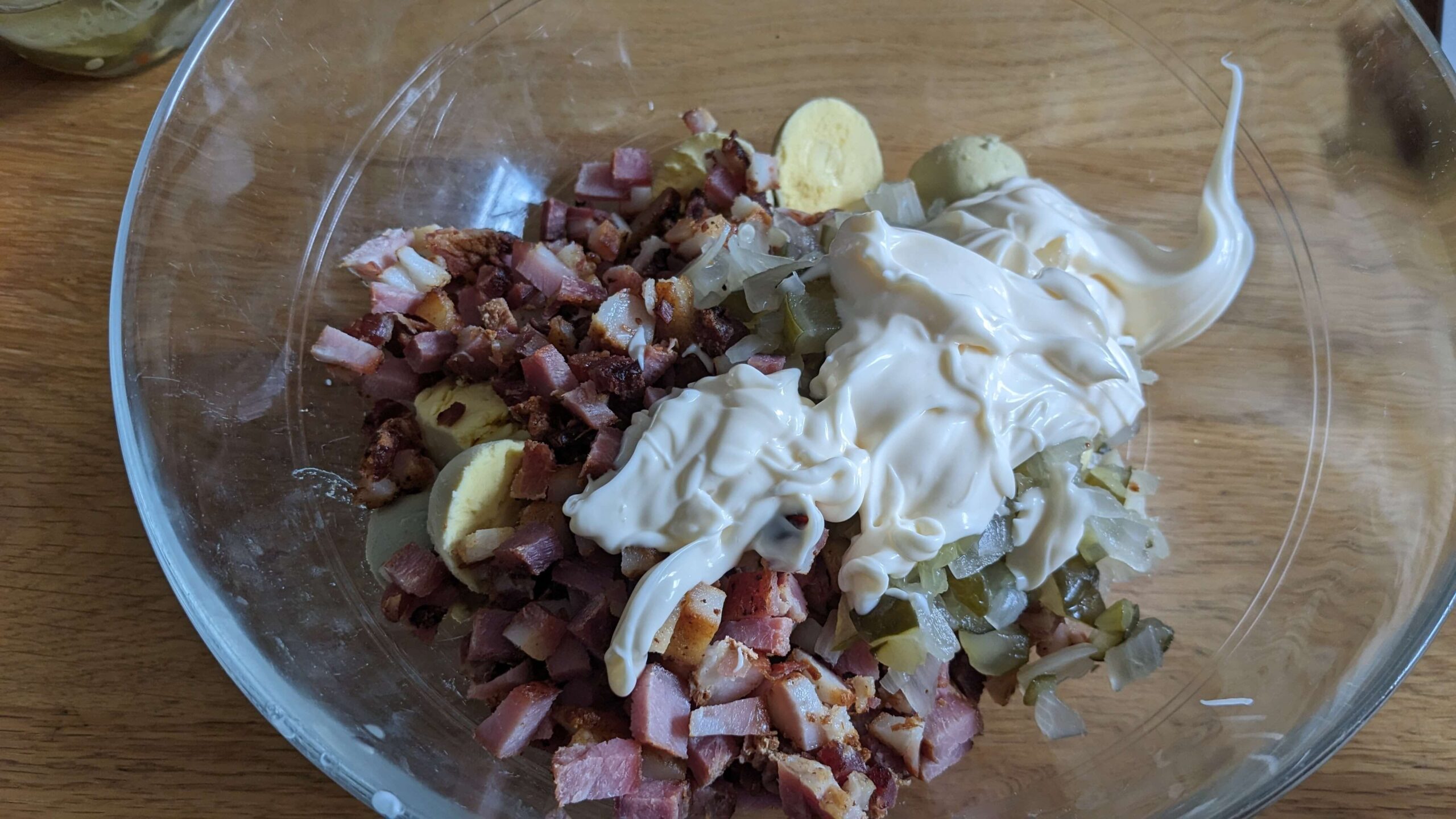 Finely chop one cup of bacon and one cup of pickled vegetables. I used my own homemade pickles which had onions in it as well. You can use any bacon you want, I was using “seconds”, which is just the bacon slices that were too thick or uneven or poorly cut. Add to the bowl with the egg yokes.