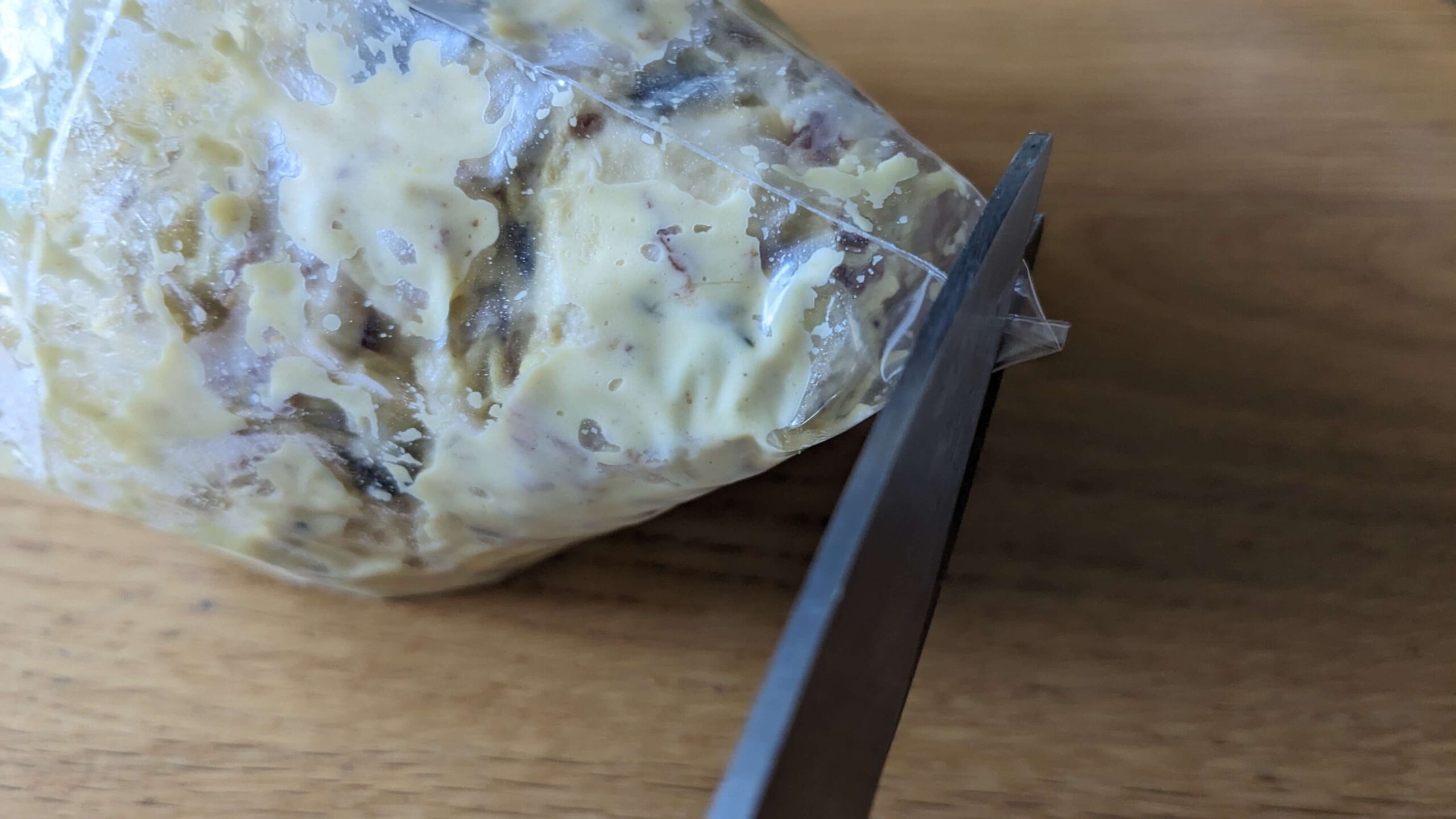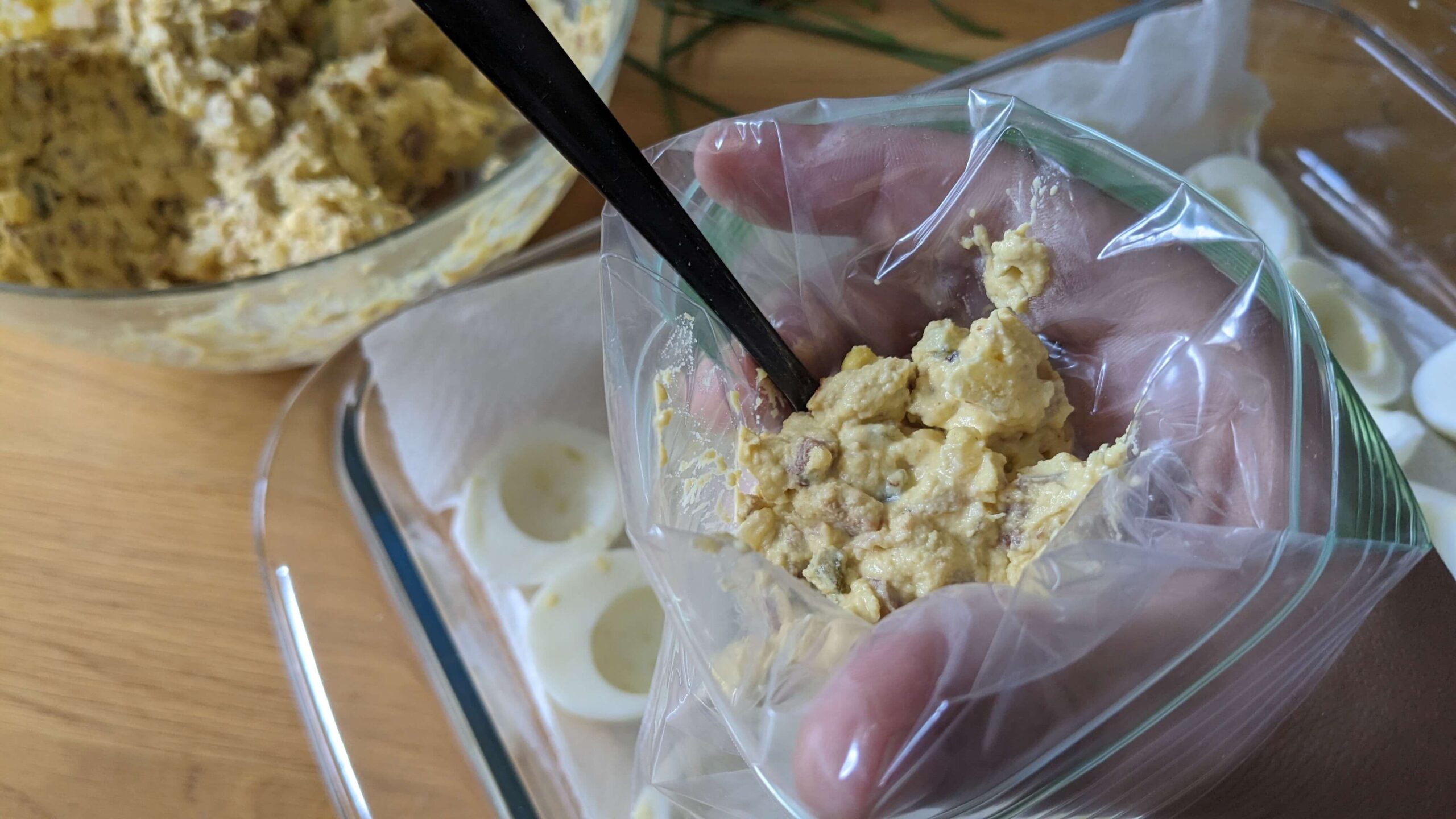 5. Fill a ziplock bag or piping bag with the yoke mixture and zip shut. Cut the corner off the end of the bag and pipe into each hardboiled egg white half. Alternatively, you can just use a spoon. I use the ziplock bag to make a cleaner-looking deviled egg.