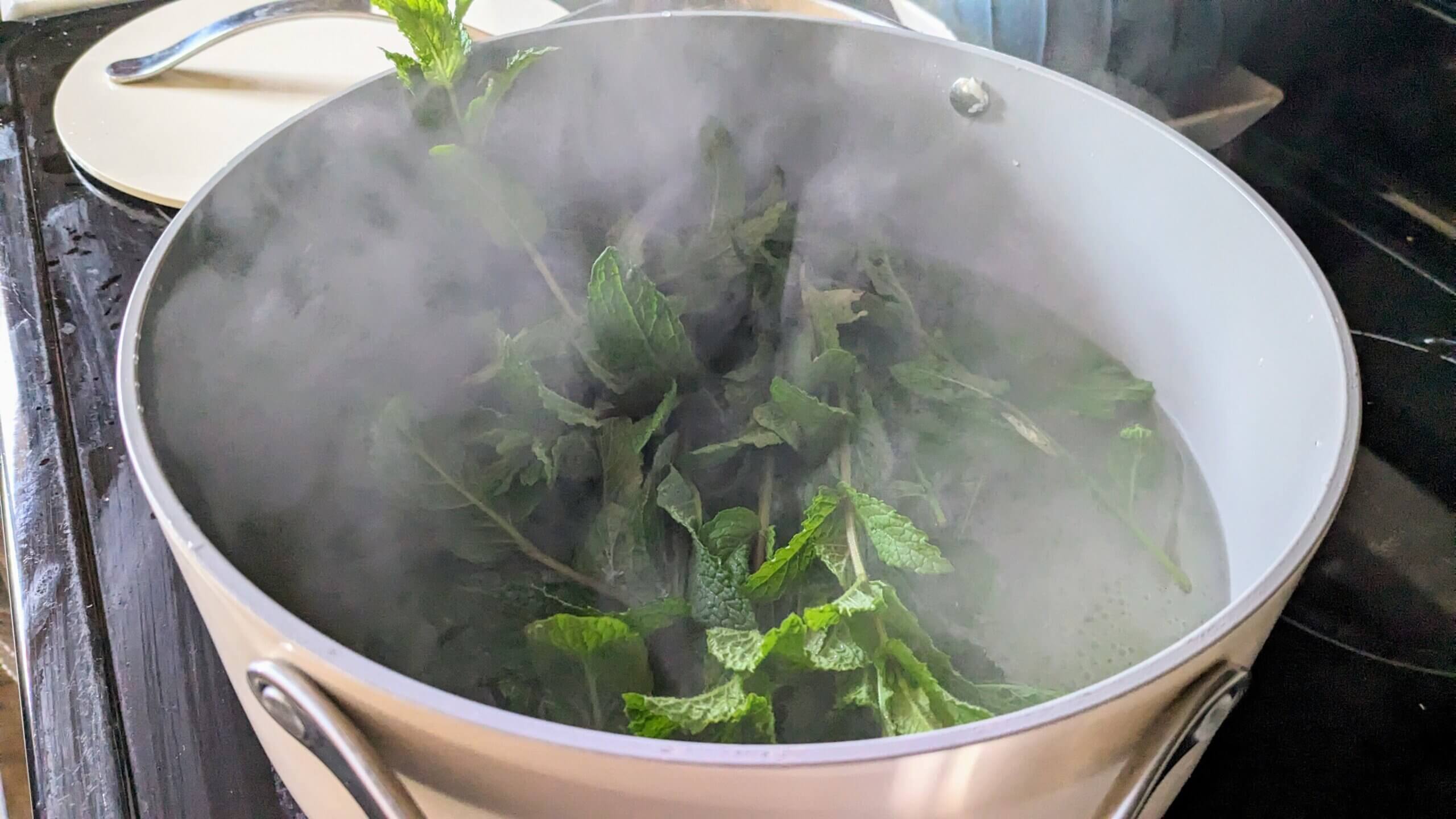 - Let steep for 10 minutes. Once steeped, remove all the mint leaves using tongs or a strainer.