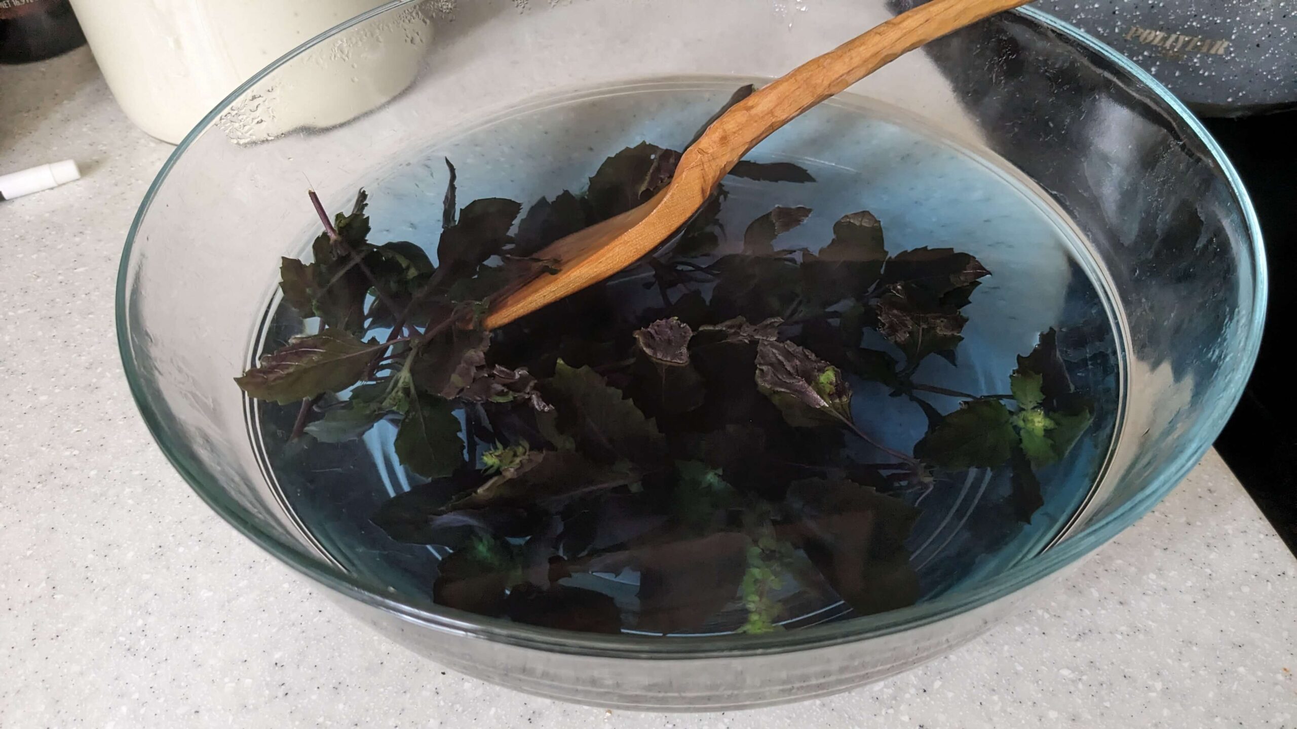 Once at a boil, turn off the heat and add 1 oz or approximately 1 packed cup of rinsed purple basil to the water. I weighed how much basil I use because the measurement for a cup of fresh herbs doesn’t feel like it matches the weight. If you have a scale, I highly recommend using it to measure. As you make this recipe, you can increase or decrease the quantity of basil that you use to suit your taste.