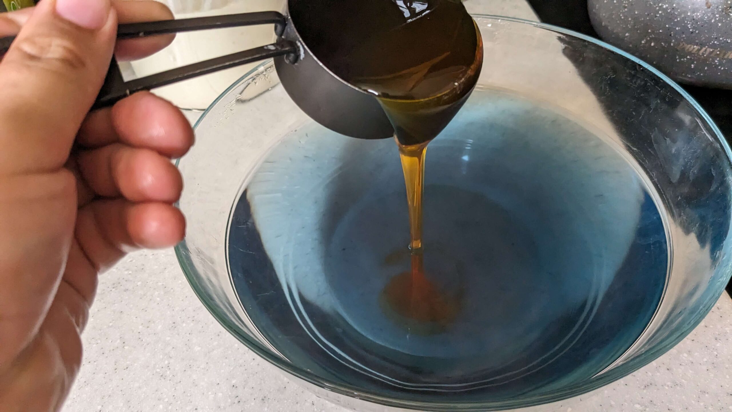 5. Pour ½ cup honey to the still warm tea, stirring to incorporate. Your blue tinted tea will turn to a gold or pink hued drink.