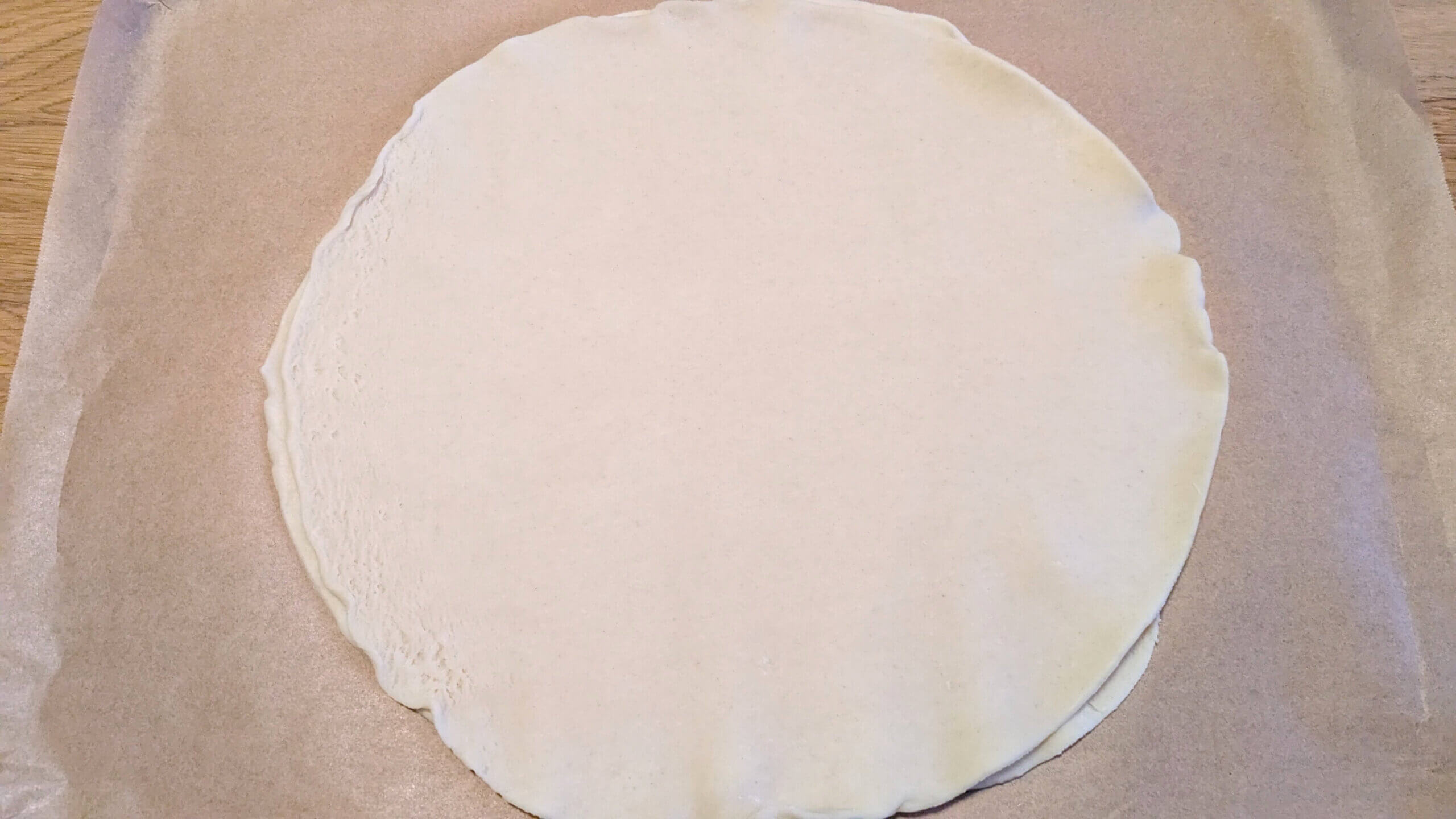 - Stack the two pie crusts on top of each other and using the rolling pin, roll the crusts together into a rectangular shape that will fit the baking sheet. You can roll the crust on the parchment paper to make it easier.