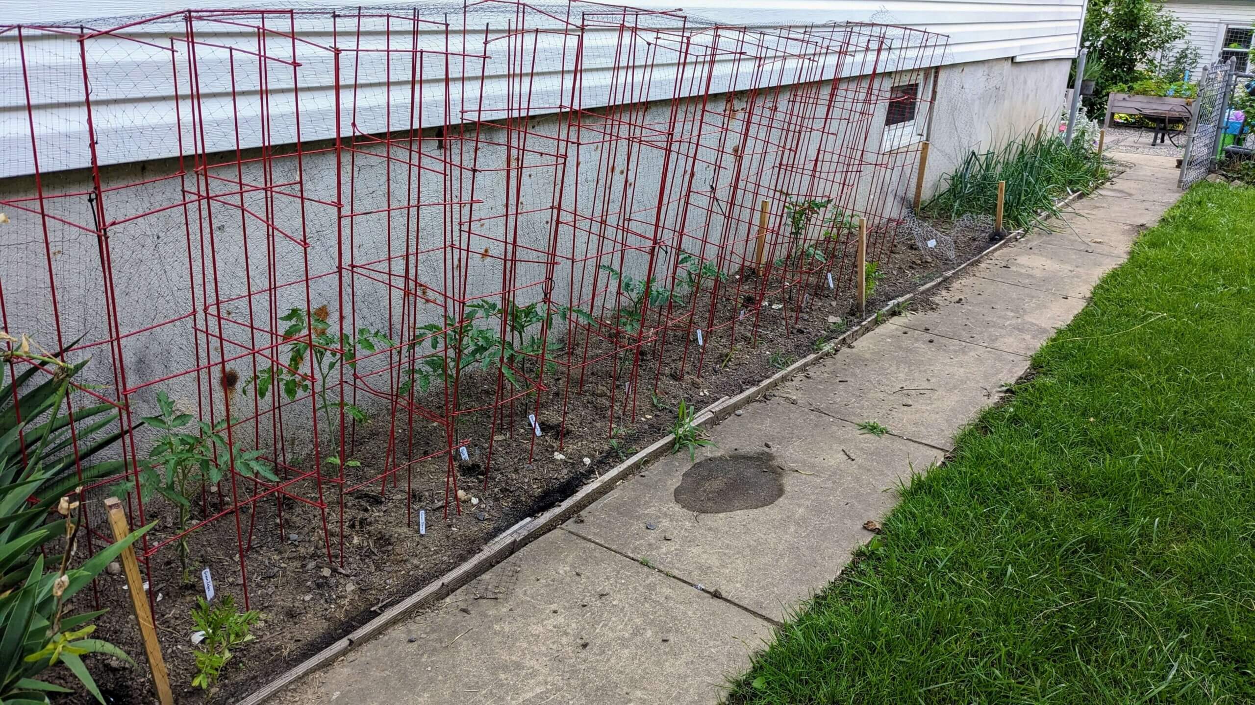 This side garden is pretty new this year. Along the entire span of the side of the house I originally had ripped up grass and planted irises. Last year we ripped out enough irises to make room for four tomato plants but this year we took out even more for space for vegetables. We did amend the soil with a lot of compost at the beginning of the spring and I put more in when I planted so we are hopeful that it is a successful portion of the garden.