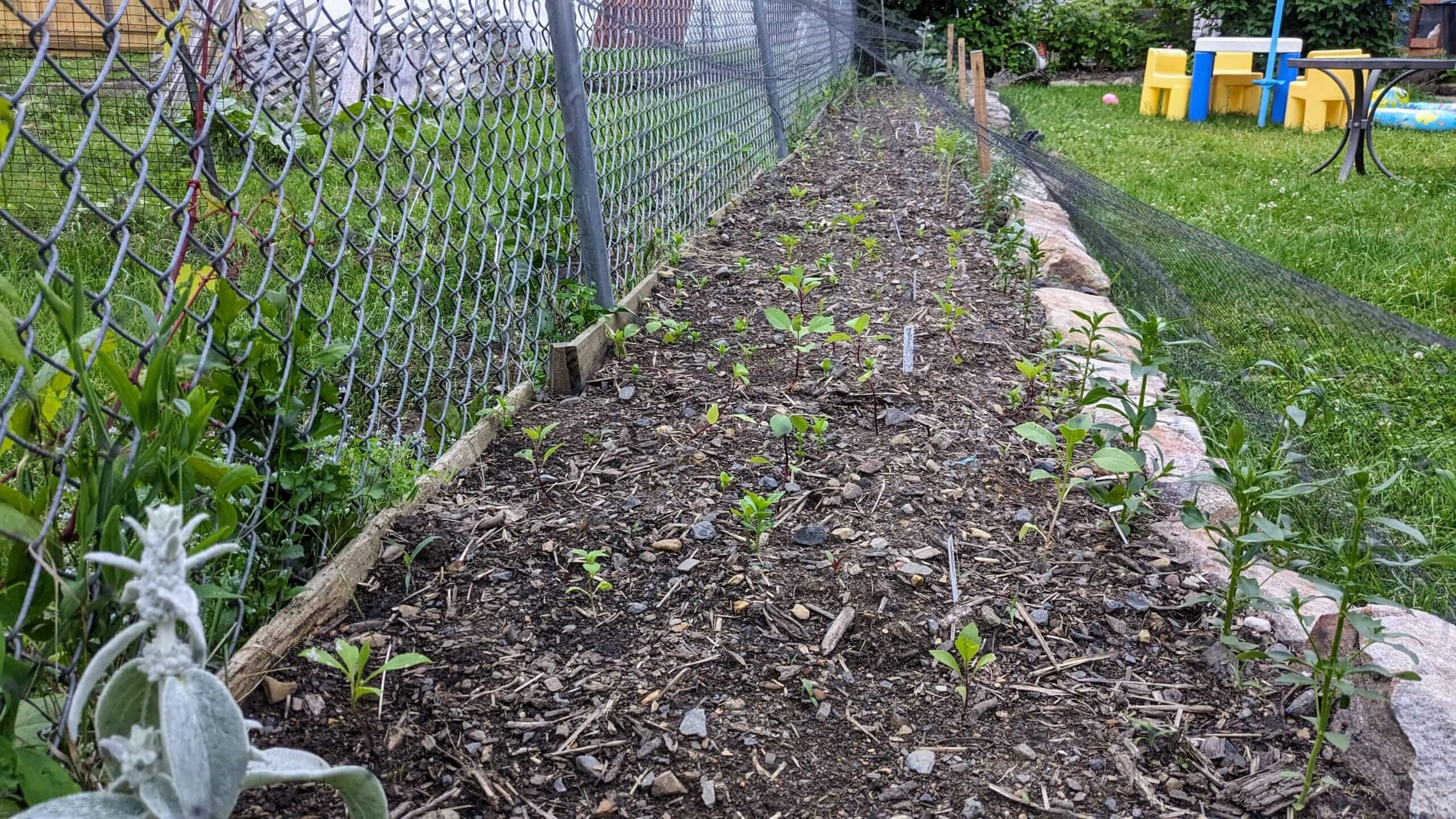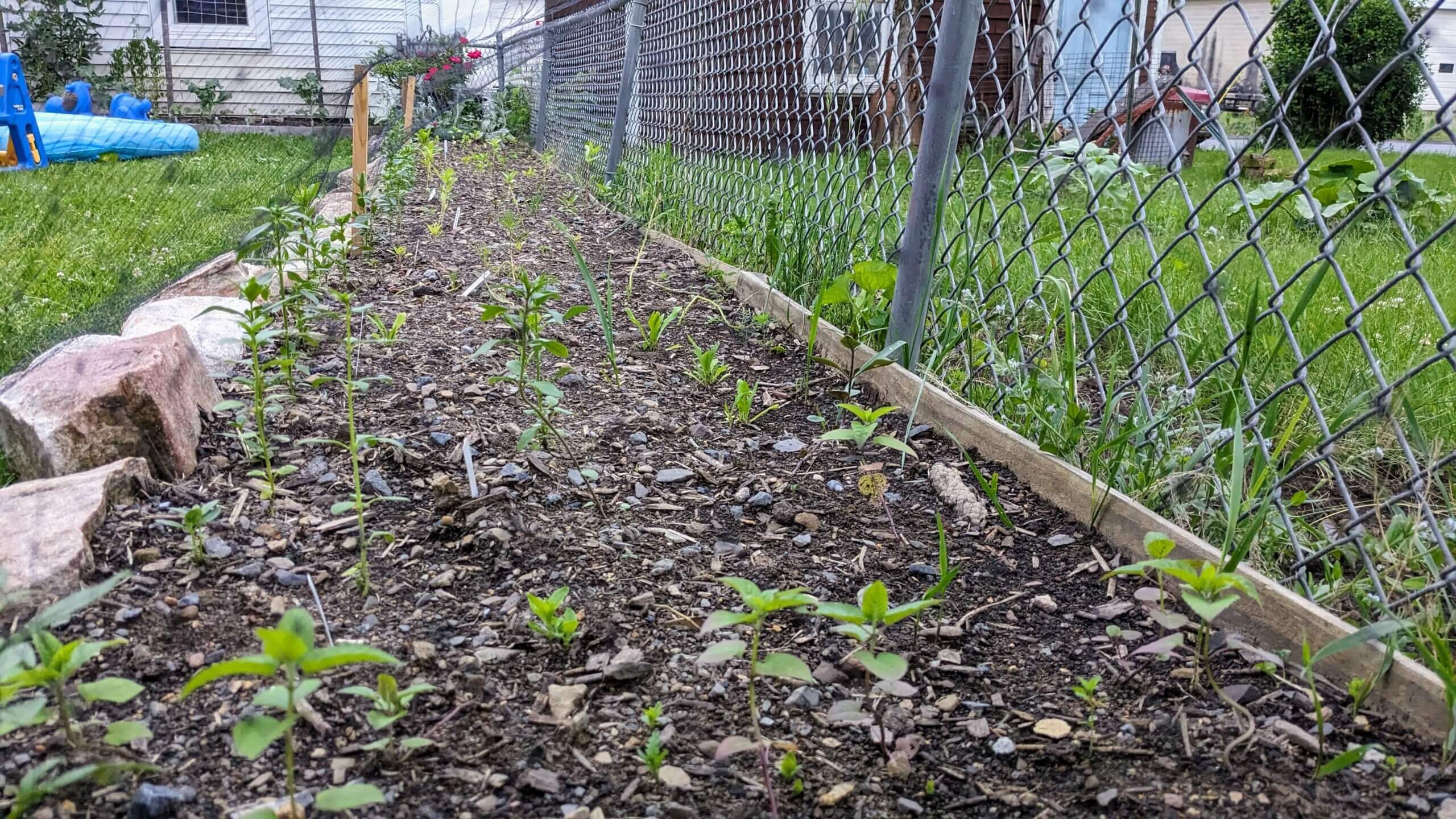 This flower garden takes up a lot of space in our yard and I know that it can be used for produce but I love having flowers that I can cut all summer. This year I was more diligent with my planning and I tried to organize the different varieties so that they could complement what was around them. Hopefully, I’ll see that as they grow! At the end of the garden is a rose bush, Lambs Ear, a singular Pink Elegance Lavender, and Dianthus. In the front of the whole bed, closest to the rocks, are snapdragons. I put those there because they should flower the soonest. Then, from the roses to the lilacs in order are Dinner Plate and Bee’s Choice Dahlias, Silver Strawflowers, Green Touch Amaranth, Peach Zinnias, Bell’s of Ireland, Gomphrena, Giant Zinnias, Autumn Touch Amaranth, White Cupcake Cosmos, Tall Mix Strawflowers, Beebalm, and Lillys.