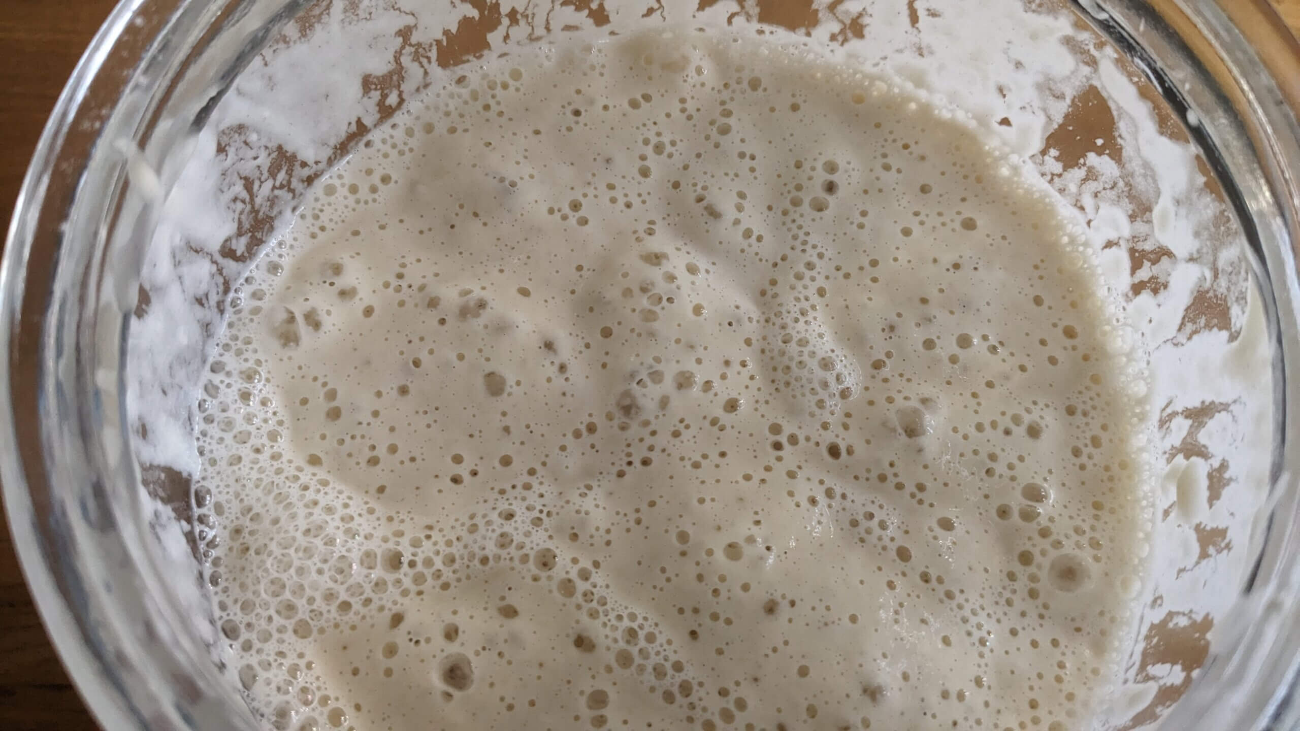 - Add 250-275 grams of active and bubbly starter to the bowl. Mix.