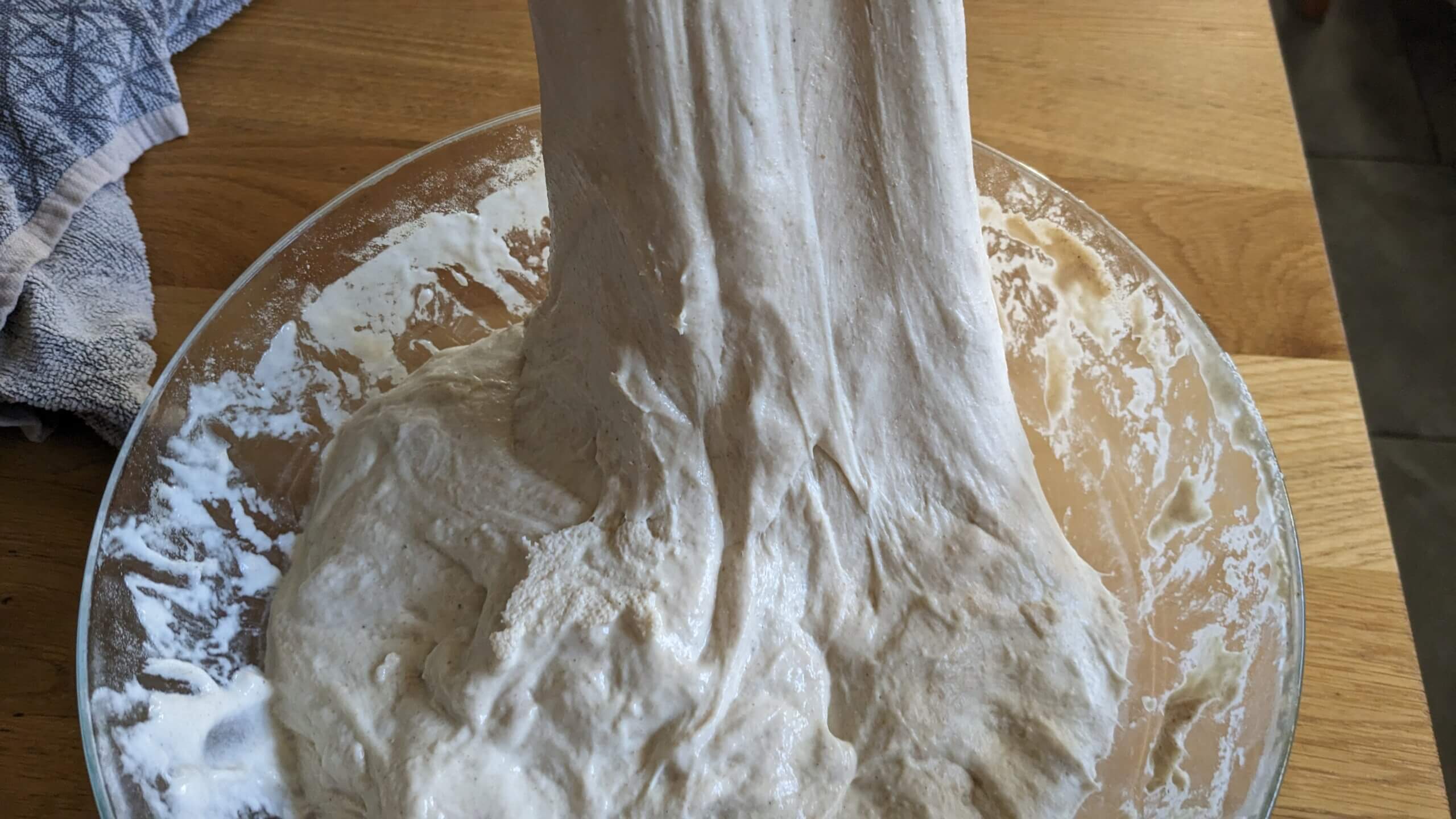 To do a stretch and fold, all that you do is with your hand or your whisk you start at the top of the bowl, pull the dough up (stretching it), and then fold it onto itself. Then do a 90° turn of the bowl and stretch the dough on top of itself again. You do this a total of four times until the dough has been pulled and folded on itself four times. If it’s a few more times than that that is fine. You will notice though as you keep going, the dough will become stiffer and less stretchy. This is the gluten developing. After this, cover the dough with the damp towel again (re-wet and wring out the towel if you need to). Repeat the series of stretches and folds about four times, waiting about 20 to 30 minutes in between.
