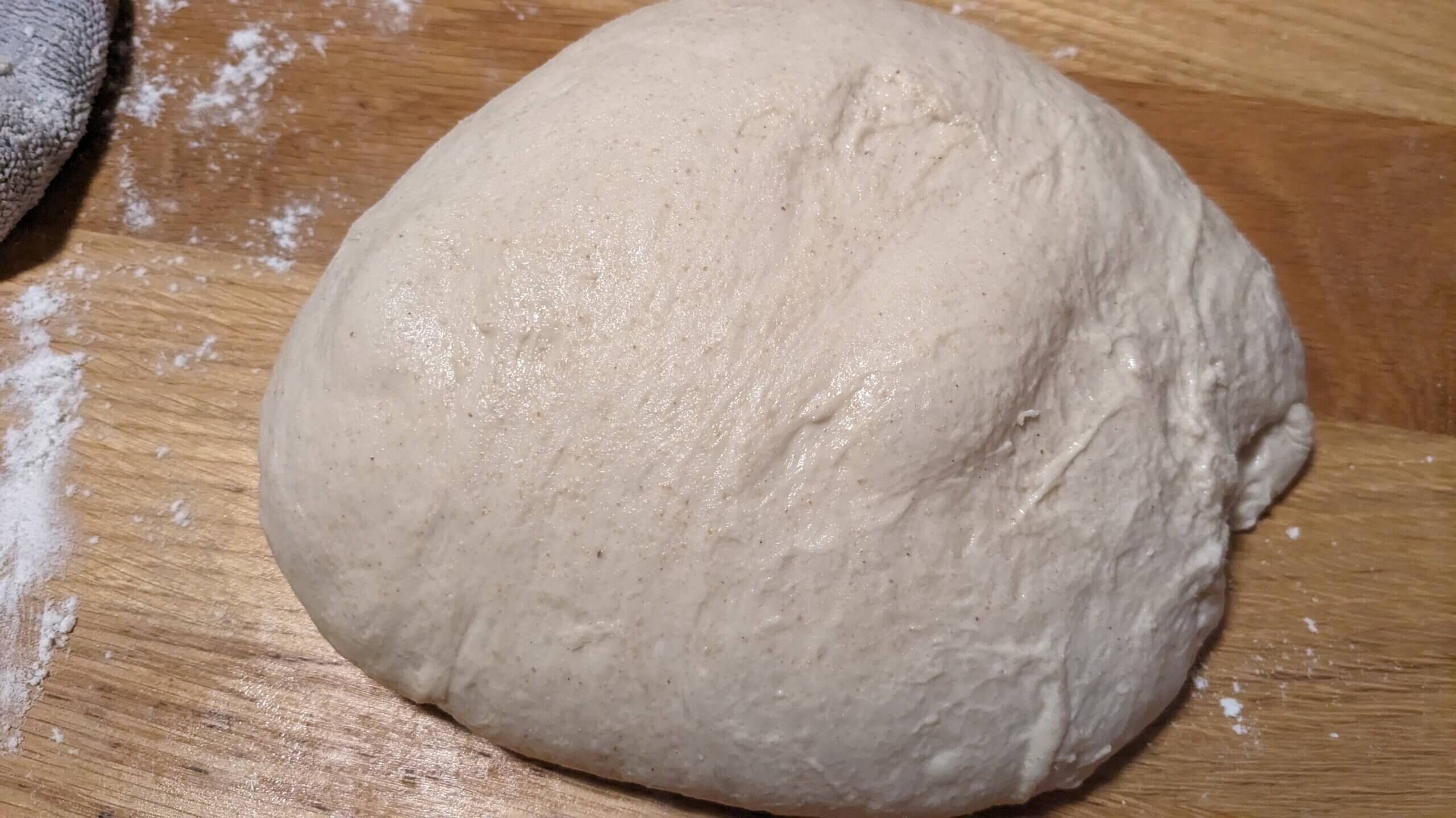 In the series of pictures above, you should be able to see at least a slight difference between each set of stretch and folds. However, when comparing a photo from the beginning and end, you can see a noticeable difference in the appearance of the dough. (See below)