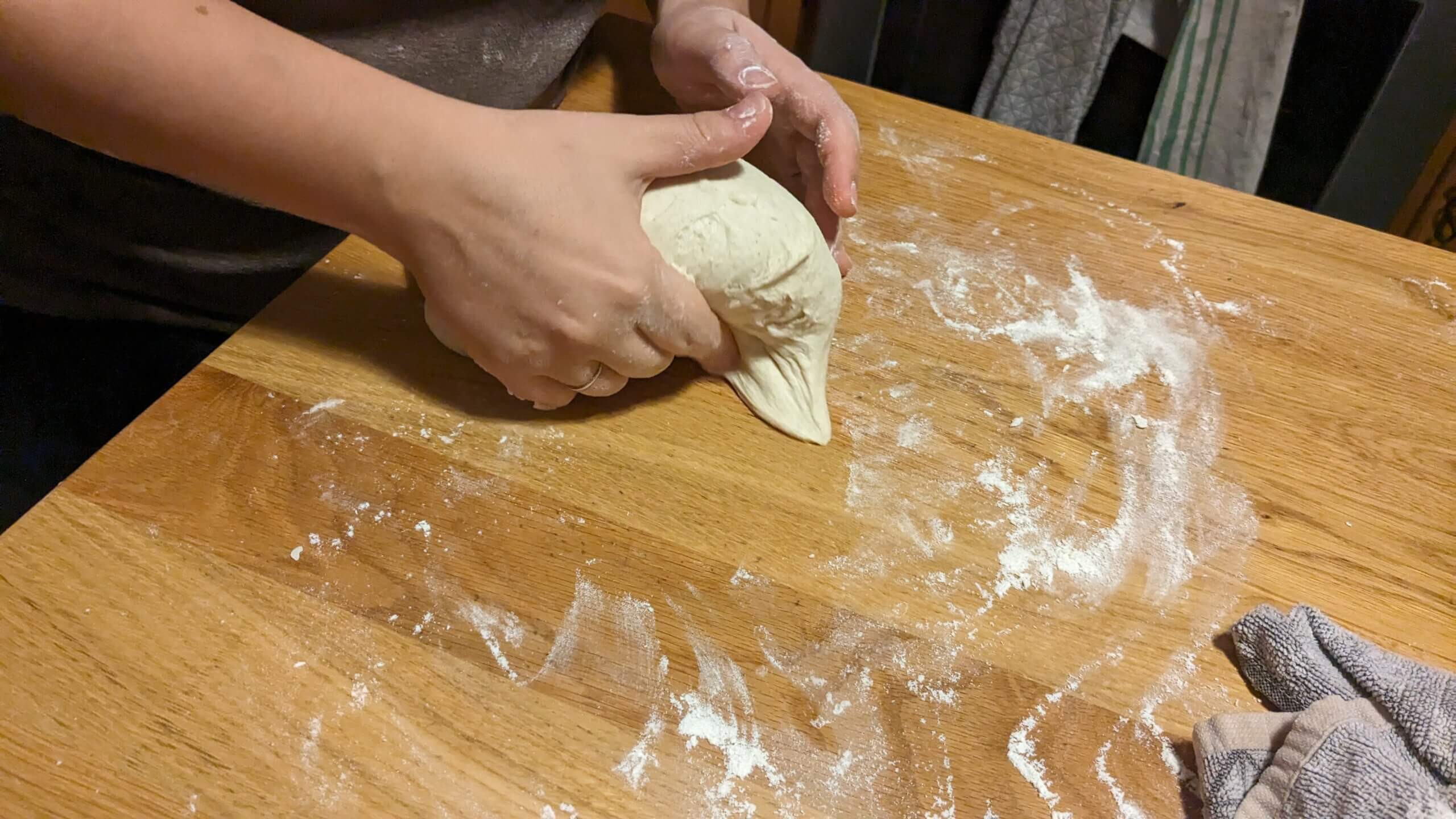 The goal is to create tension by pushing it and pulling it so it becomes tight on the top. I’m left-handed so if you want to follow these written instructions, just swap out the hands that you use. I will take the dough ball and push it forward with my left hand, and using my right hand on top, I will pull it back to me. I’ll turn it a little bit and then again, push it forward with my left hand and using my right hand I’ll pull it back which should make the tight top and get the round shape. I’ll do this about 5 to 10 times. you don’t want the dough to start getting sticky from being overworked.